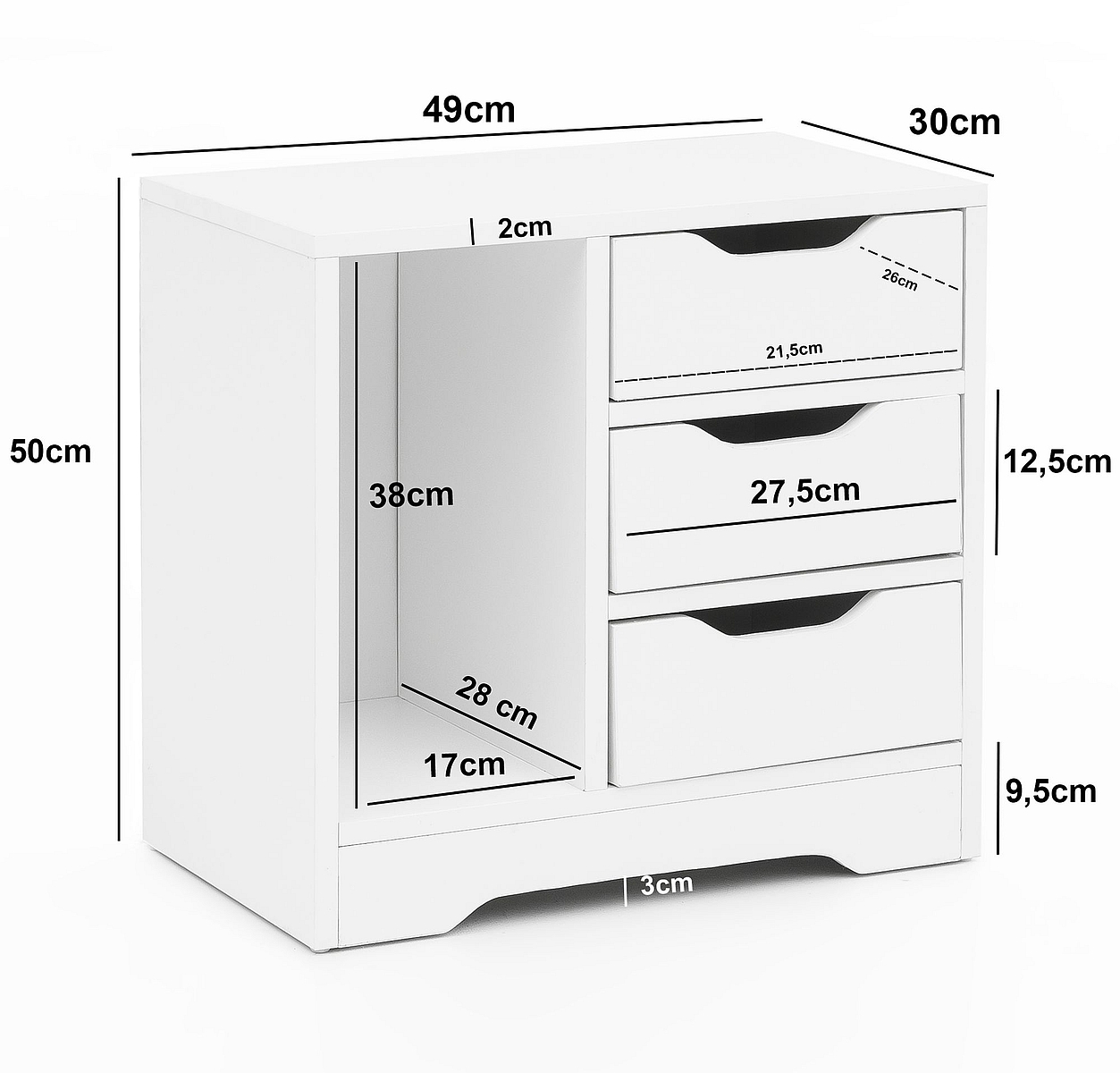 - Dimensions intérieures des tiroirs (L x H x P) : 21,5 x 12,5 x 26 cm