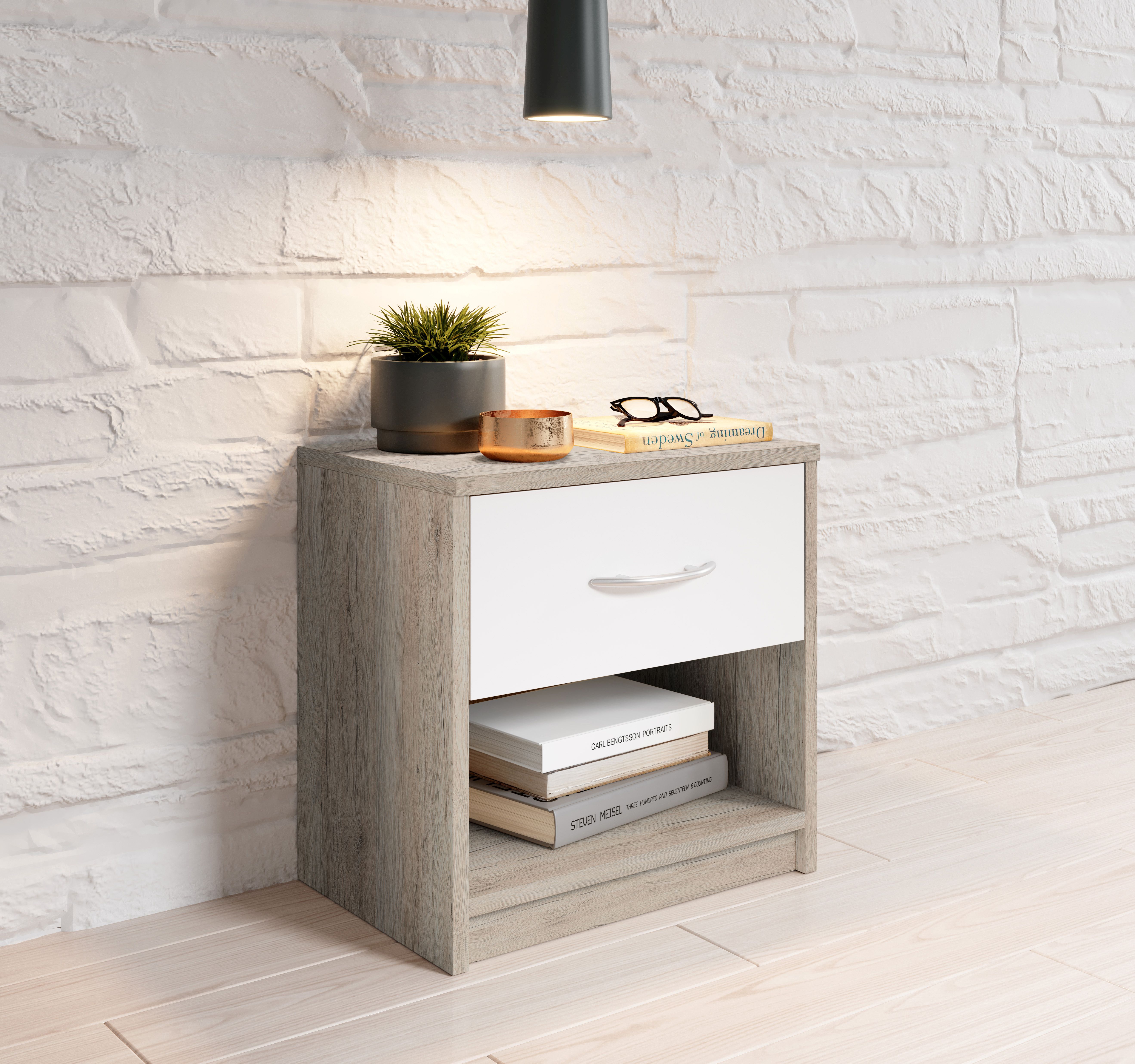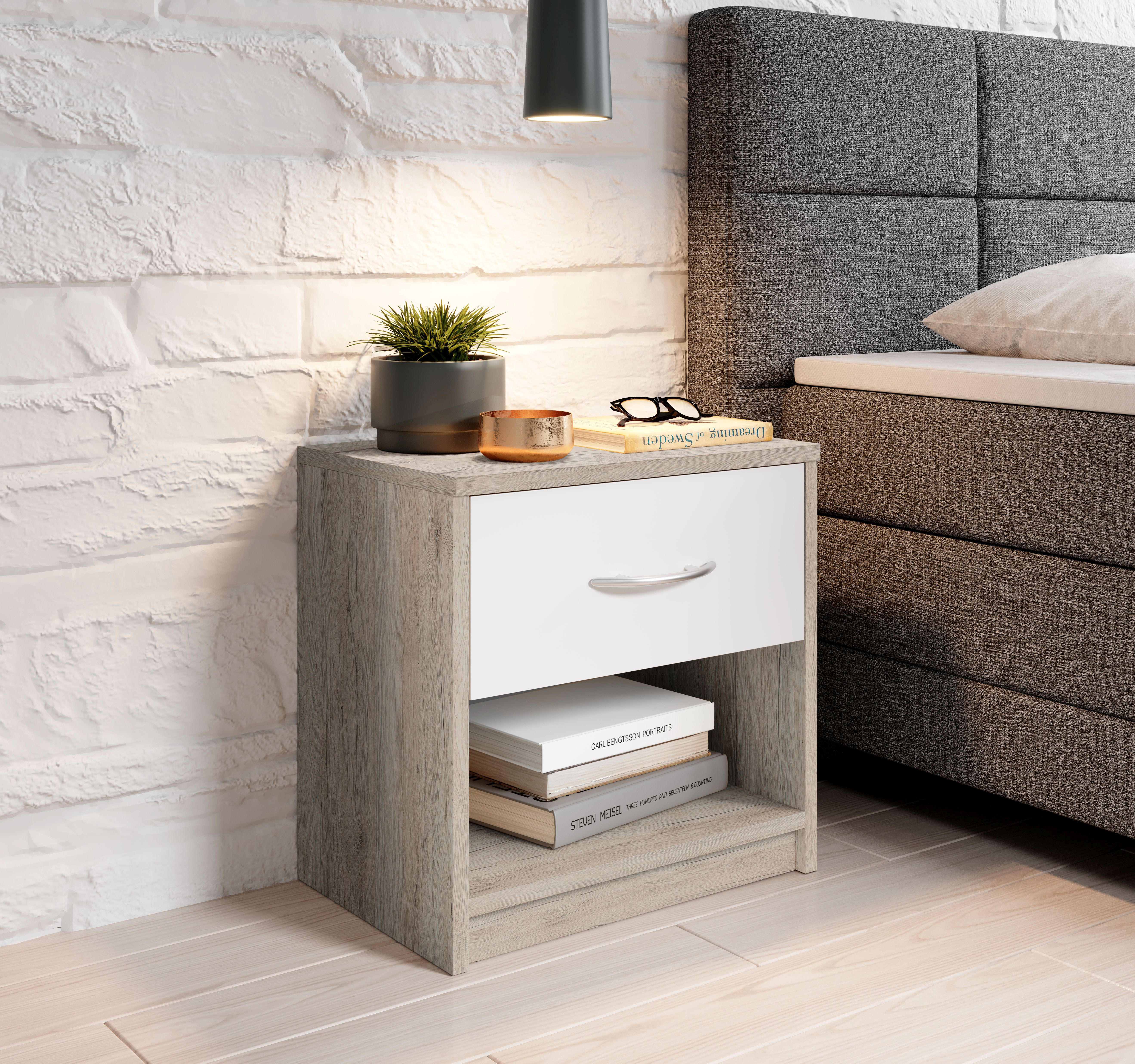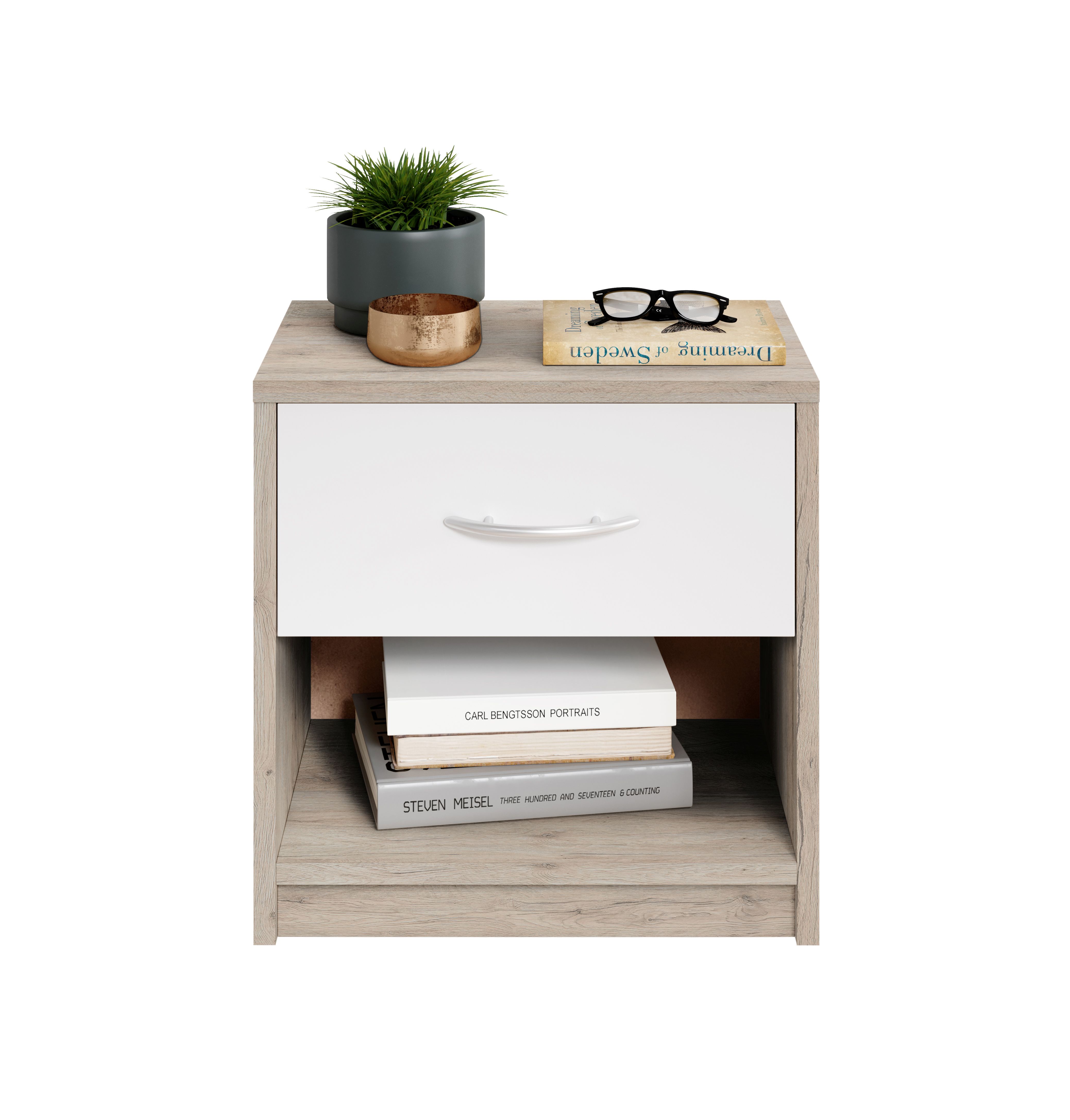 Chevet décor chêne San Remo et ton blanc PEPE - Table de nuit discrète avec un tiroir, assortie à tout type de lit & chambre à coucher - 39 x 41 x 28 cm (L/H/P)