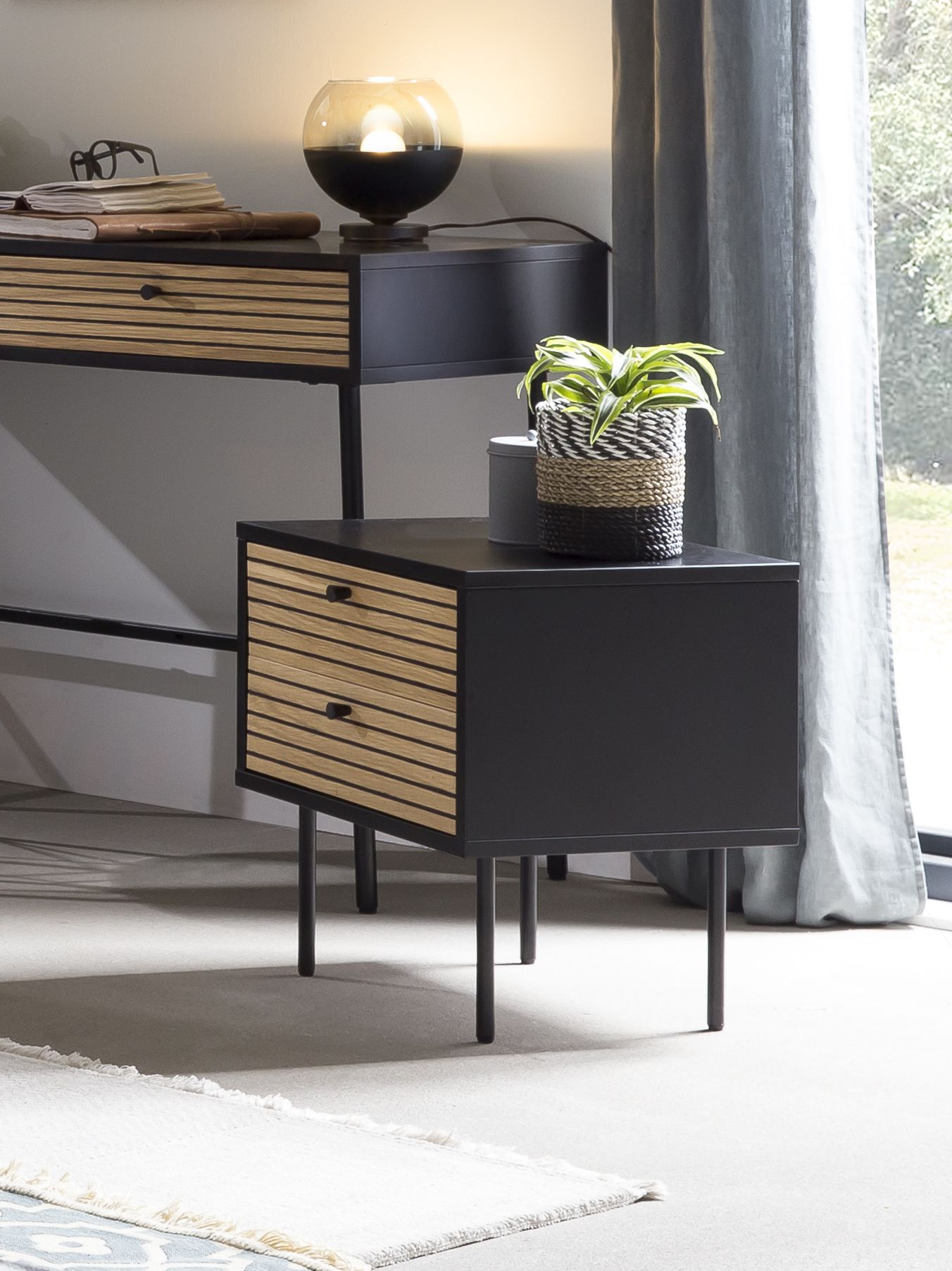 Le style scandinave réinterprété façon tendance ! Le chevet incarne élégance nordique et sobriété. La combinaison entre le caisson noir en bois MDF avec revêtement mélaminé et le placage en chêne véritable crée un superbe contraste. La façade en bois MDF est dotée d'un placage en chêne véritable et attire ainsi tous les regards. Dans les 2 tiroirs, il y a suffisamment d'espace de rangement fermé pour les objets les plus divers. La surface de rangement sur la table de nuit peut être utilisée à merveille pour une lampe de chevet. Laissez-vous emporter au pays des rêves avec cette table de chevet. La petite commode peut également être utilisée dans le couloir, l'entrée, le salon ou une autre pièce. Il n'y a presque aucune limite à son utilisation.