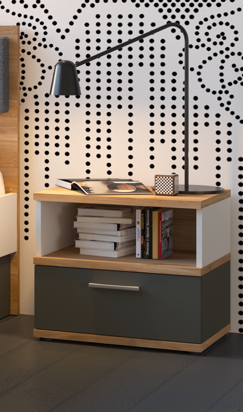 Caisson et façade : décor chêne Honey Castello / ton gris graphite / ton blanc alpin