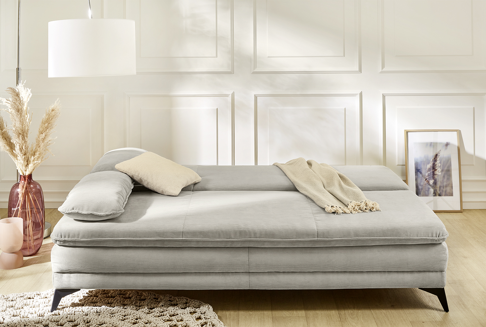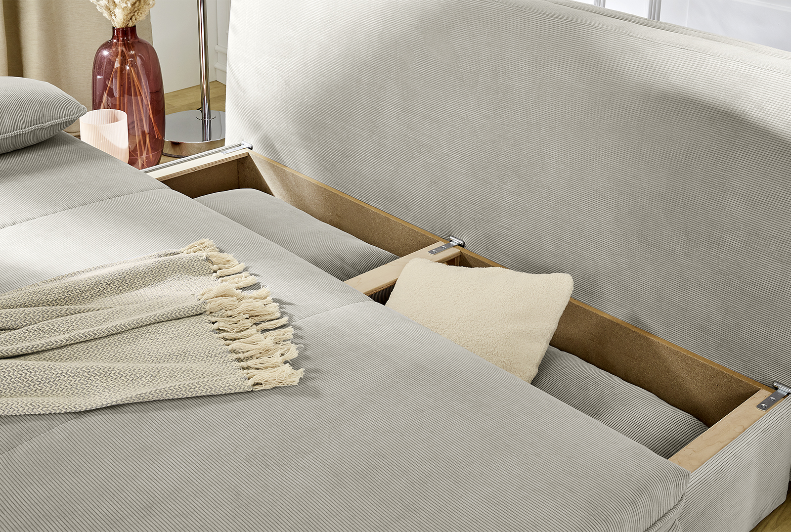 Canapé convertible de qualité avec surmatelas en mousse haute résilience cousu sur toute l'assise et la surface de couchage. Le garnissage en mousse polyéther de qualité avec suspension nosag dans l'assise et le dossier offre un excellent confort d'assise et de couchage et convient comme lit permanent. Le coffre de lit intégré offre un bel espace de rangement. La livraison contient 2 coussins de dos, 2 coussins accoudoirs et un coussin décoratif. Dos habillé