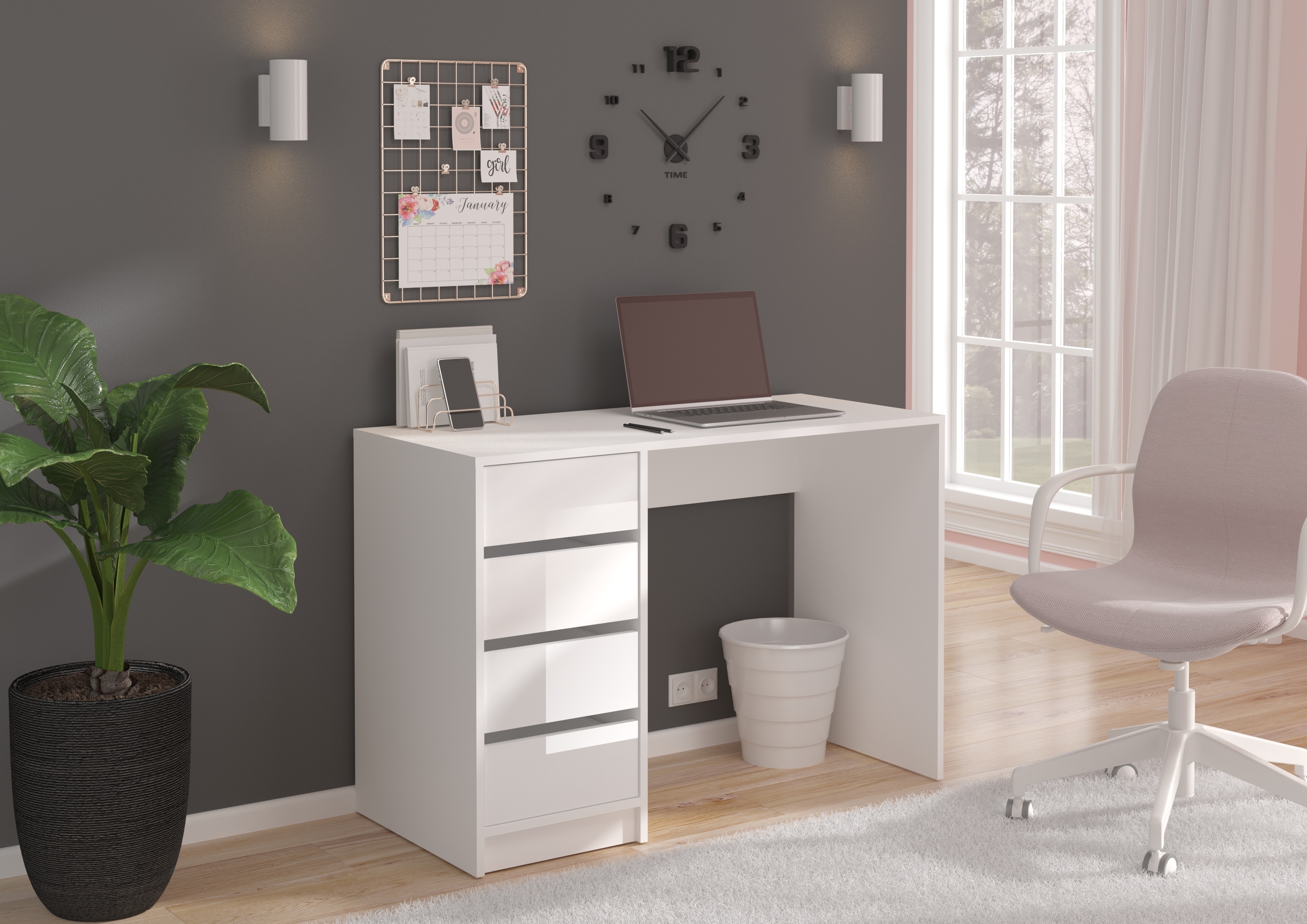 Découvrez notre élégante coiffeuse dans un ton blanc éclatant et blanc ultra brillant : le modèle idéal pour votre rituel beauté quotidien ! Avec ses dimensions généreuses (110x75x48 cm) et une hauteur jusqu’au bord de table de 75 cm, elle n’offre pas seulement suffisamment de place pour vos produits de beauté ; elle permet aussi une position assise confortable. Cette coiffeuse combinant design tendance et côté pratique mettra joliment en valeur votre chambre.