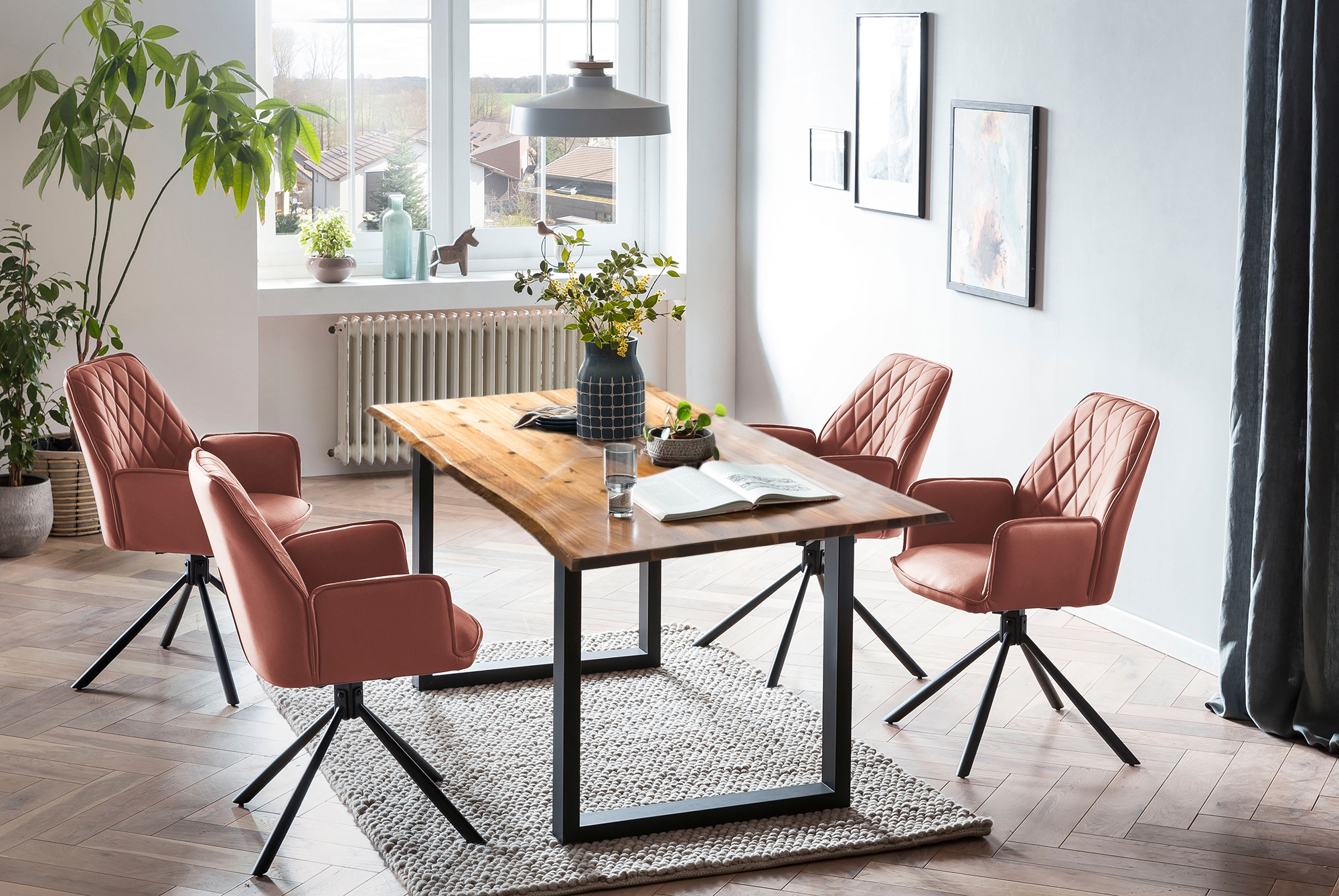 Un joli coin repas au look naturel et tendance : il comprend une table de repas et 4 chaises à accoudoirs pour les tablées conviviales et les moments en famille ou entre amis. Le plateau de 26 mm d'épaisseur en bois d'acacia a été fabriqué à partir d'une planche à flache véritable. Le piètement en U en métal laqué ton noir confère à la table une très bonne stabilité et représente un contraste bienvenu avec le joli plateau ton cognac. Les chaises à accoudoirs séduisent par leur fonction pivotante à 360°. Le revêtement en microfibre aspect cuir synthétique est élégant et s’adapte parfaitement aux pieds noirs. Le piètement en métal à 4 pieds offre une excellente stabilité. La chaise rembourrée offre, grâce à son assise façon fauteuil, un confort exceptionnel. Les surpiqûres en forme de losanges au niveau du dossier sont un régal pour les yeux et attireront tous les regards dans la salle à manger. Remarque : comme cette table en bois massif est un produit naturel, elle peut présenter des nœuds ou des variations de teinte qui ne sont pas des défauts, mais soulignent le caractère individuel du bois véritable.
