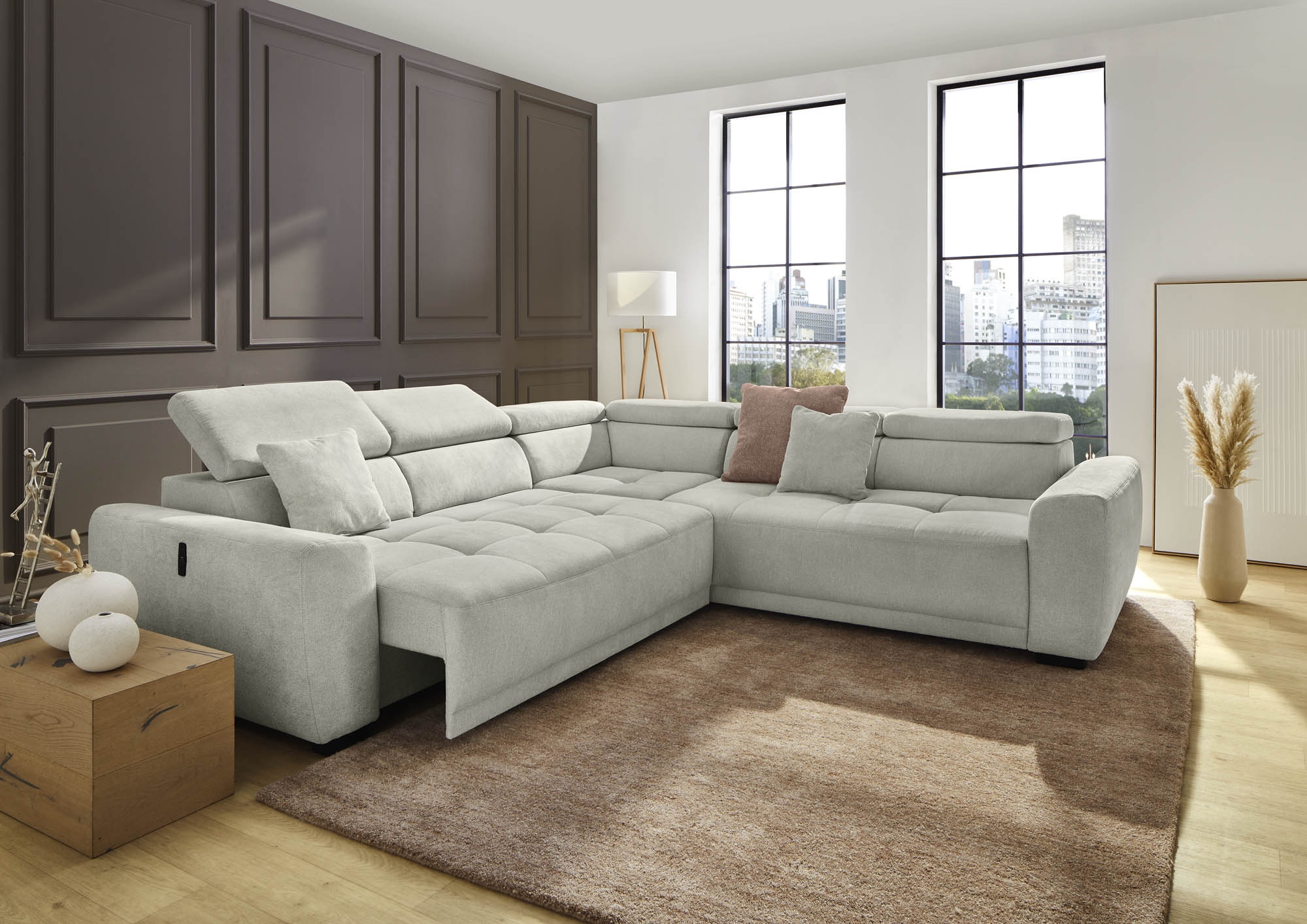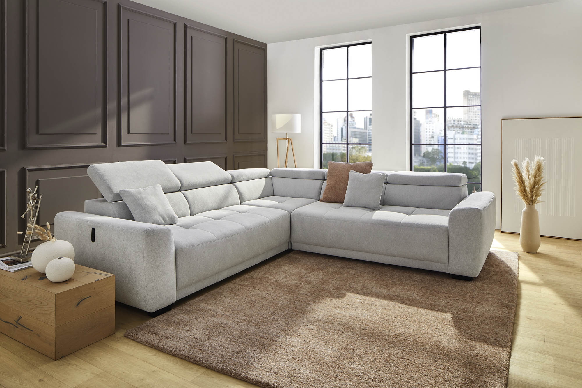Ce canapé d'angle moderne gris clair offre un confort pratique au quotidien et séduit par sa fonctionnalité bien pensée. Grâce à son rembourrage en mousse souple avec suspension à ressorts ondulés, vous êtes assis confortablement, même pendant de longues périodes. Des extras techniques tels qu'un siège à avance électrique, des ports de chargement USB intégrés (type A & C) et une surface de chargement inductive rendent ce canapé d'angle particulièrement adapté à un usage quotidien. Six appuie-tête réglables, des coussins décoratifs et un coussin Fluppy offrent un confort supplémentaire. Le canapé d'angle peut être monté à gauche ou à droite selon la disposition de la pièce, ce qui est idéal pour les concepts d'aménagement flexibles avec un budget limité.