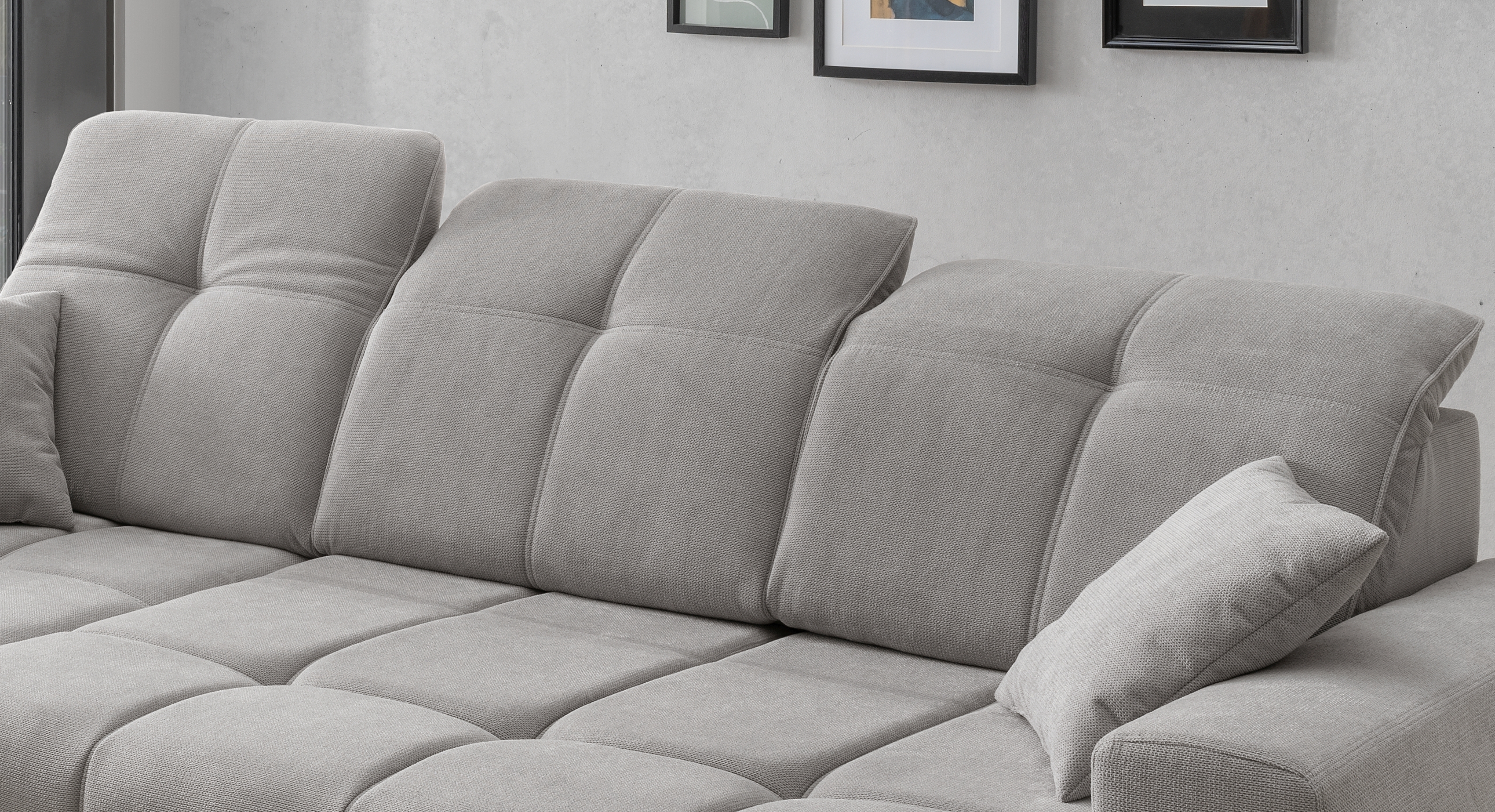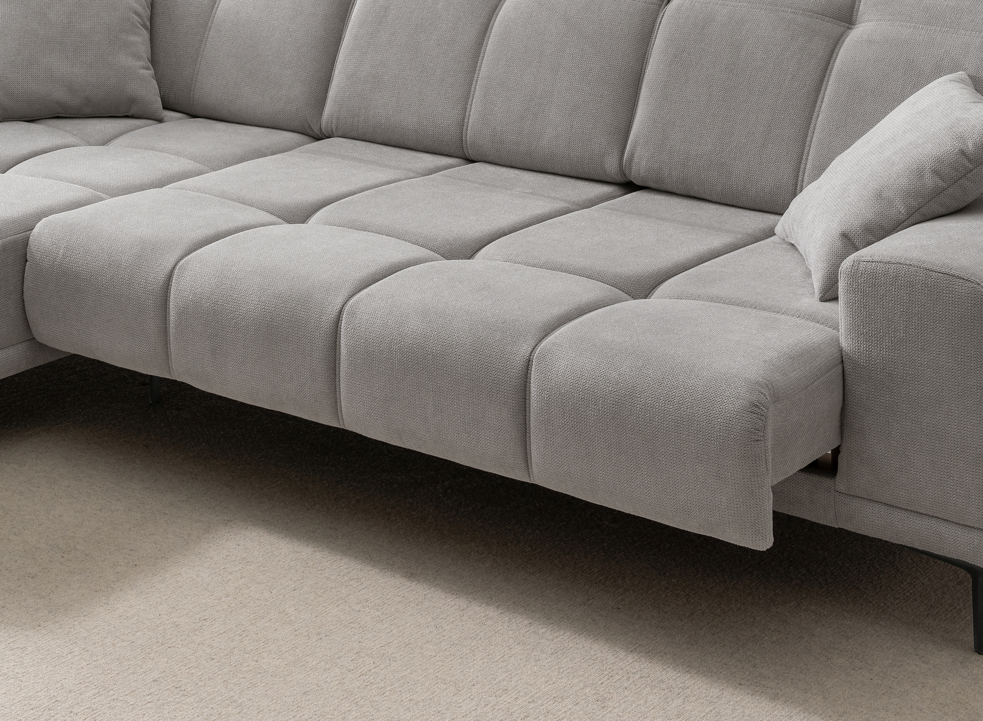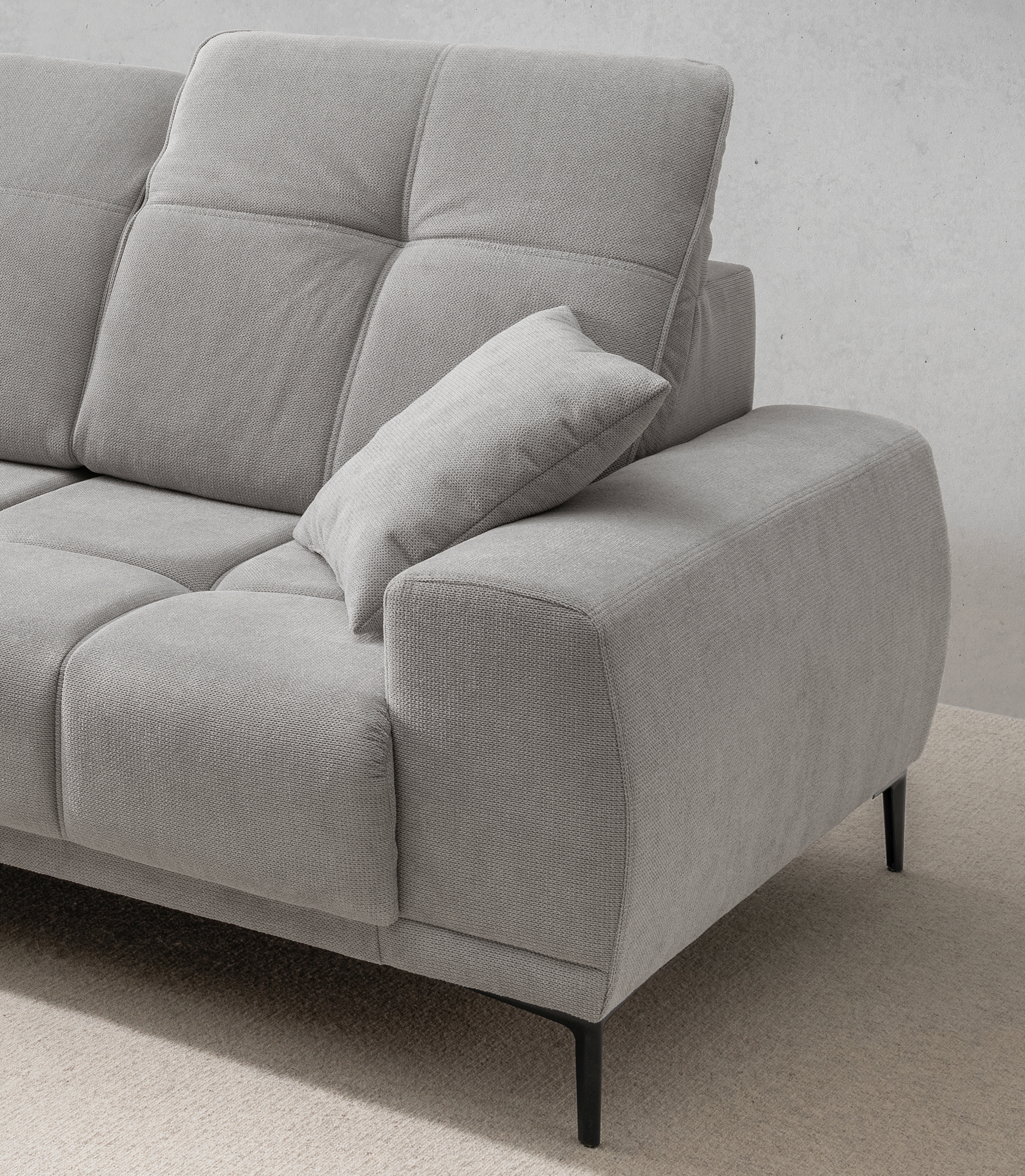 Ce canapé d'angle moderne allie confort et fonctionnalité pour un usage quotidien. Son revêtement en tissu gris résistant est facile d'entretien et s'intègre à de nombreux styles d'intérieur. La combinaison d'un sommier à ressorts et d'une mousse confortable garantit une assise confortable. Des fonctions pratiques telles que l'avance électrique de l'assise et les appuie-tête réglables offrent un confort supplémentaire. Le dossier est entièrement recouvert de tissu véritable, ce qui permet de placer le canapé n'importe où dans la pièce. Les pieds métalliques noirs robustes assurent la stabilité. Idéal pour tous ceux qui recherchent des meubles rembourrés fonctionnels à un prix raisonnable.
