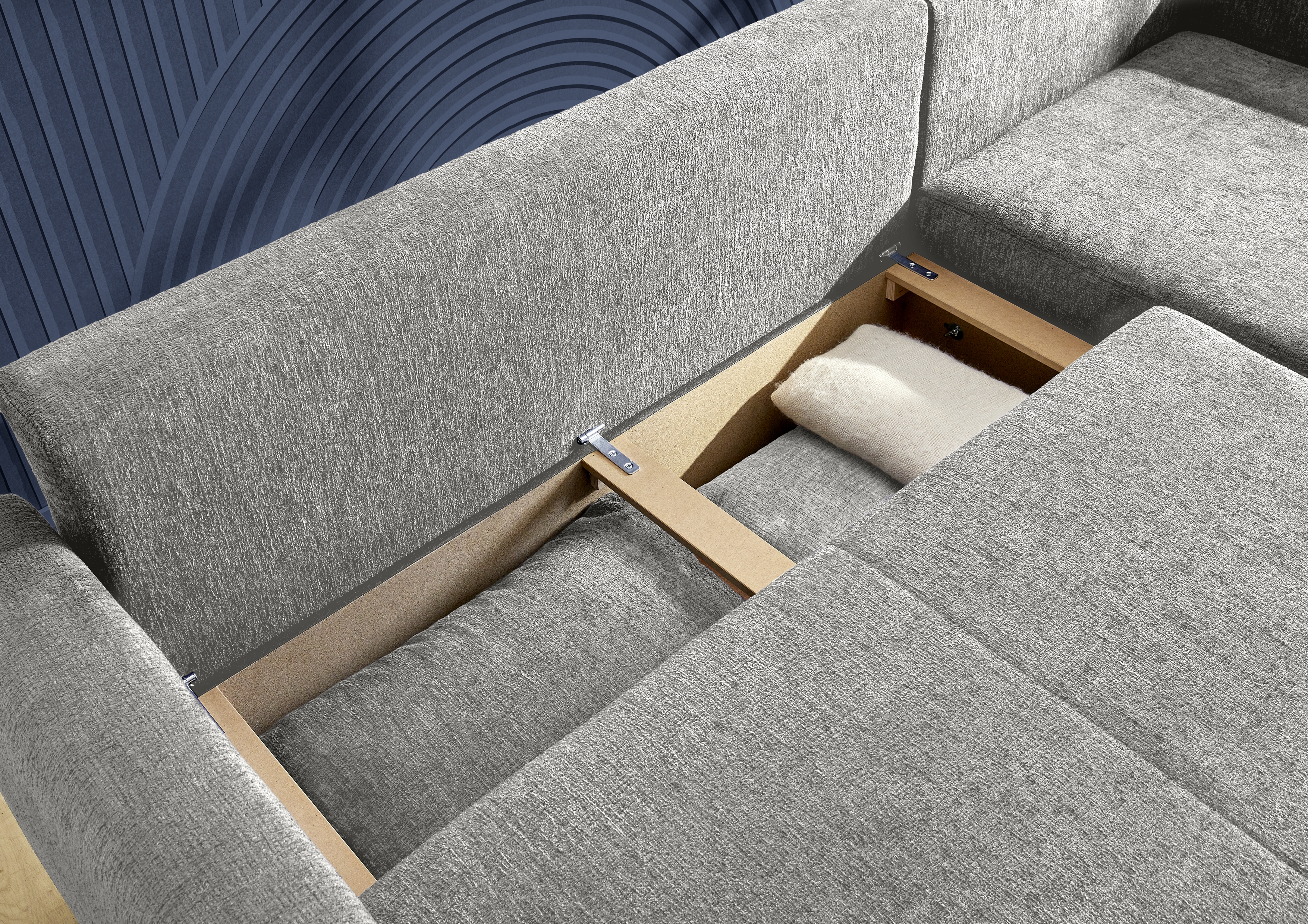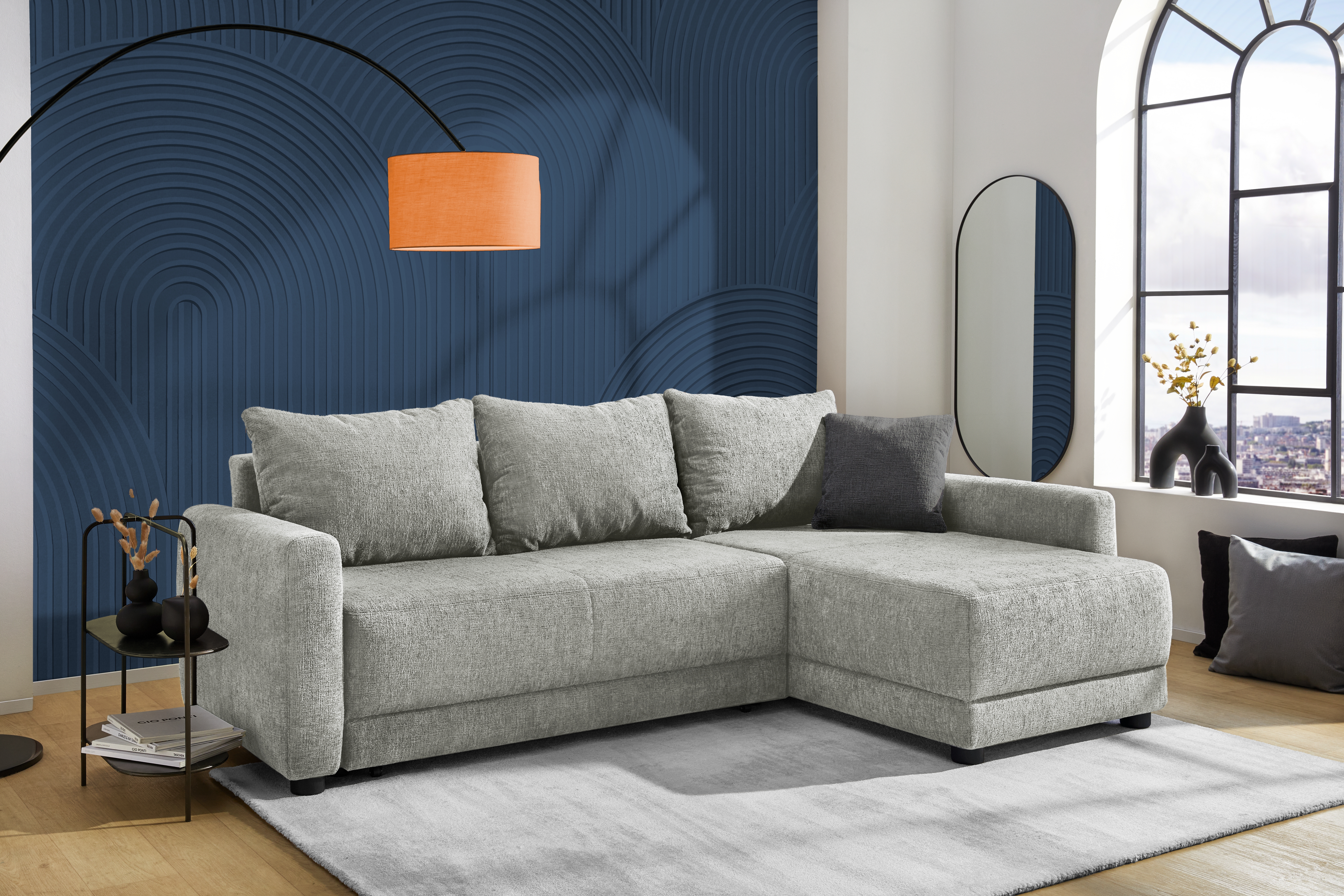 Ce canapé d'angle compact séduit par ses formes douillettes et apporte un confort douillet même dans les petites pièces. Outre une fonction couchage confortable, il dispose d'un coffre de rangement spacieux pour ranger couvertures et oreillers. Le rembourrage en mousse assure également un bon confort d'assise et de couchage. Trois coussins de dossier généreux et un coussin décoratif assurent une assise confortable tout en apportant une touche d'élégance. Particulièrement pratique : le pouf peut être monté à gauche ou à droite et s'adapte ainsi parfaitement à toutes les configurations d'intérieur. Grâce à son dossier recouvert de tissu véritable, le canapé d'angle peut également être placé « librement dans la pièce ».