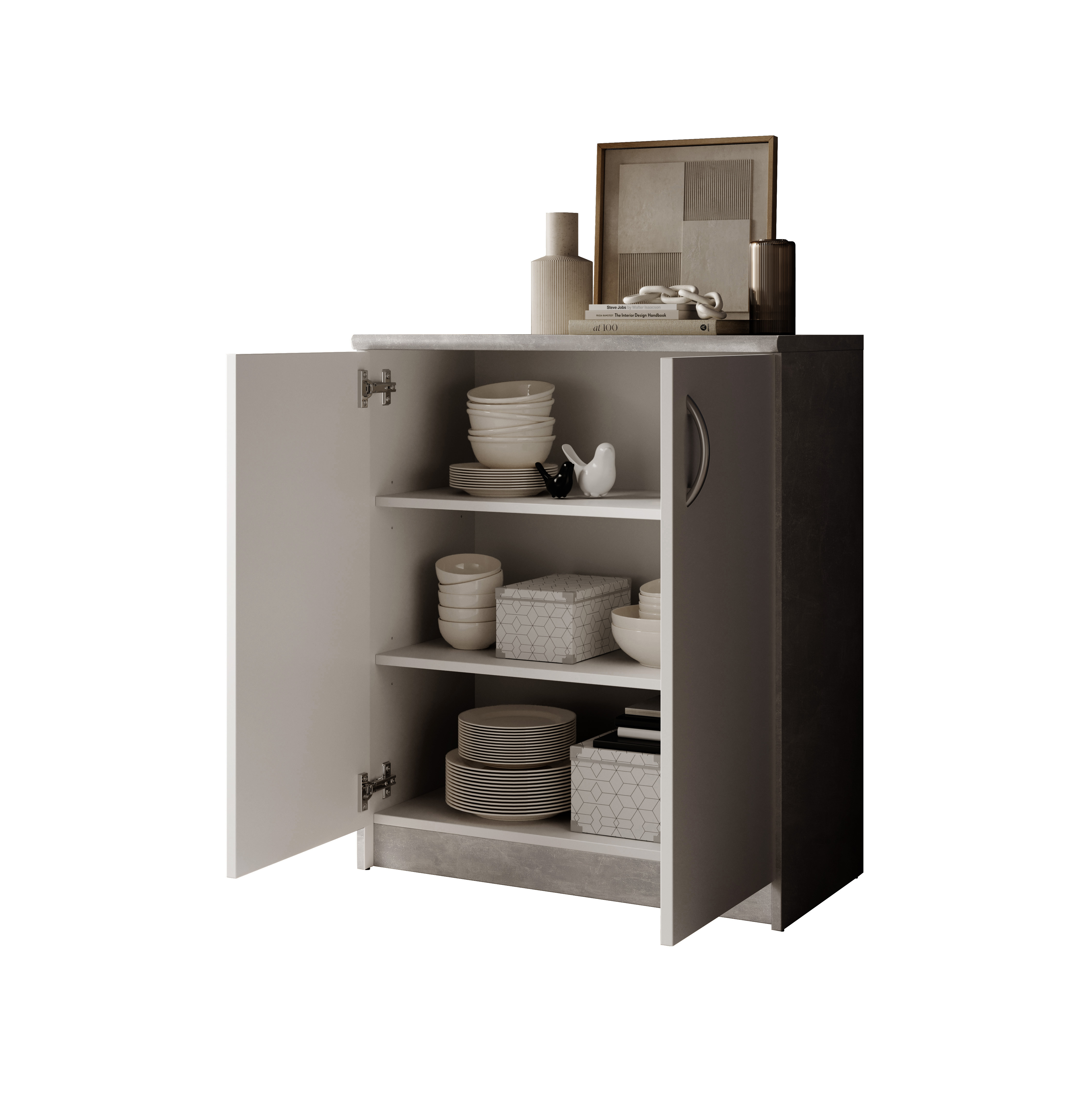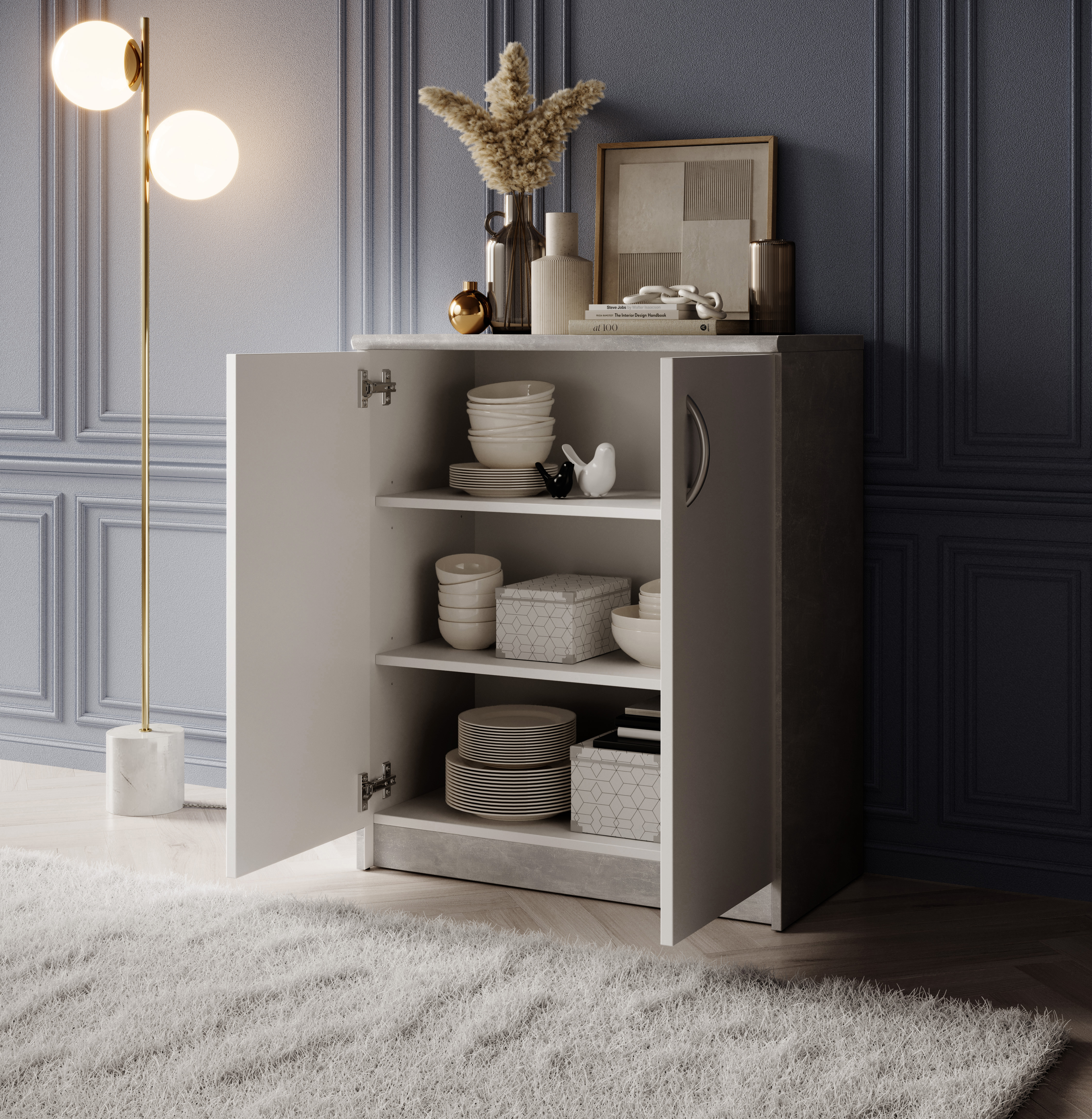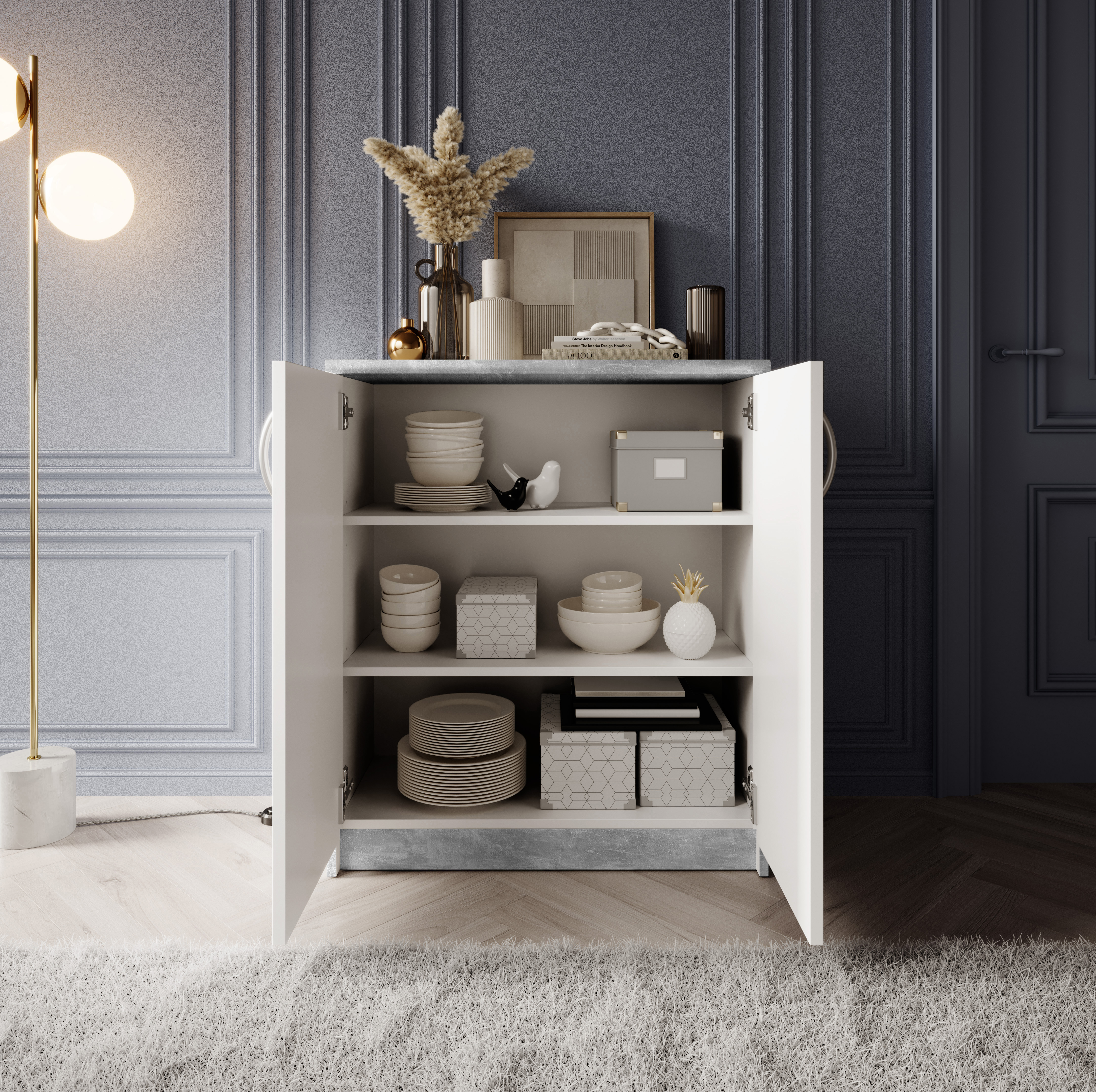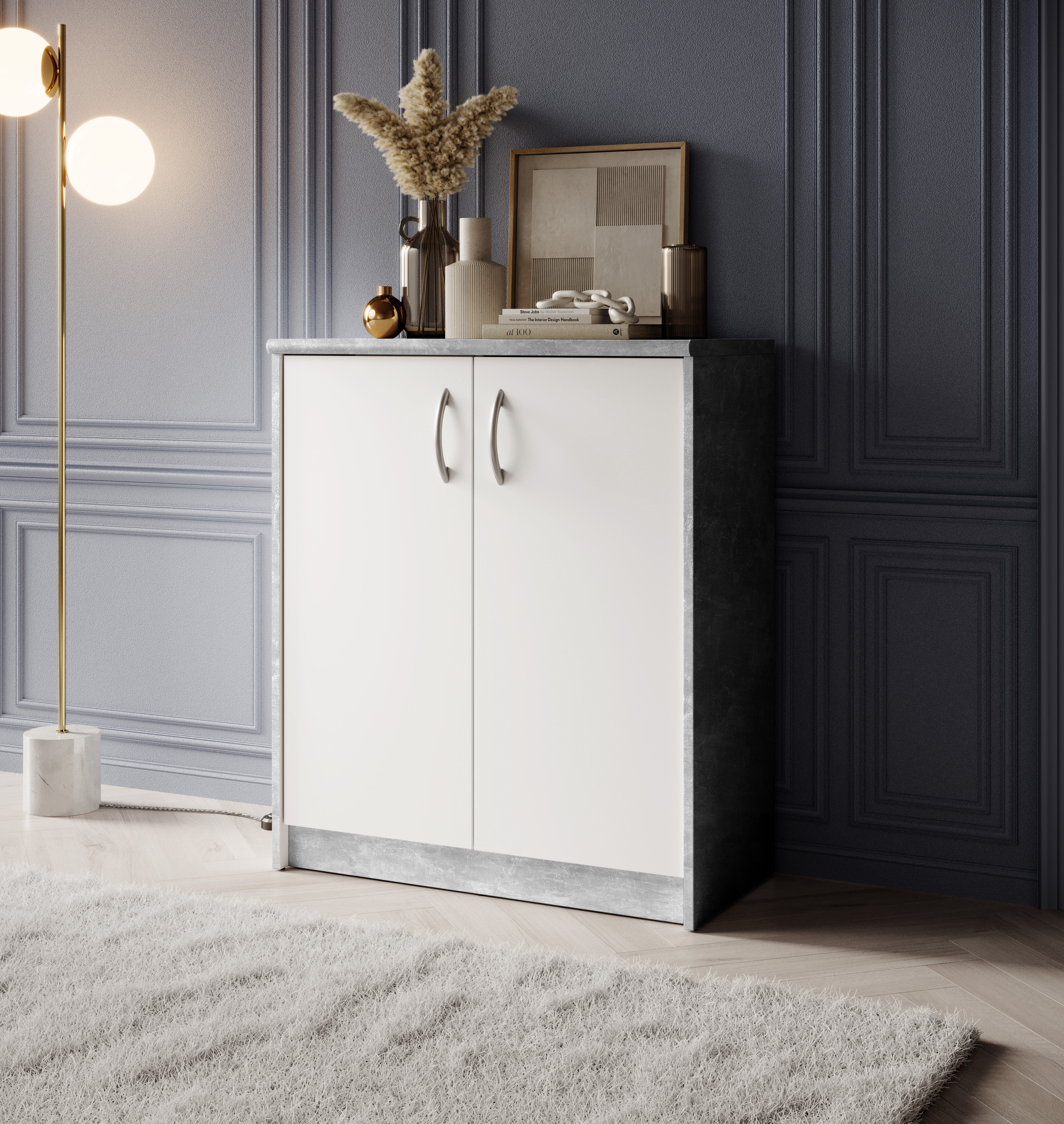 La commode pratique Optimus est une solution de rangement compacte avec un aspect clair et neutre, parfaite pour les salons, les couloirs, les bureaux ou les chambres à coucher. La commode à deux portes et à étagères réglables offre beaucoup d'espace de rangement tout en étant étroite, ce qui lui permet de s'intégrer parfaitement dans les petites pièces. Les surfaces en bois enduit blanc sont faciles d'entretien et robustes, tandis que les poignées argentées apportent une touche discrète. Les meubles sont livrés démontés et peuvent être facilement assemblés avec un peu d'habileté manuelle. Grâce à son design intemporel, la commode peut être combinée de multiples façons avec d'autres meubles.