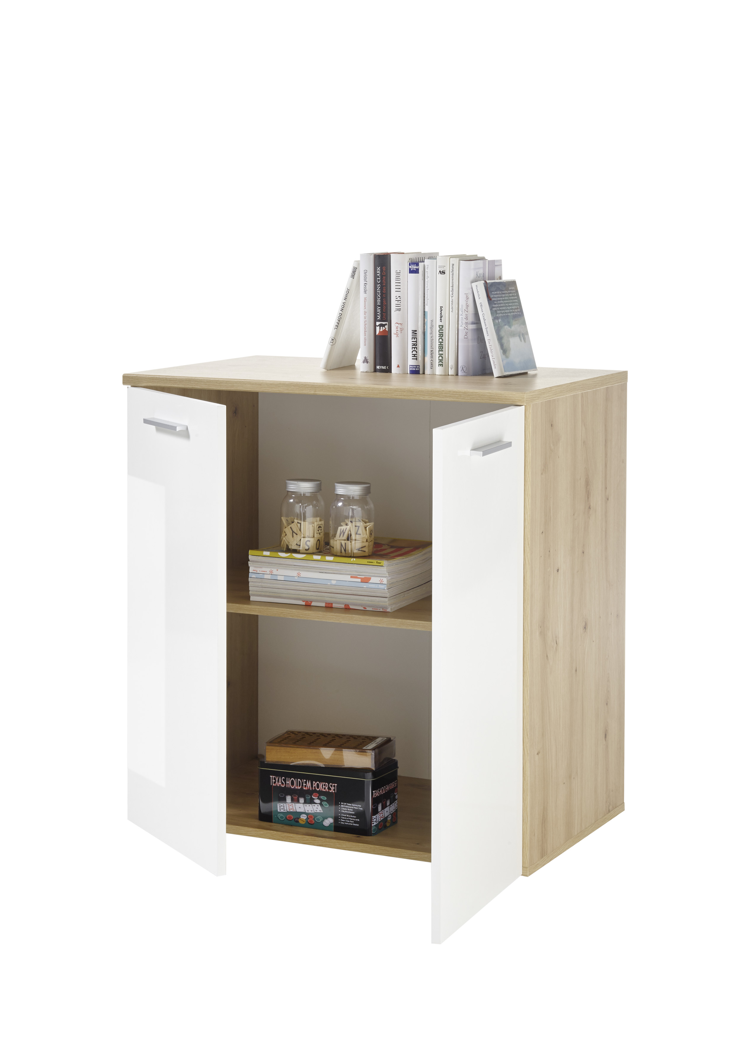 La commode Pablo blanc brillant allie design moderne et fonctionnalité pratique, offrant une solution de rangement flexible pour le salon, le couloir, la chambre ou l’espace de travail.