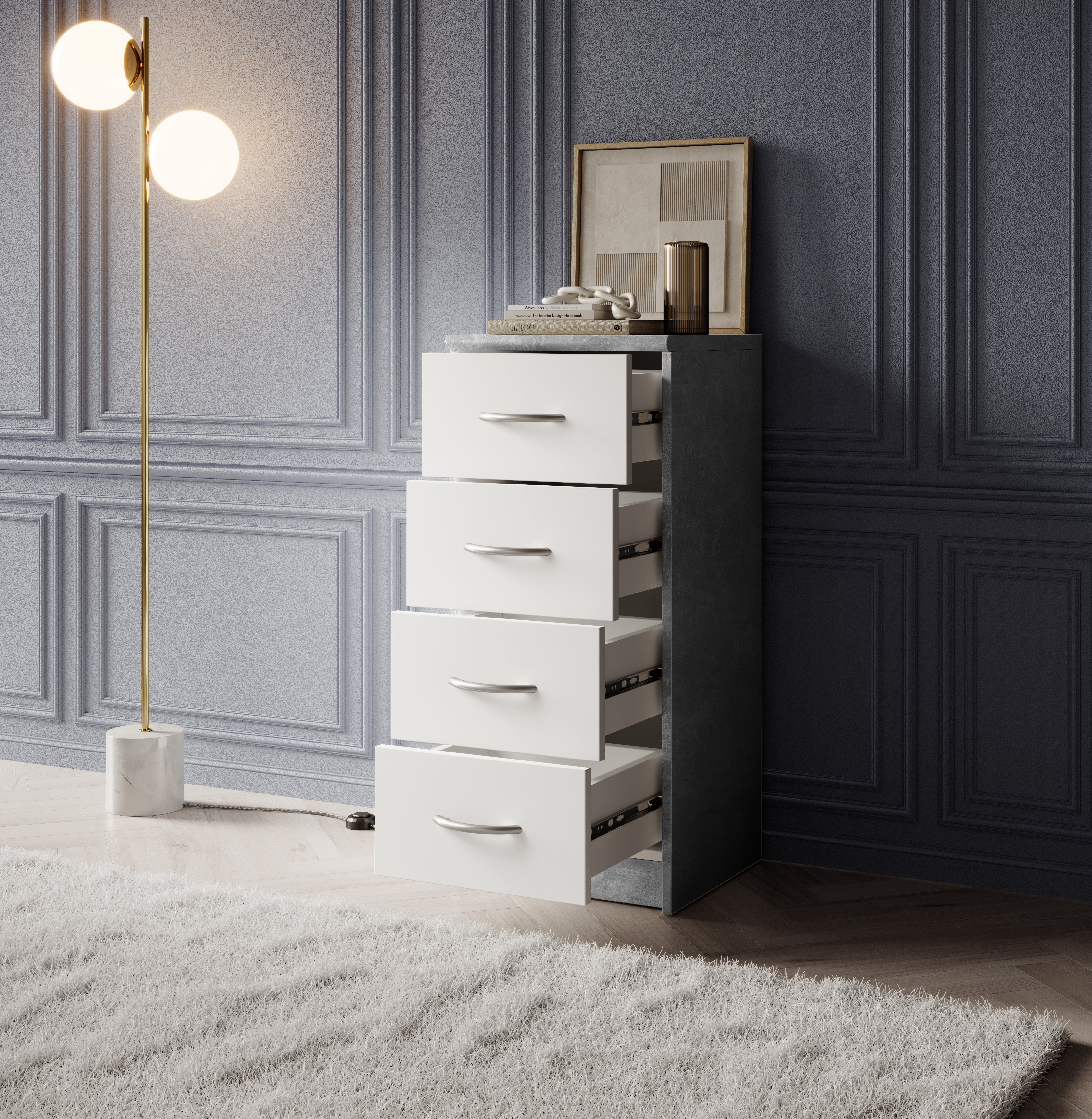 Avec quatre tiroirs spacieux, elle crée de l’espace pour les objets du quotidien, la décoration ou le linge, tout en maintenant l’ordre dans la pièce. Les surfaces en panneaux bois blanc sont faciles à entretenir, résistantes aux rayures et simples à nettoyer.
