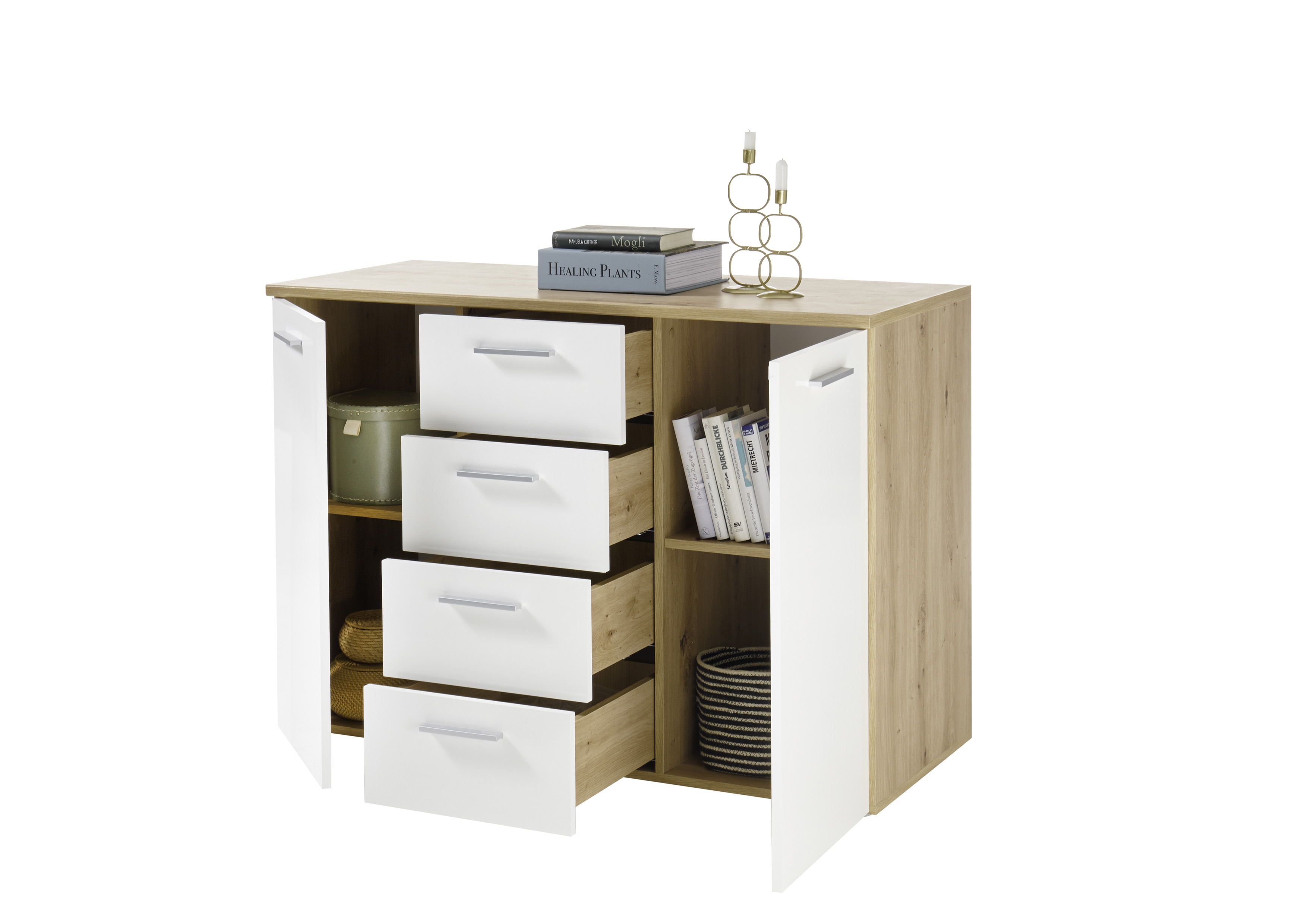 Derrière les deux portes et les quatre tiroirs, la commode offre un vaste espace de rangement pour les vêtements, les accessoires de maison ou les objets du quotidien.