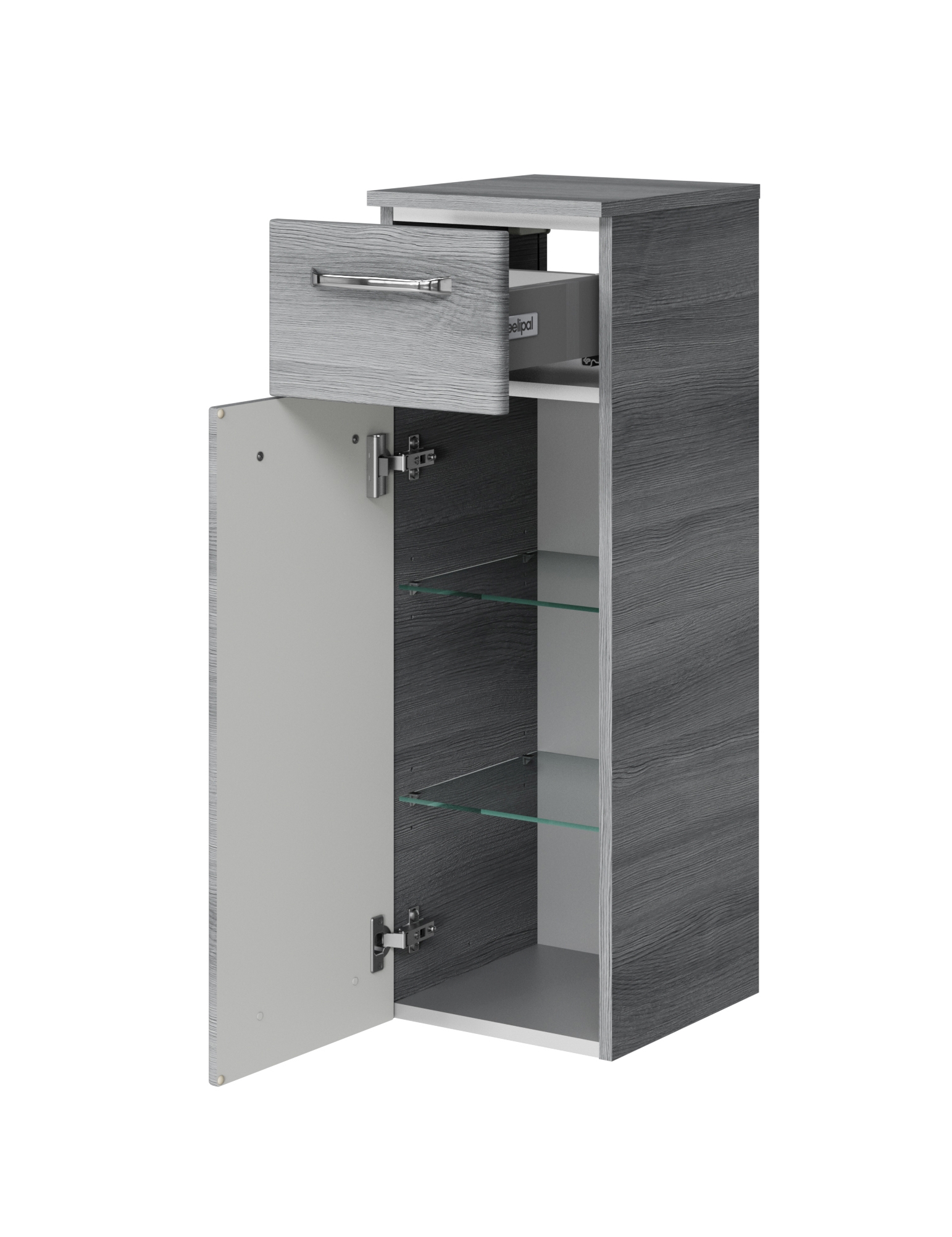 1 porte battante avec, derrière elle, 2 tablettes amovibles en verre