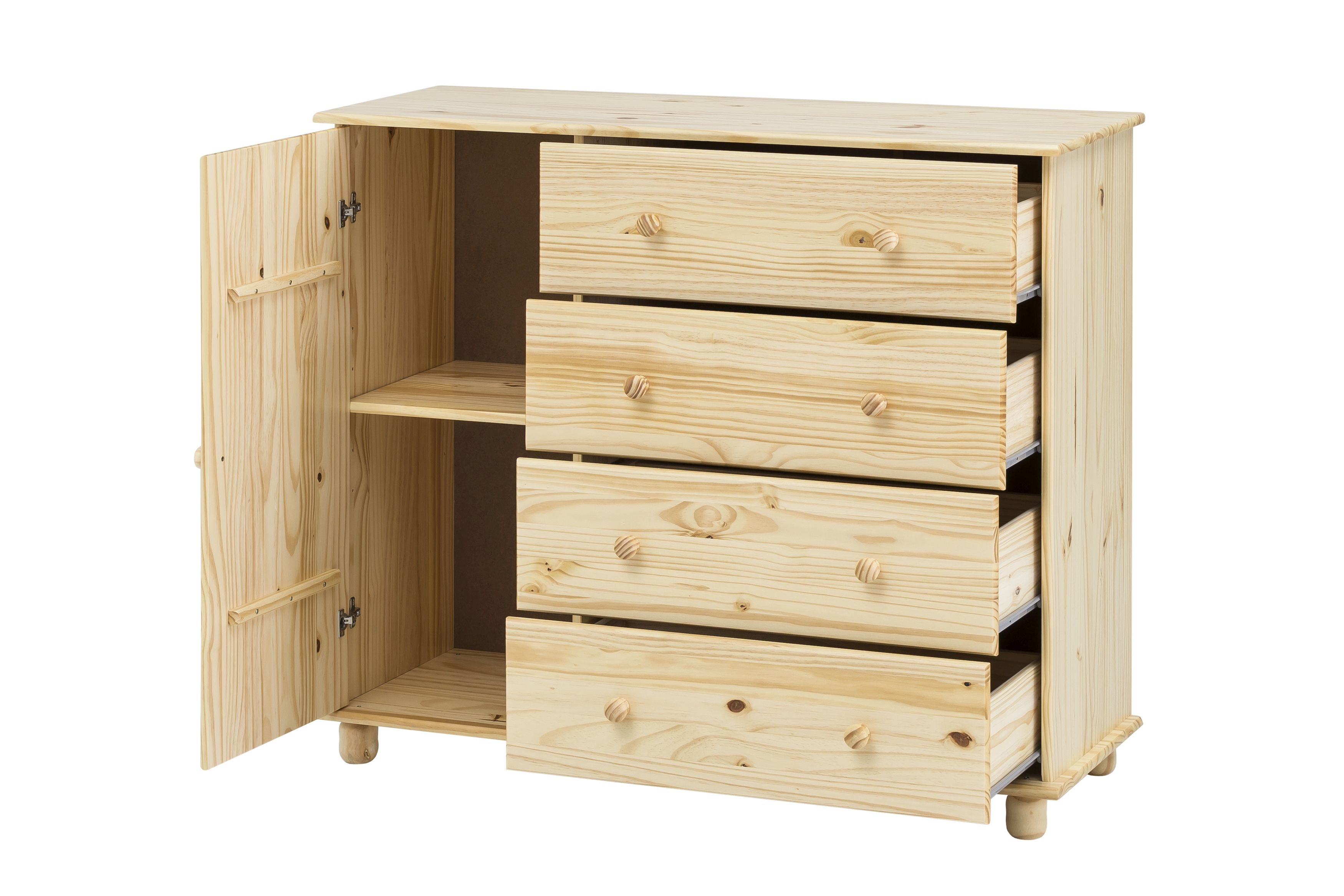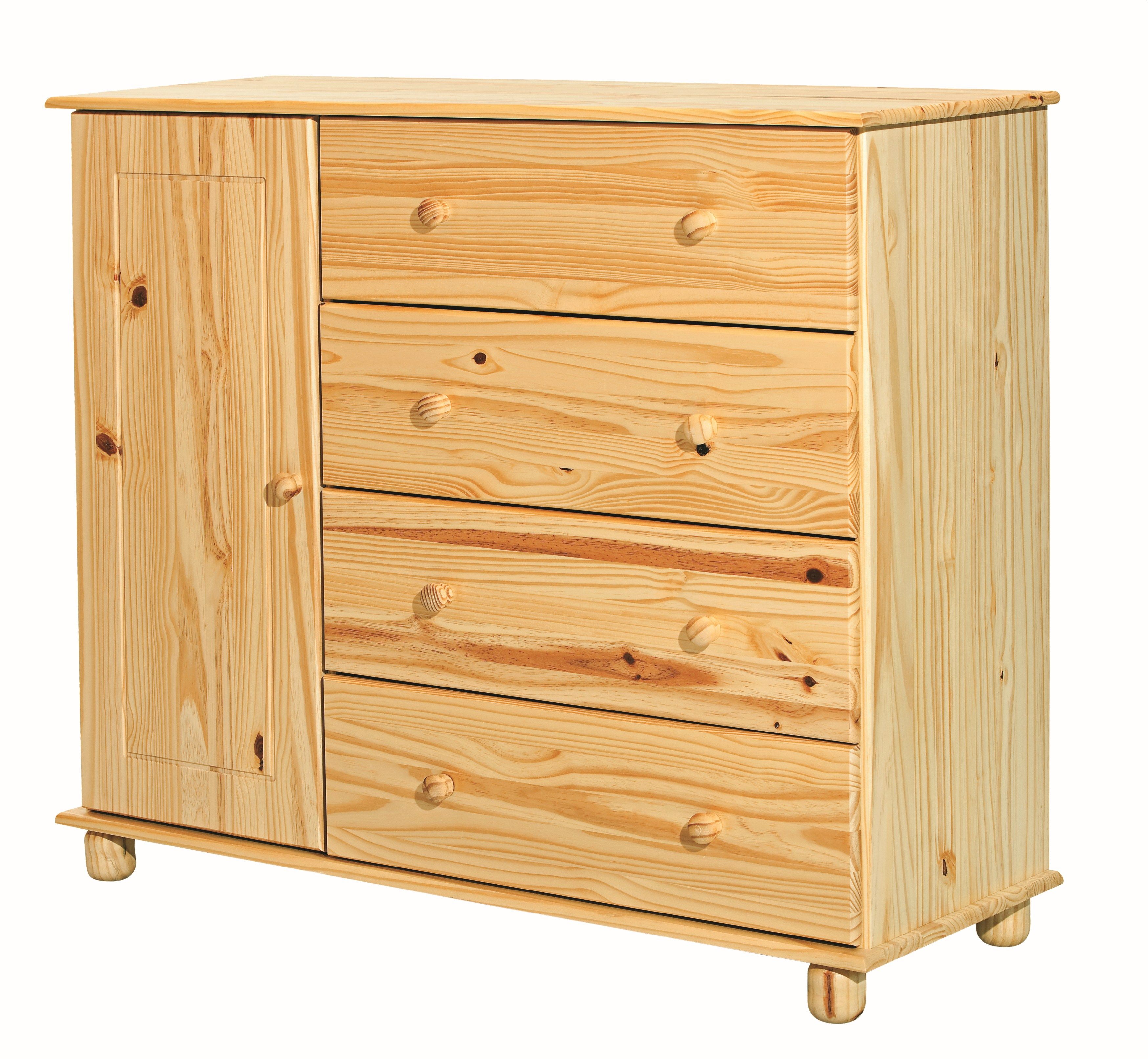 Cette commode robuste de qualité est fabriquée en bois de pin massif ; les surfaces sont laquées pour la protéger. Les 4 tiroirs avec rails métalliques et la porte avec tablette amovible réglable offrent un bel espace de rangement et de la place pour divers objets. Il s'agit d'un meuble pratique qui n'est pas seulement facile d'entretien, mais aussi ultra polyvalent : il est donc idéal, par exemple, pour une chambre d'étudiant ou dans de petites pièces.