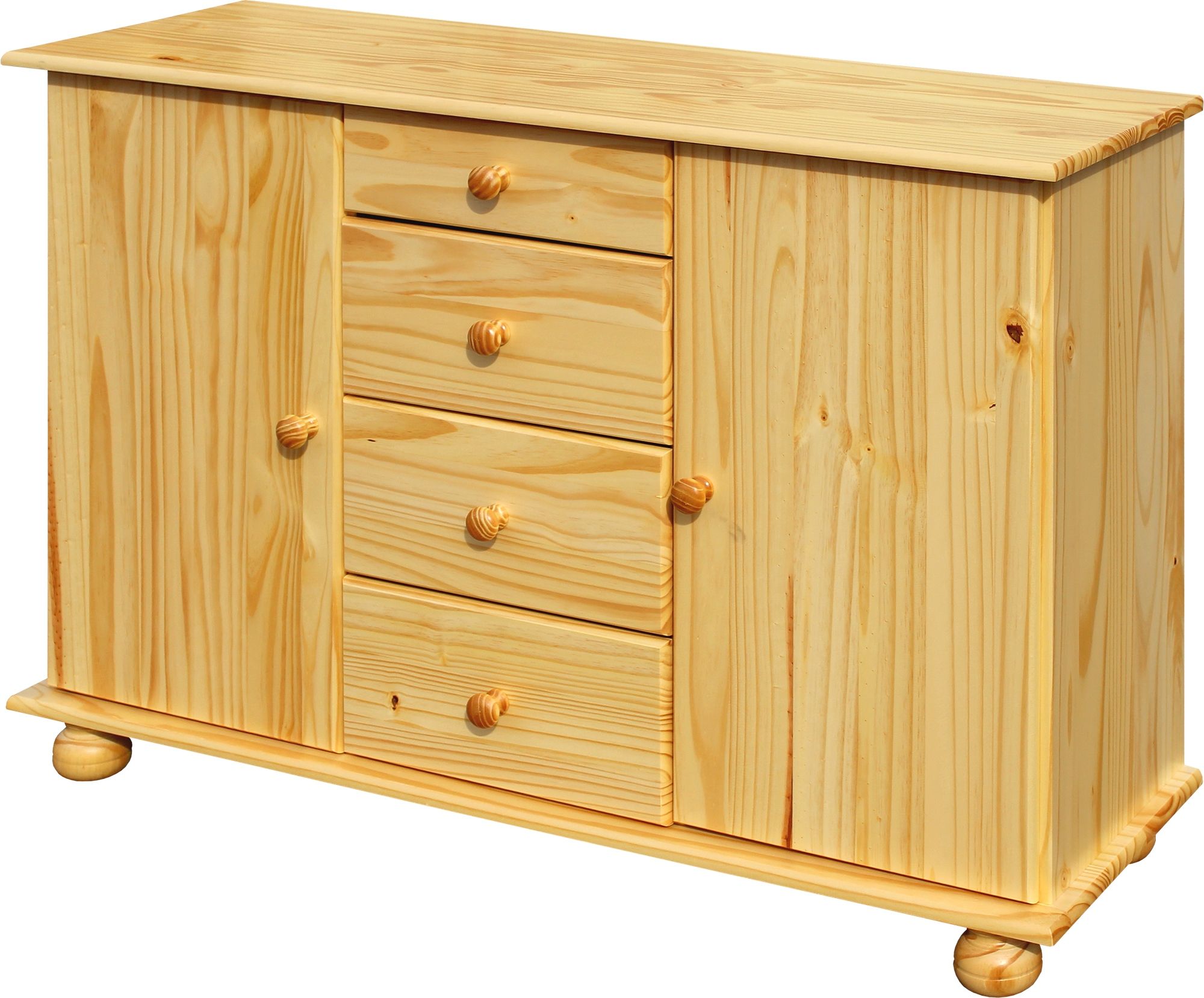 Cette commode indémodable est fabriquée en bois de pin massif et les surfaces sont laquées pour la protéger. Elle offre beaucoup de place dans les quatre tiroirs avec rails métalliques et derrière les deux portes avec une tablette réglable. La commode peut s'utiliser de multiples façons.