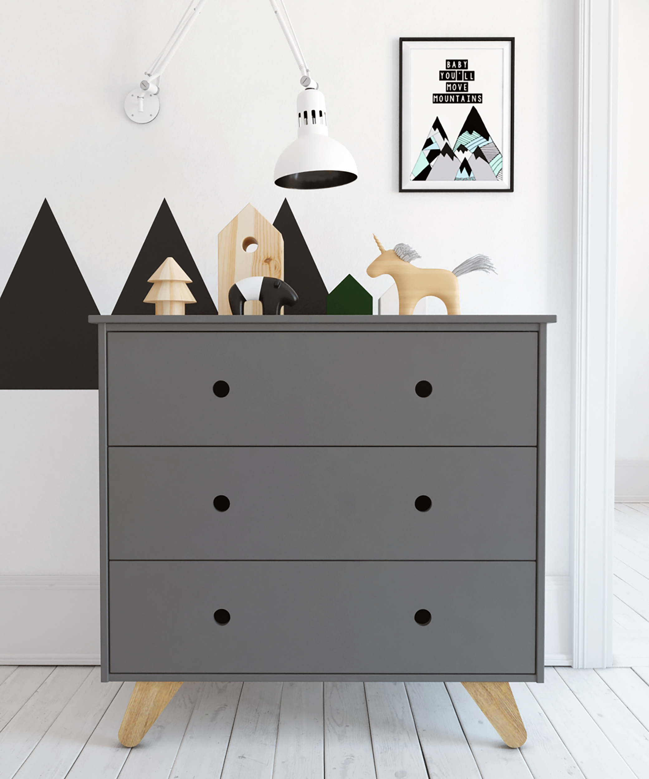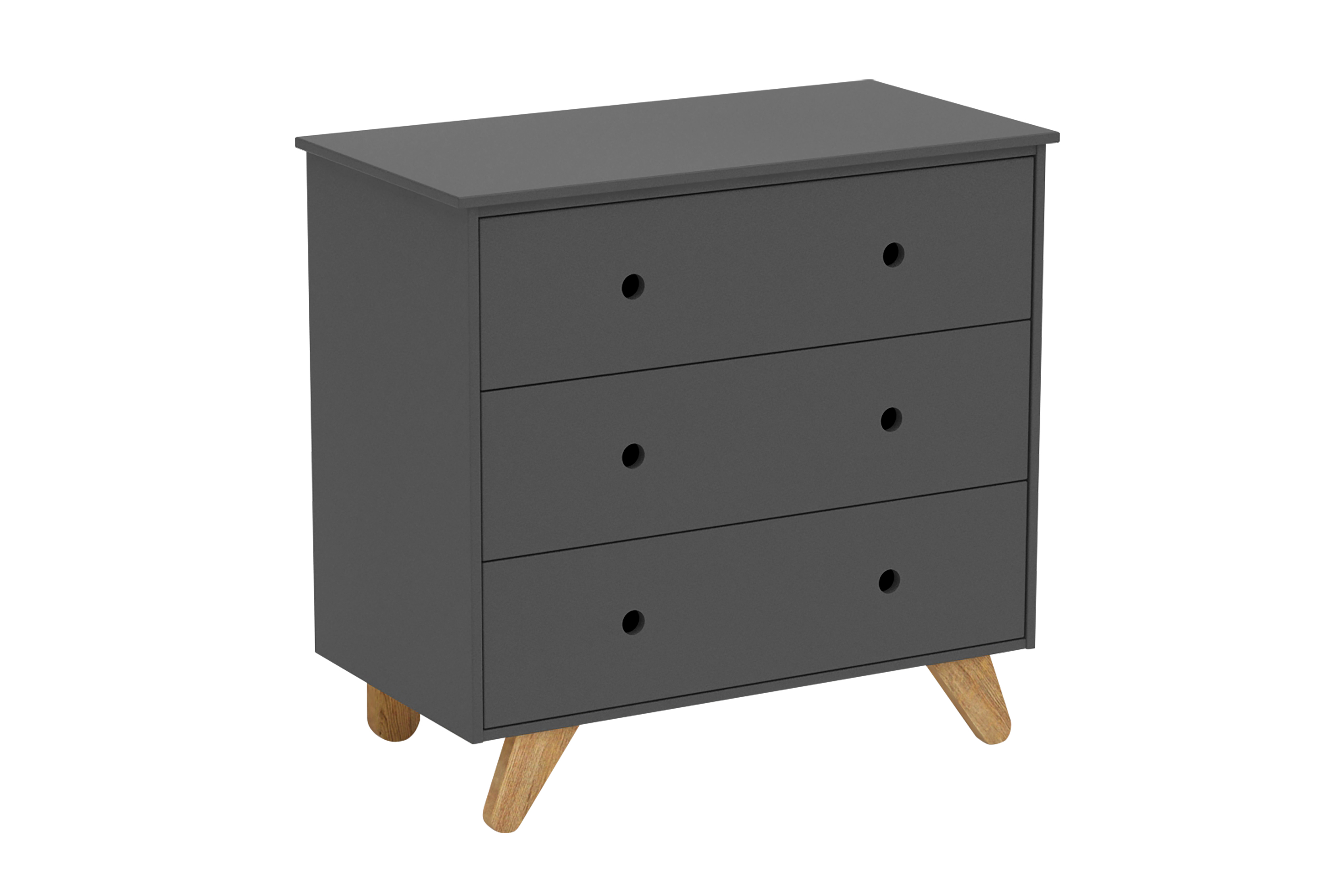 On n'a jamais trop de rangement dans la salle de jeux et la chambre d'enfant. Cette commode à trois tiroirs est la preuve que l'espace de rangement peut être intégré de façon moderne et stylée dans la chambre junior. Le design scandinave épuré est mis en valeur grâce aux pieds de biais en bois de pin et aux poignées en forme d'encoches. Les vêtements, jouets ou livres trouveront leur place dans trois grands tiroirs. L'espace sur la commode peut être utilisé pour ranger ou présenter des objets. Grâce à sa position surélevée, la commode a un air aérien et léger : ainsi, ce meuble ne fait pas un effet trop massif, même dans les petites pièces. Combinez la commode soit avec les meubles assortis de la collection junior, soit en intégrant le meuble facilement dans l'ameublement déjà existant. Les rails métalliques de qualité au niveau des tiroirs vous permettront de profiter longtemps de la commode.