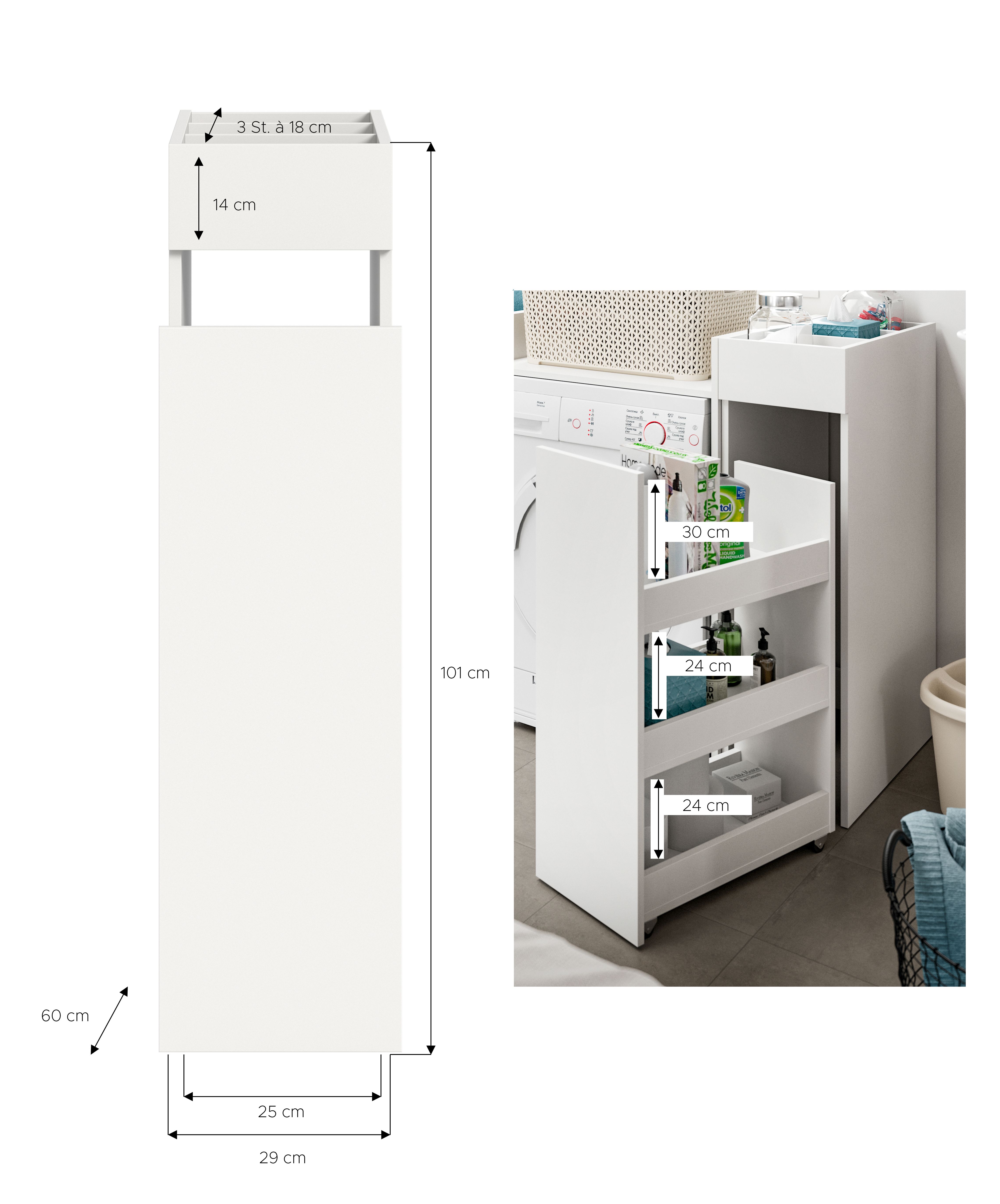 Une commode juxtaposable vous offre la possibilité de combiner des étagères ouvertes et un espace de rangement fermé. Ses dimensions (L/H/P : 29x101x60 cm) sont idéales pour les petits espaces ou les coins nécessitant un rangement supplémentaire, voire comme complément idéal pour un meuble de machine à laver. Le décor blanc confère à ce meuble une apparence moderne et intemporelle qui s'harmonise parfaitement avec divers styles d'intérieur.