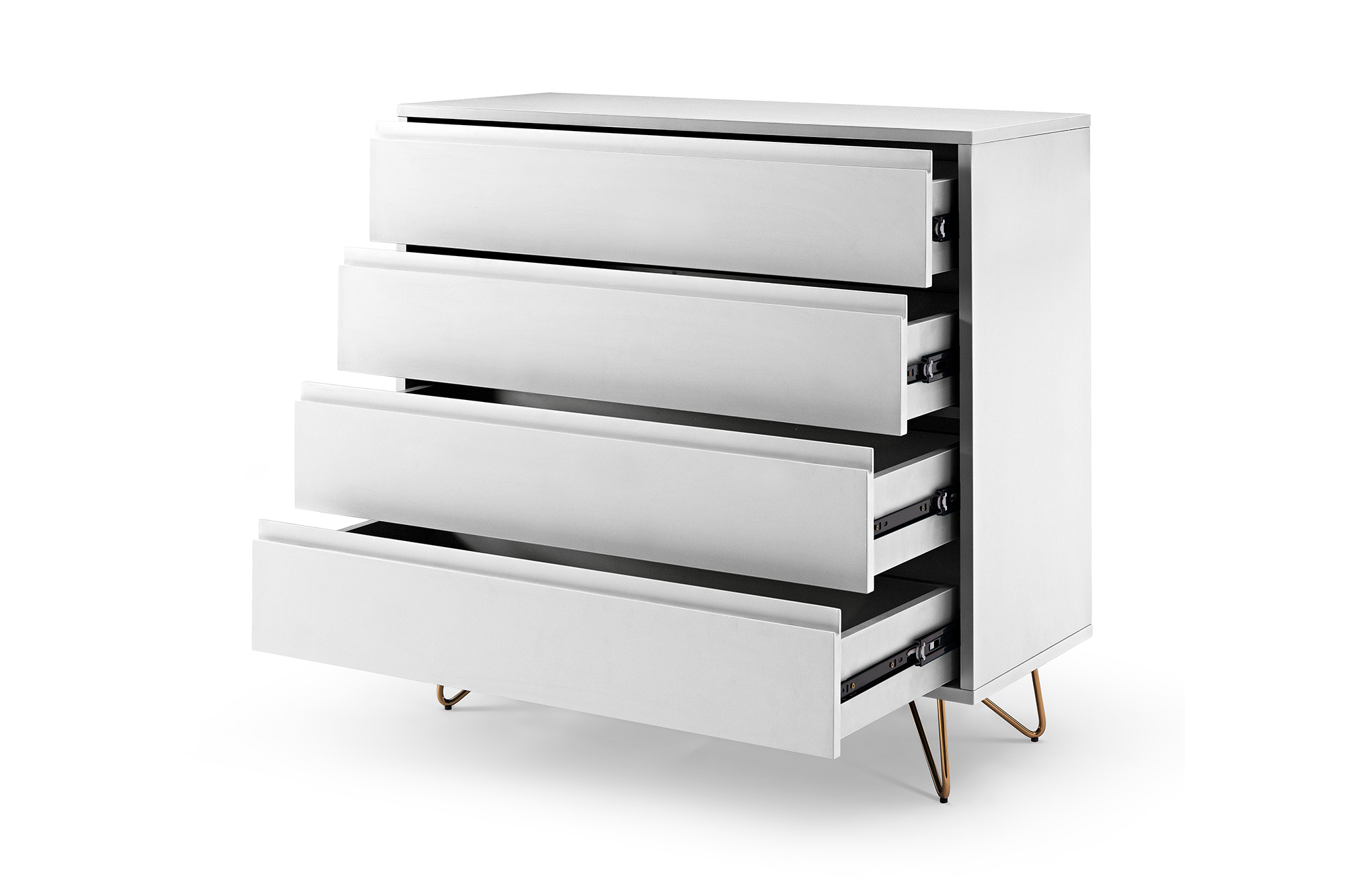 Cette commode moderne dans un joli design scandinave attirera tous les regards. L'association de teintes sobres et des pieds métalliques ton doré fait de cette commode un meuble très particulier. Grâce à quatre tiroirs spacieux, vous disposerez de beaucoup d'espace de rangement stylé pour les petites choses du quotidien. Le design scandinave moderne de cette commode large sera toujours tendance et se combinera à merveille avec votre ameublement déjà existant.