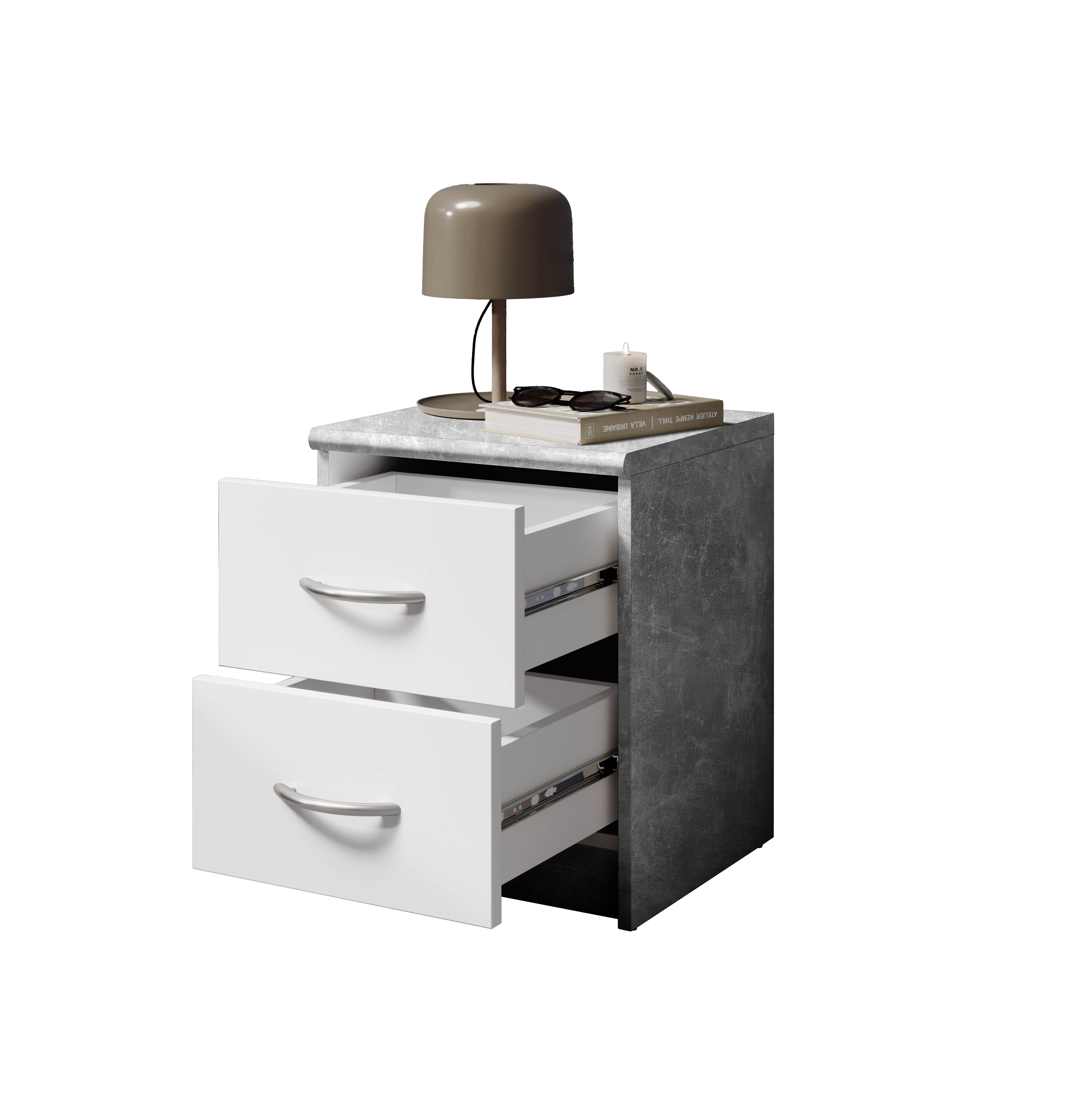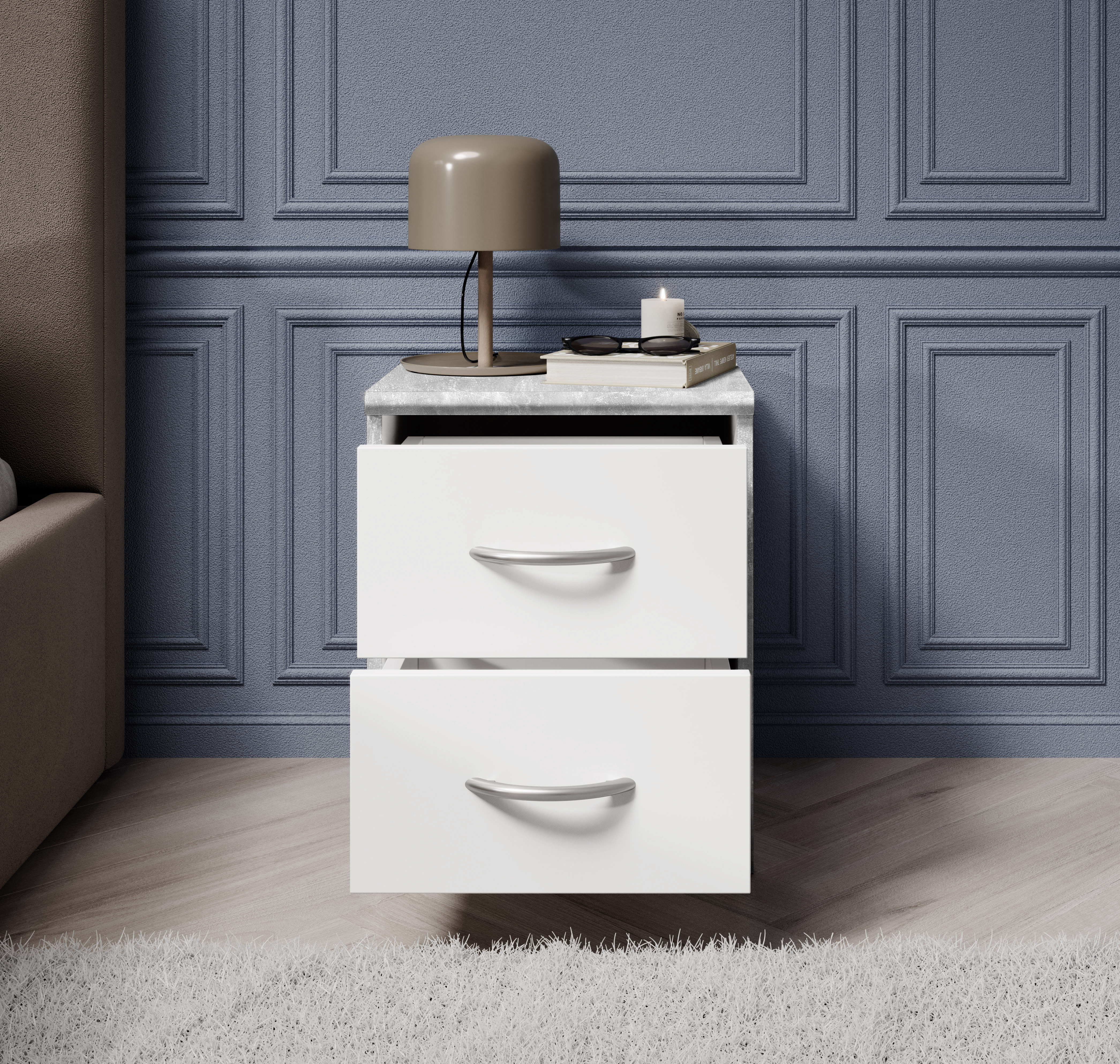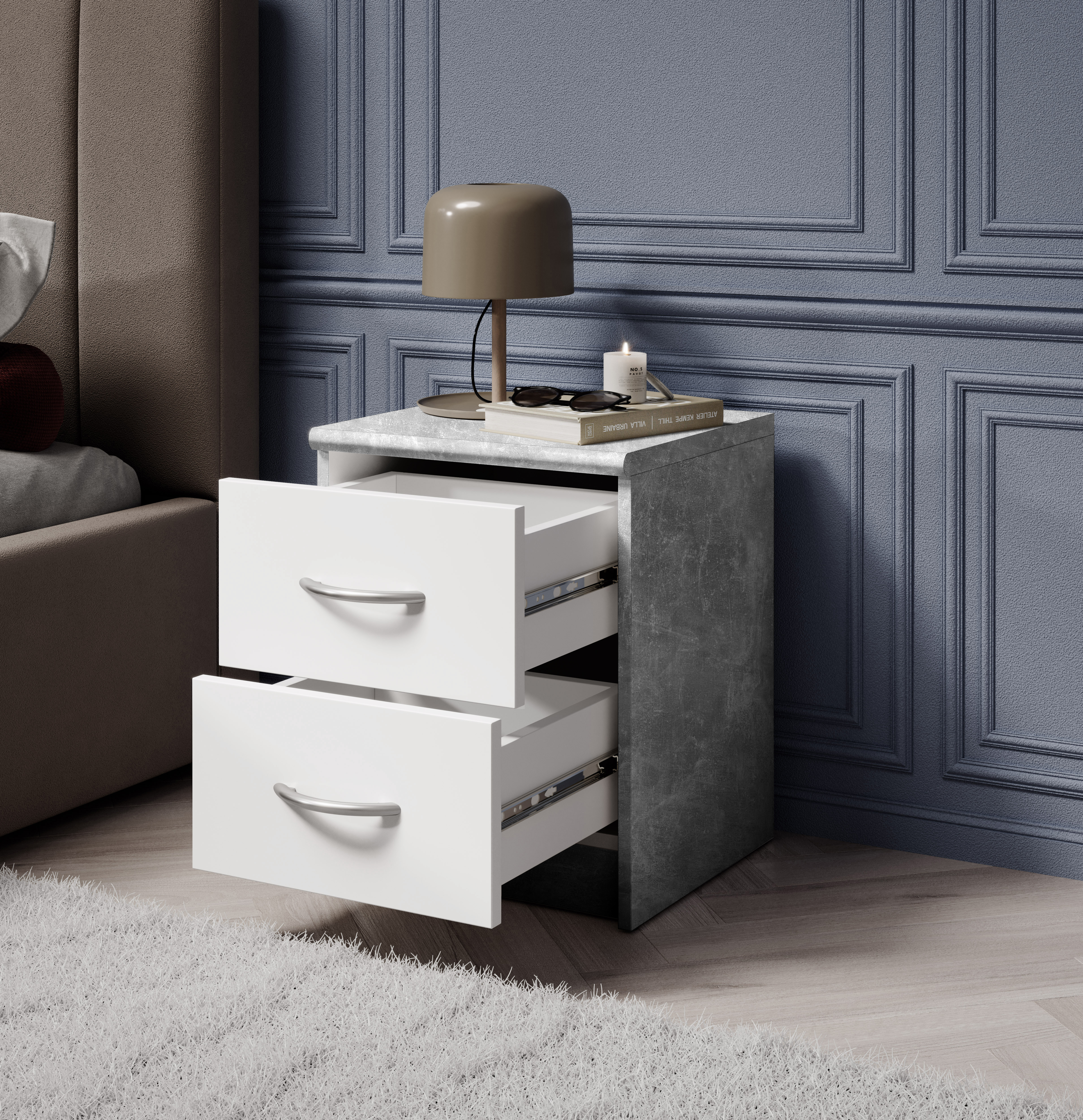 Avec deux tiroirs spacieux, elle crée de l’espace pour les objets du quotidien, la décoration ou le linge, tout en maintenant l’ordre dans la pièce. Les surfaces en panneaux bois blanc sont faciles à entretenir, résistantes aux rayures et simples à nettoyer.