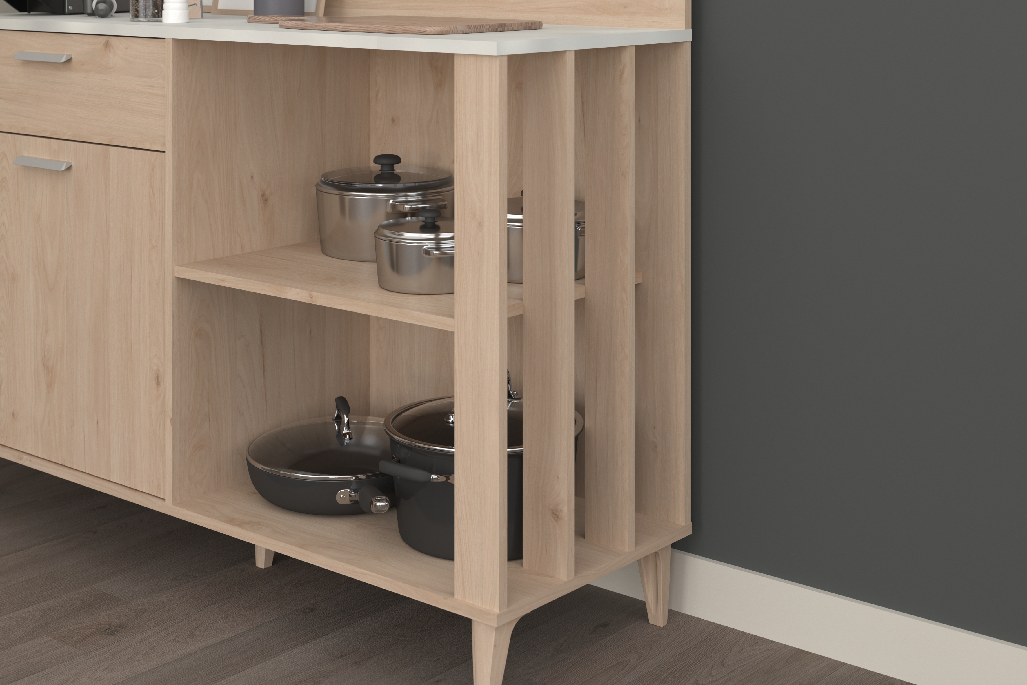 À gauche : 1 tiroir avec, en dessous, 1 porte et, derrière elle, 2 casiers