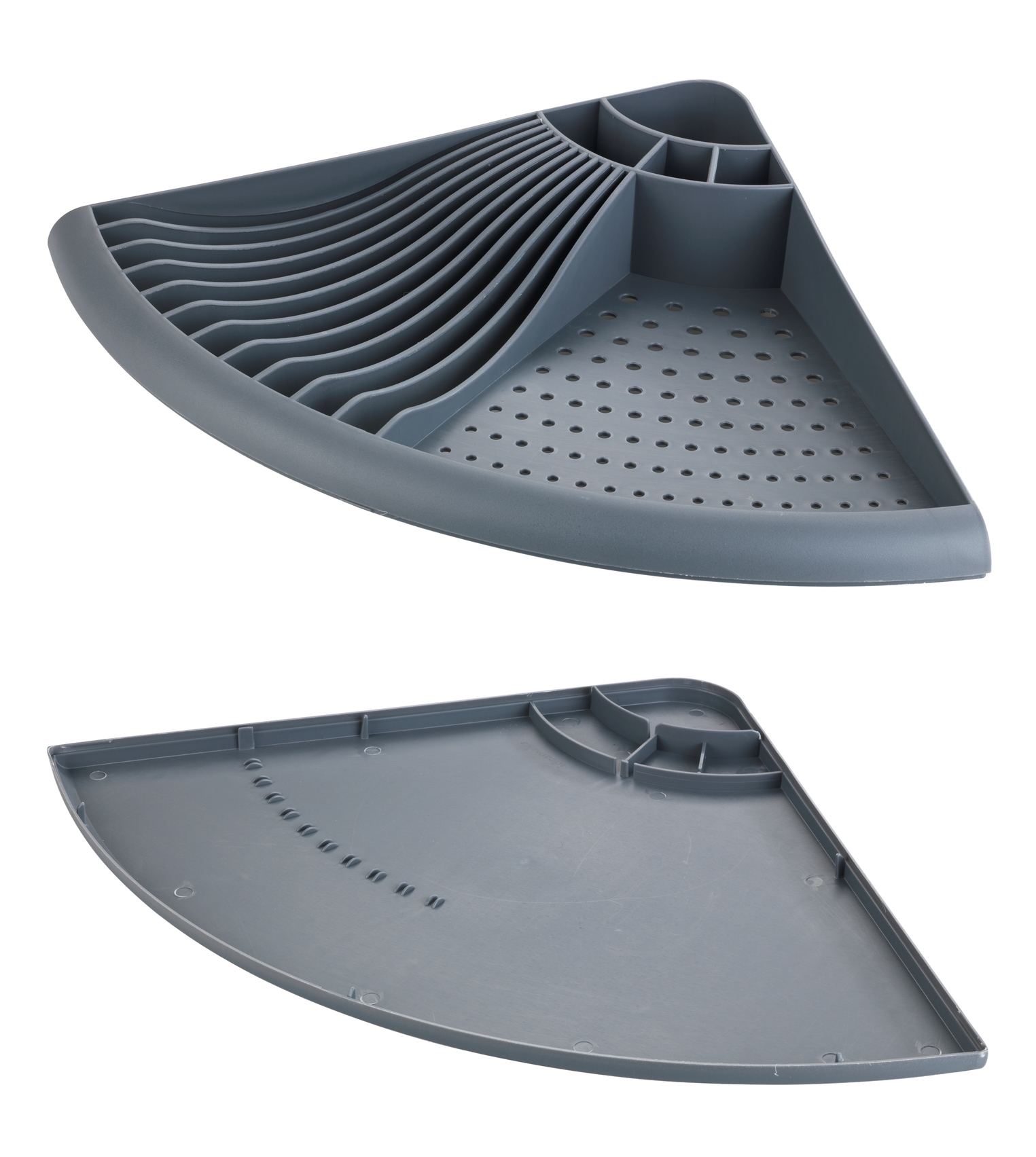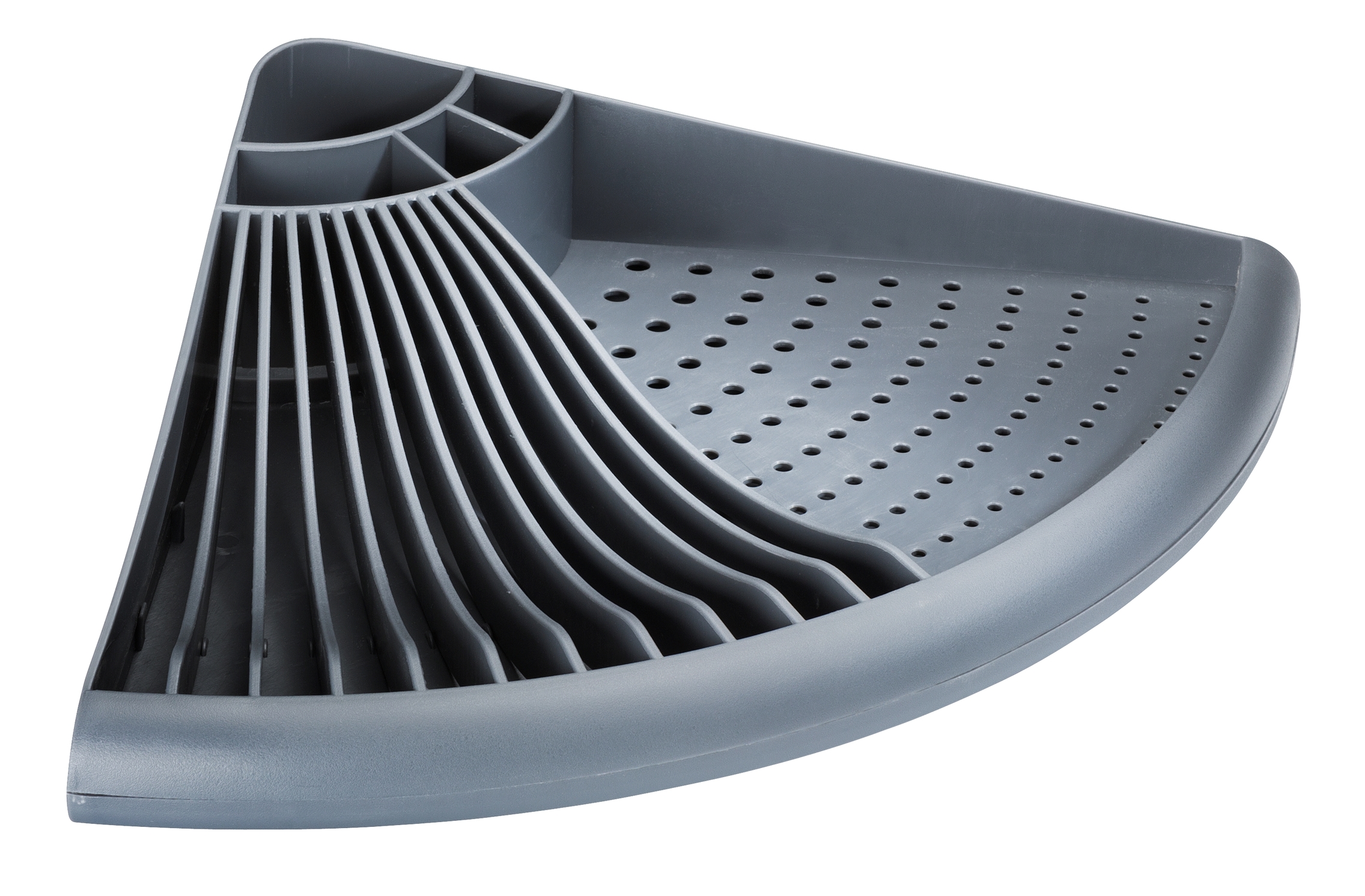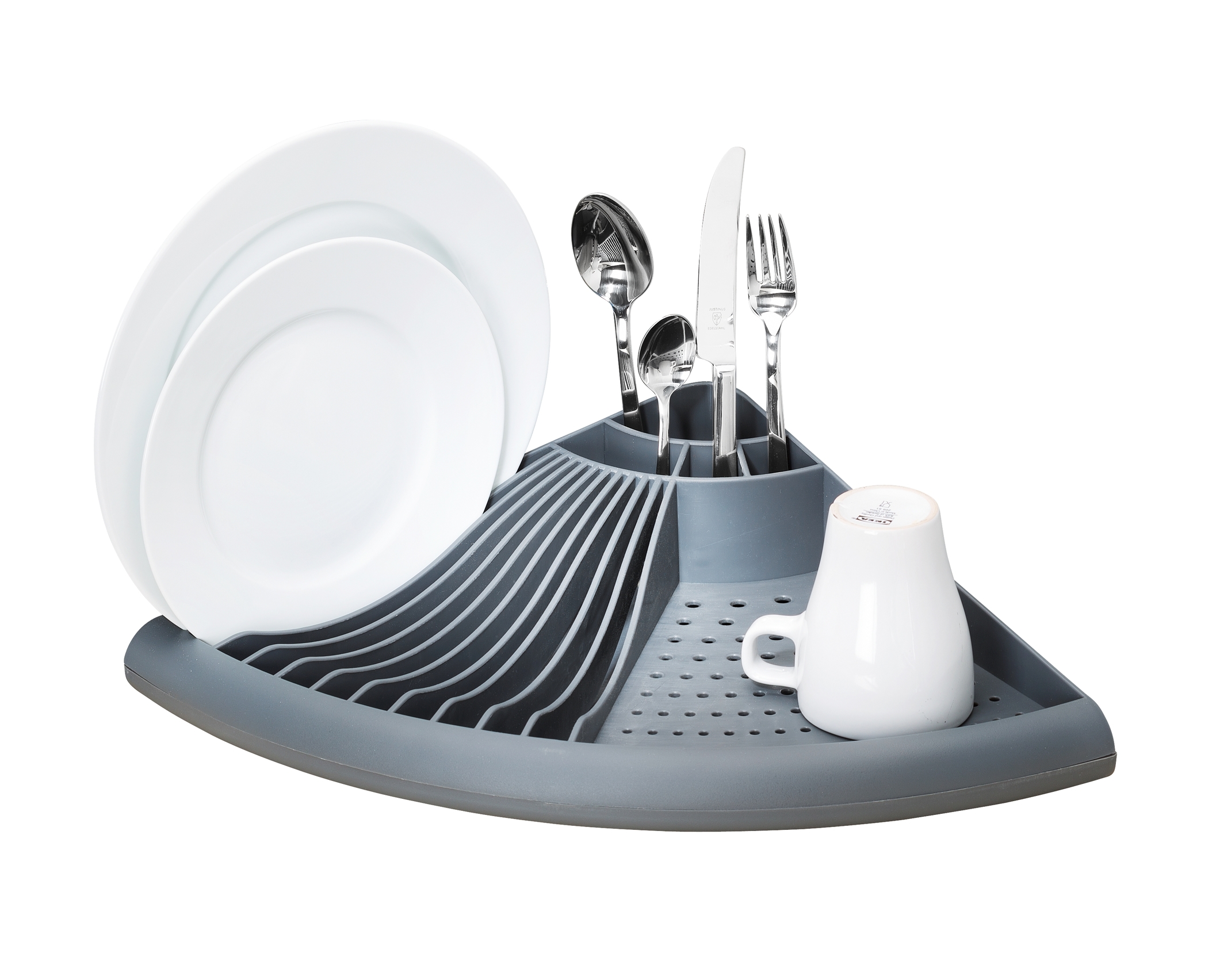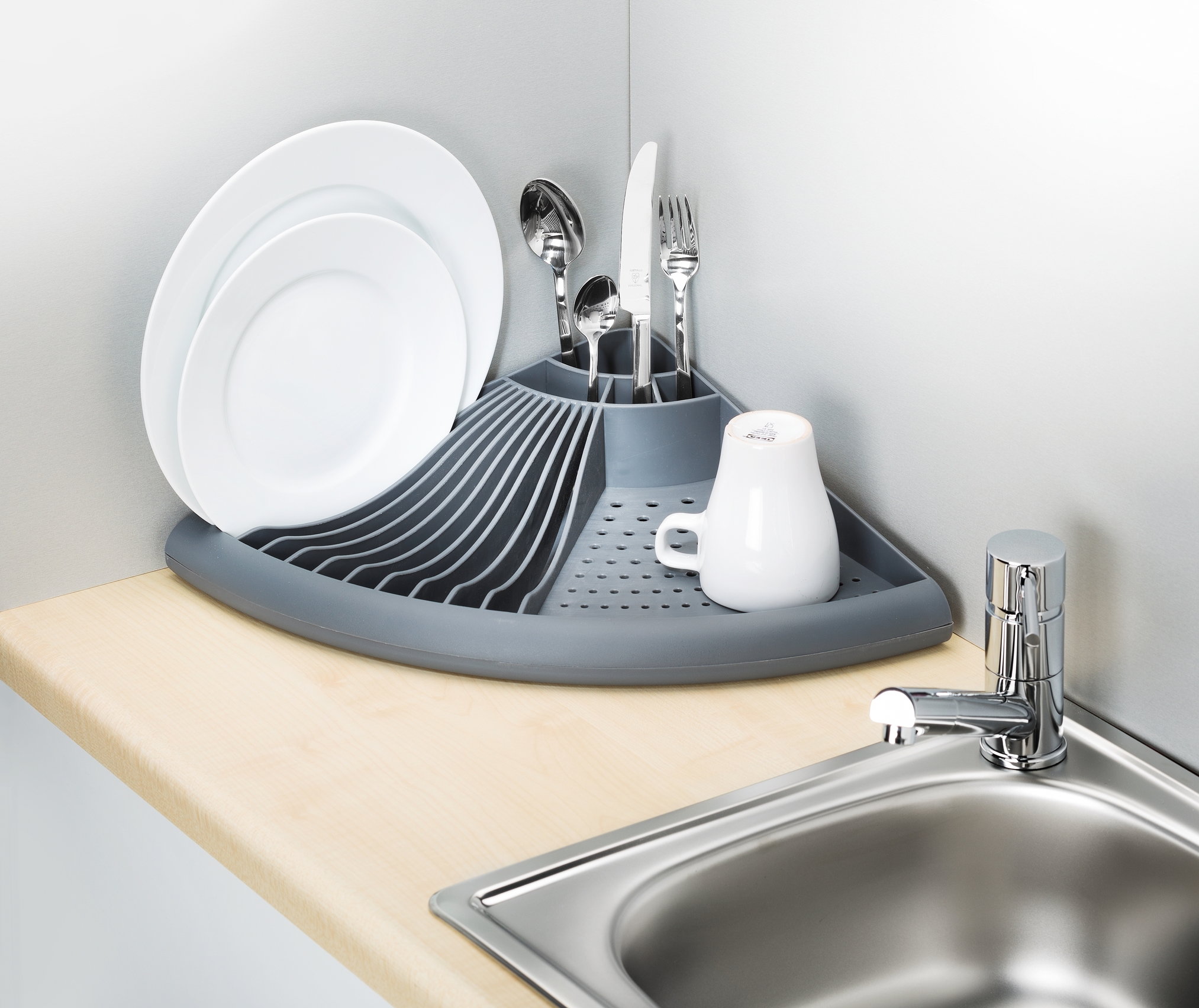 * Égouttoir à vaisselle moderne spécialement conçu pour les coins ; le plan de travail reste sec.