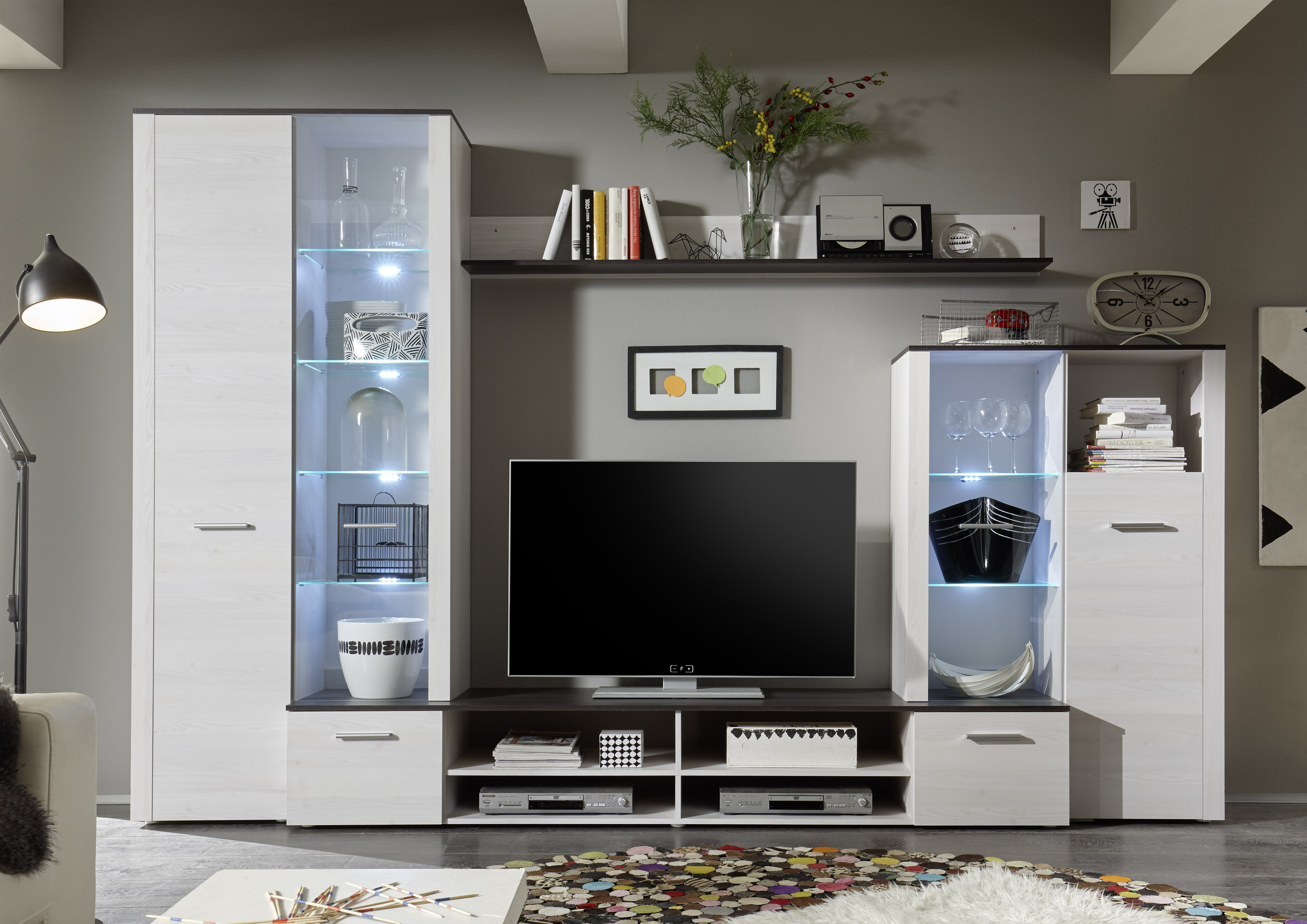Les éléments muraux DAKAR séduisent par un aspect tendance, une finition de grande qualité et un bel espace de rangement. Les éléments assortis les uns aux autres créent un ensemble harmonieux. Placez votre téléviseur au centre du meuble bas et profitez de soirées télé conviviales. Deux meubles vitrines de tailles différentes offrent de la place pour ranger différents objets du quotidien et autres décorations, tout en conférant à ce mur TV un cadre élégant.