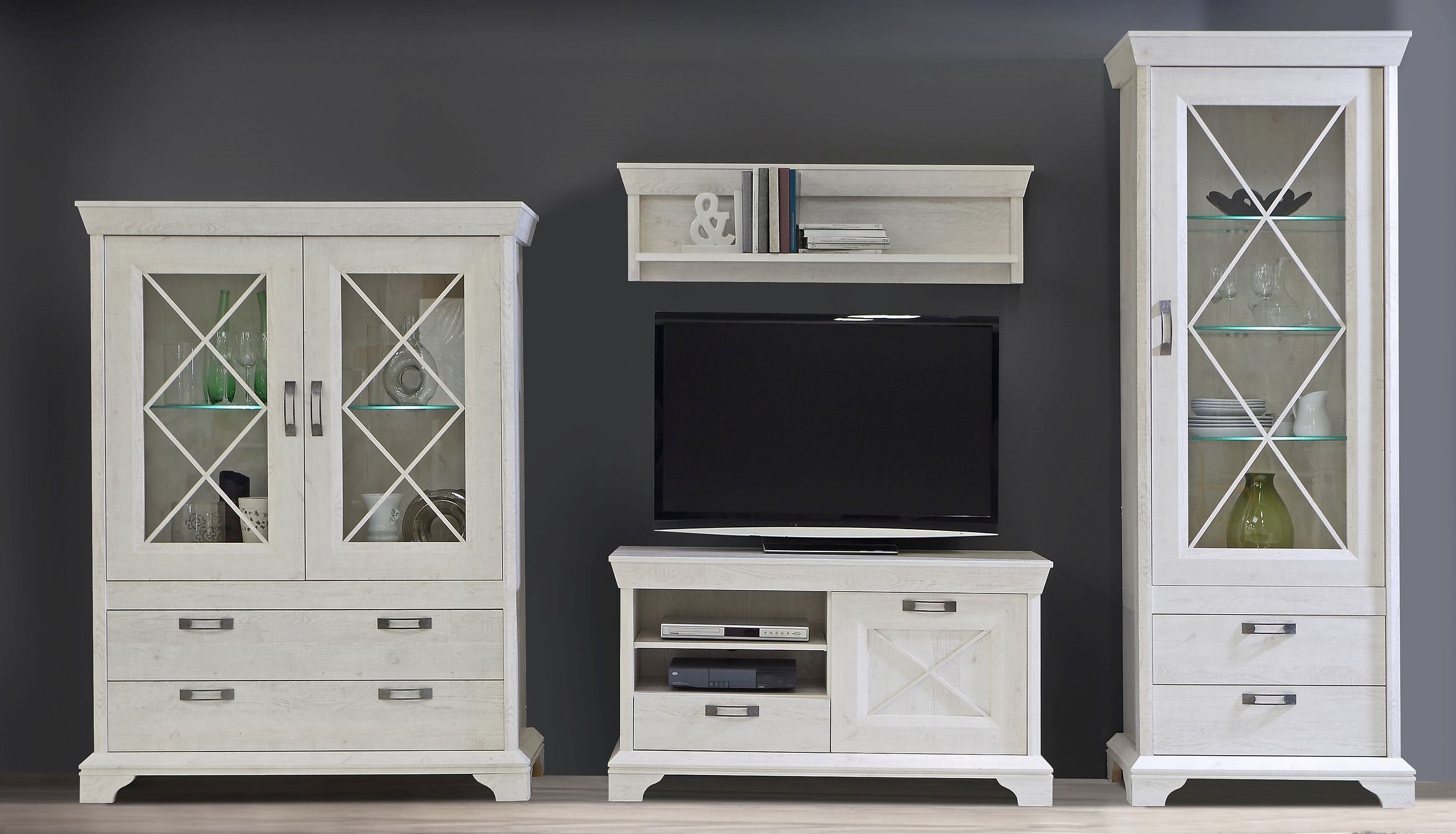 Éléments muraux KASHMIR, ton blanc, 3,44 m de largeur, aspect vieilli, poignées métalliques