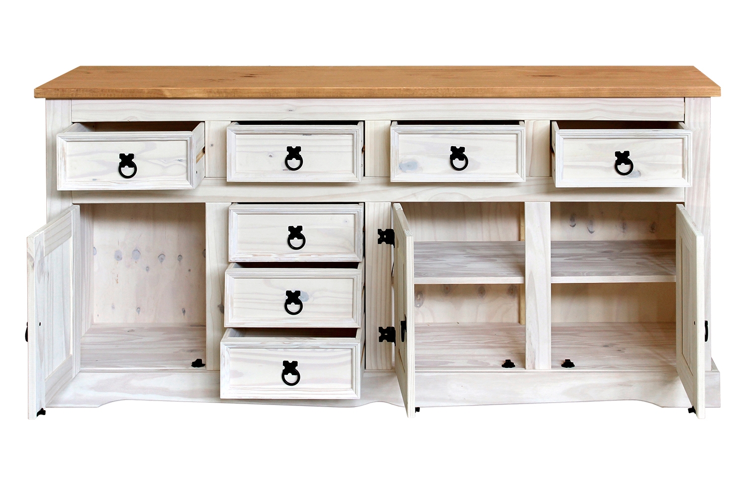 Cette enfilade laquée ton blanc est fabriquée en pin massif. Le panneau supérieur est laqué dans un ton miel chaleureux. L’enfilade offre un bel espace de rangement pour différents objets dans 7 tiroirs et derrière 3 portes. Le socle est dans une forme ondulée. Le bahut attirera tous les regards dans votre salon, votre salle à manger ou votre entrée. Les détails laqués ton noir et les poignées décoratives confèrent à ce buffet charme exceptionnel. Le buffet n'est pas seulement chic : il remplit aussi son objectif en termes de fonctionnalité.