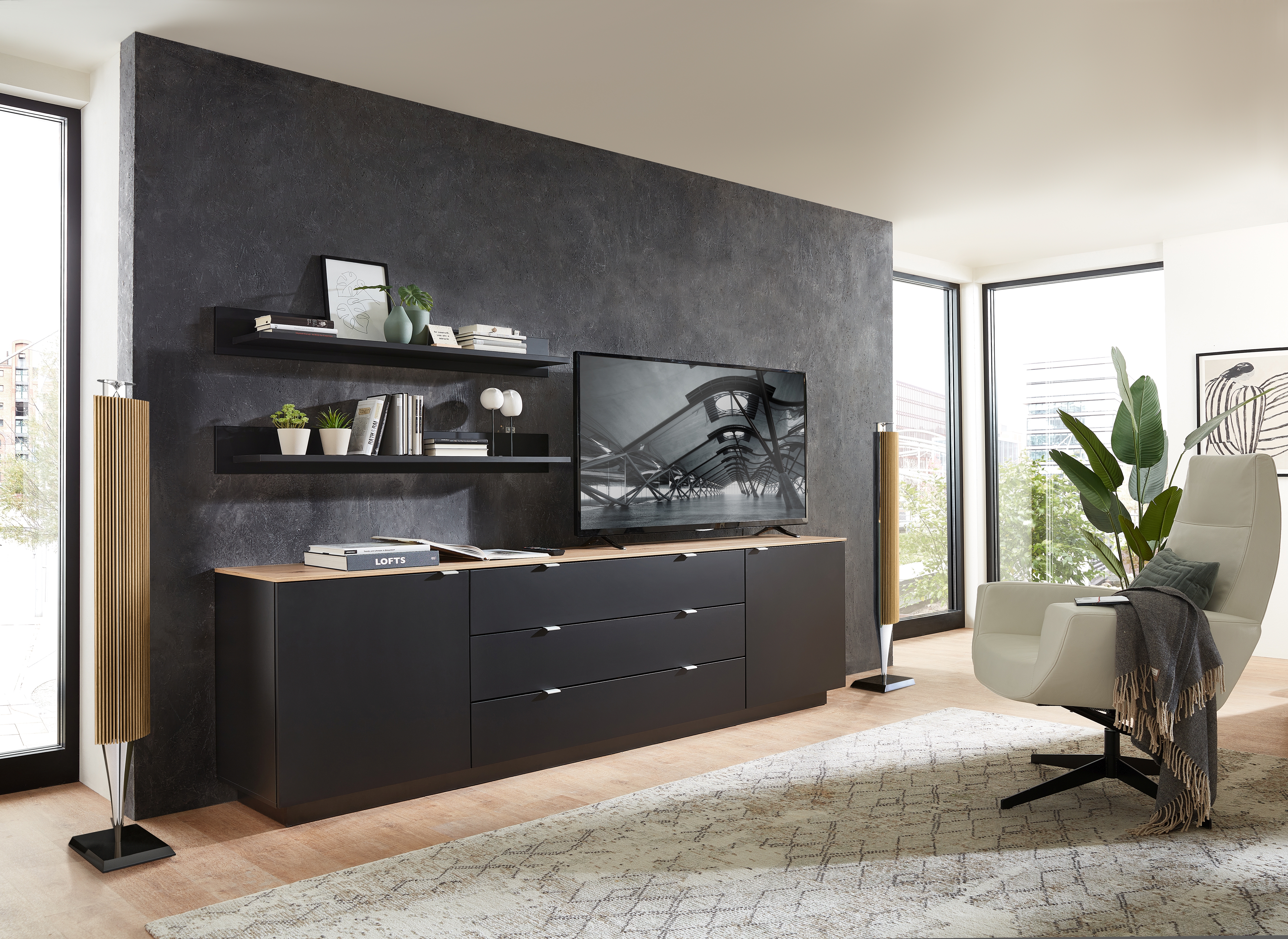 Caisson : ton noir avec panneau supérieur décor chêne Artisan