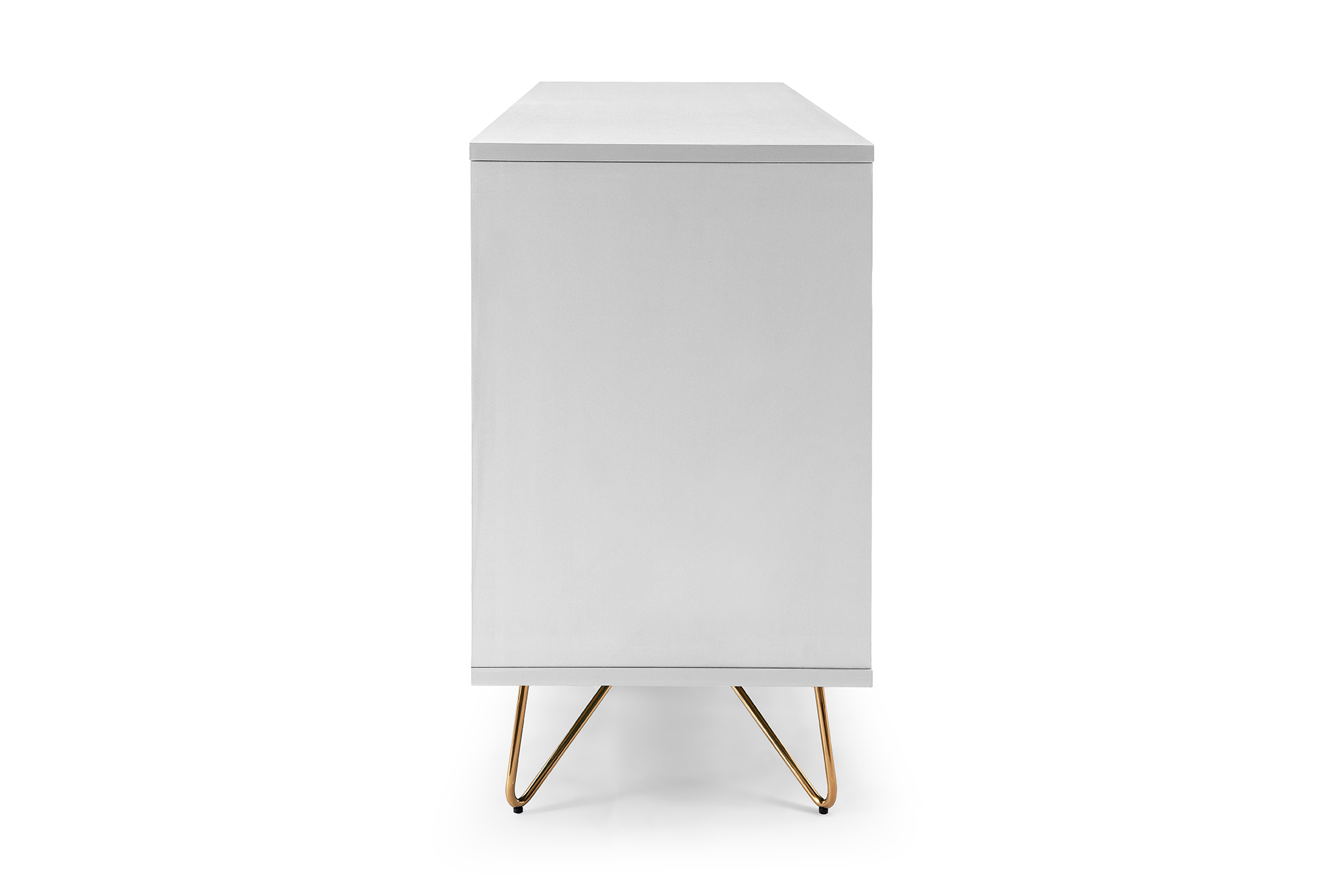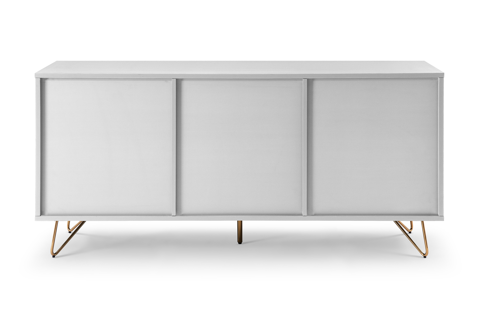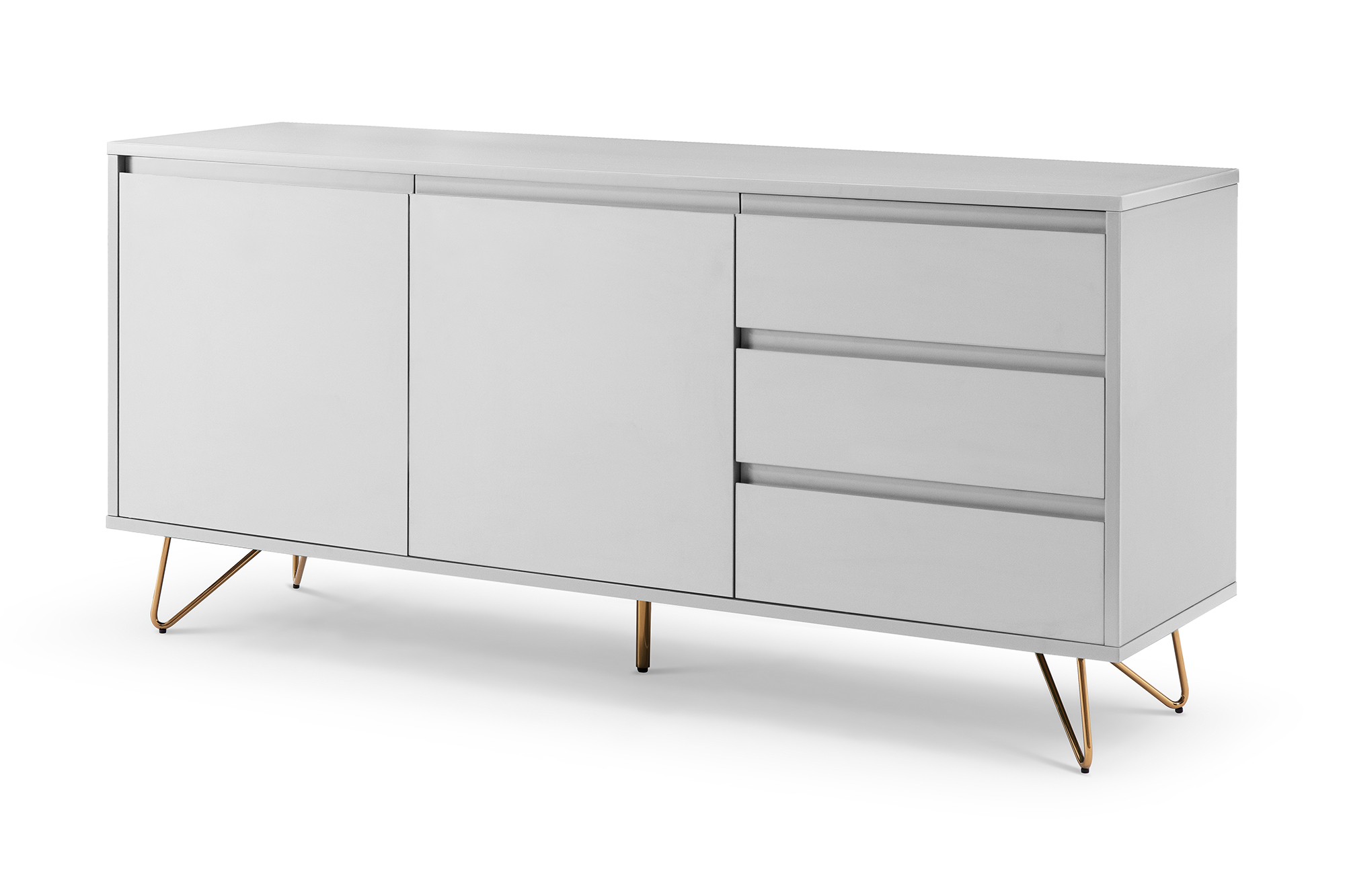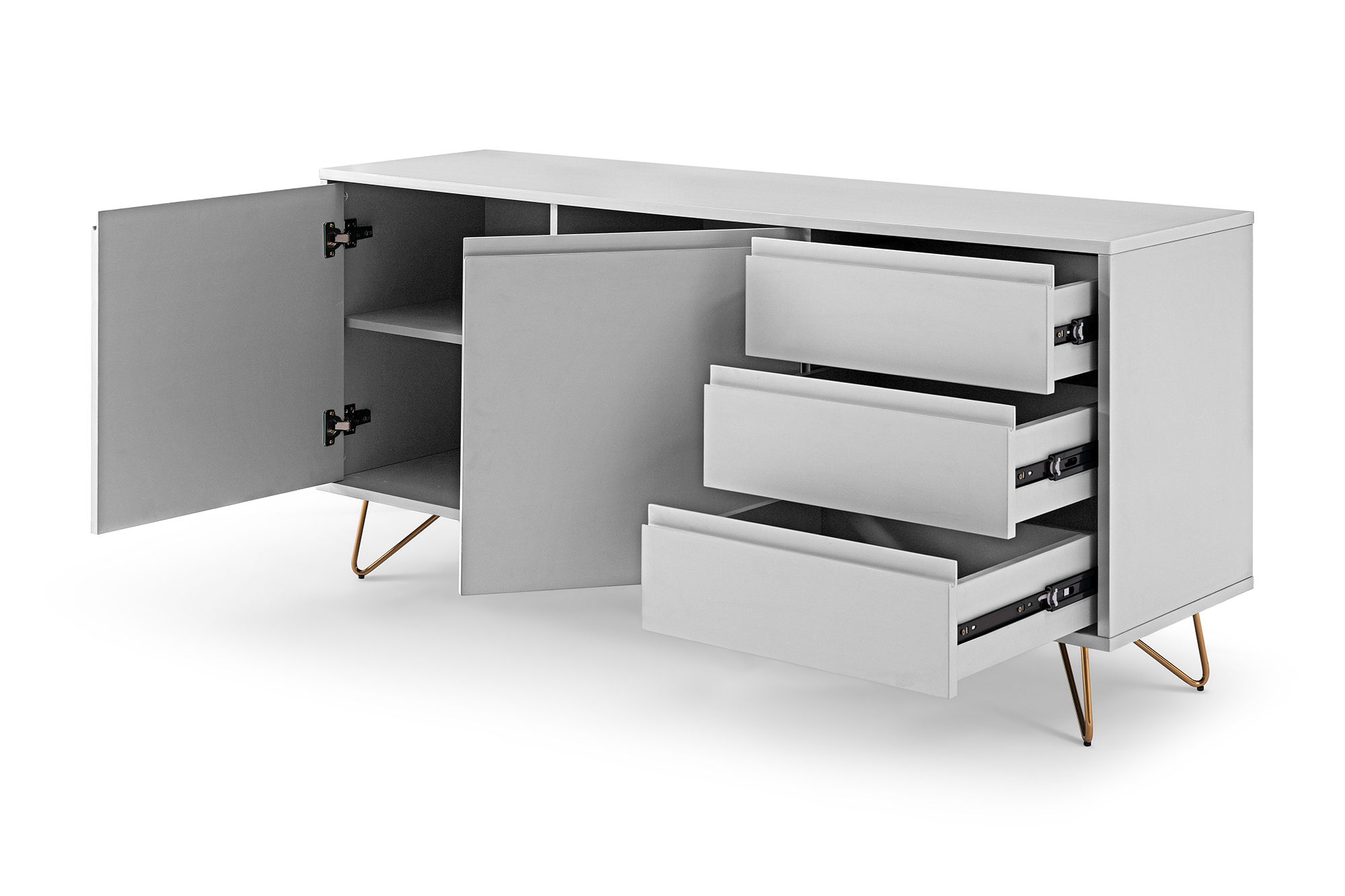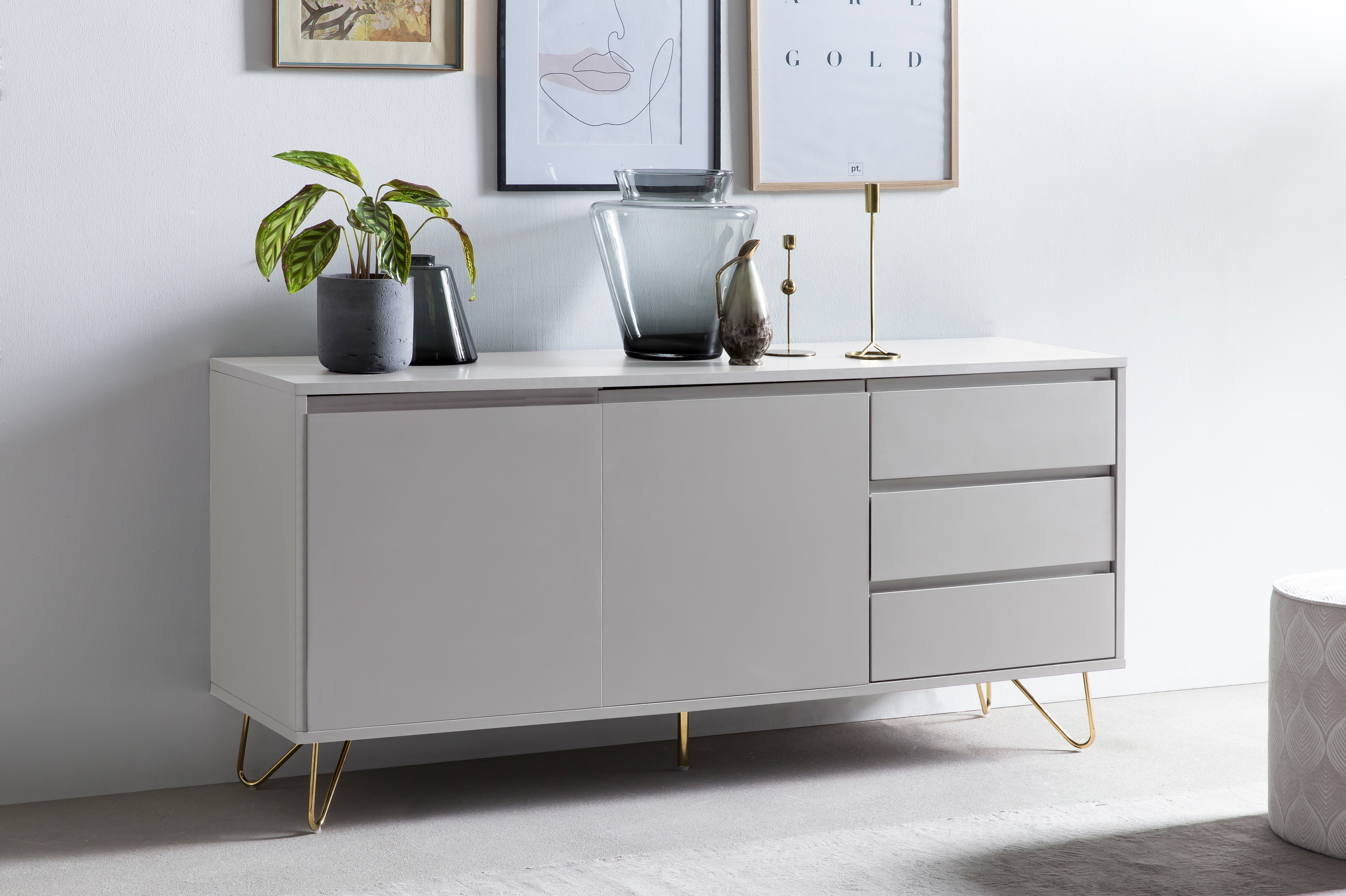 Cette enfilade au design scandinave attirera tous les regards dans votre intérieur. L'association entre teintes sobres et pieds métalliques ton doré fait de ce bahut un meuble très particulier. Grâce à deux portes et trois tiroirs, vous disposerez d'un grand espace rangement stylé pour les objets du quotidien. Derrière les deux portes se cachent deux tablettes réglables. Le design scandinave moderne de ce buffet sera toujours tendance tout en se combinant à merveille avec l'ameublement déjà existant.