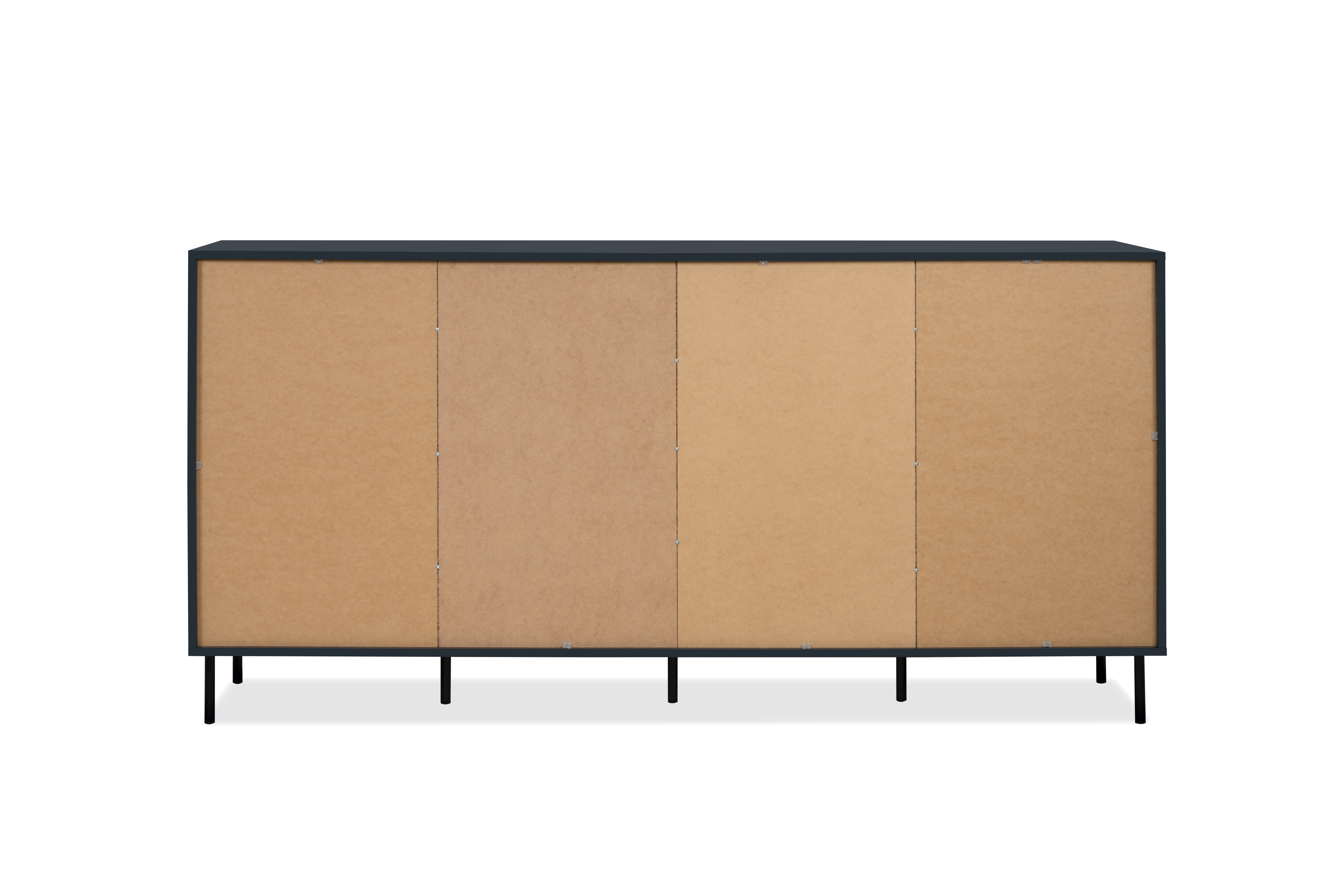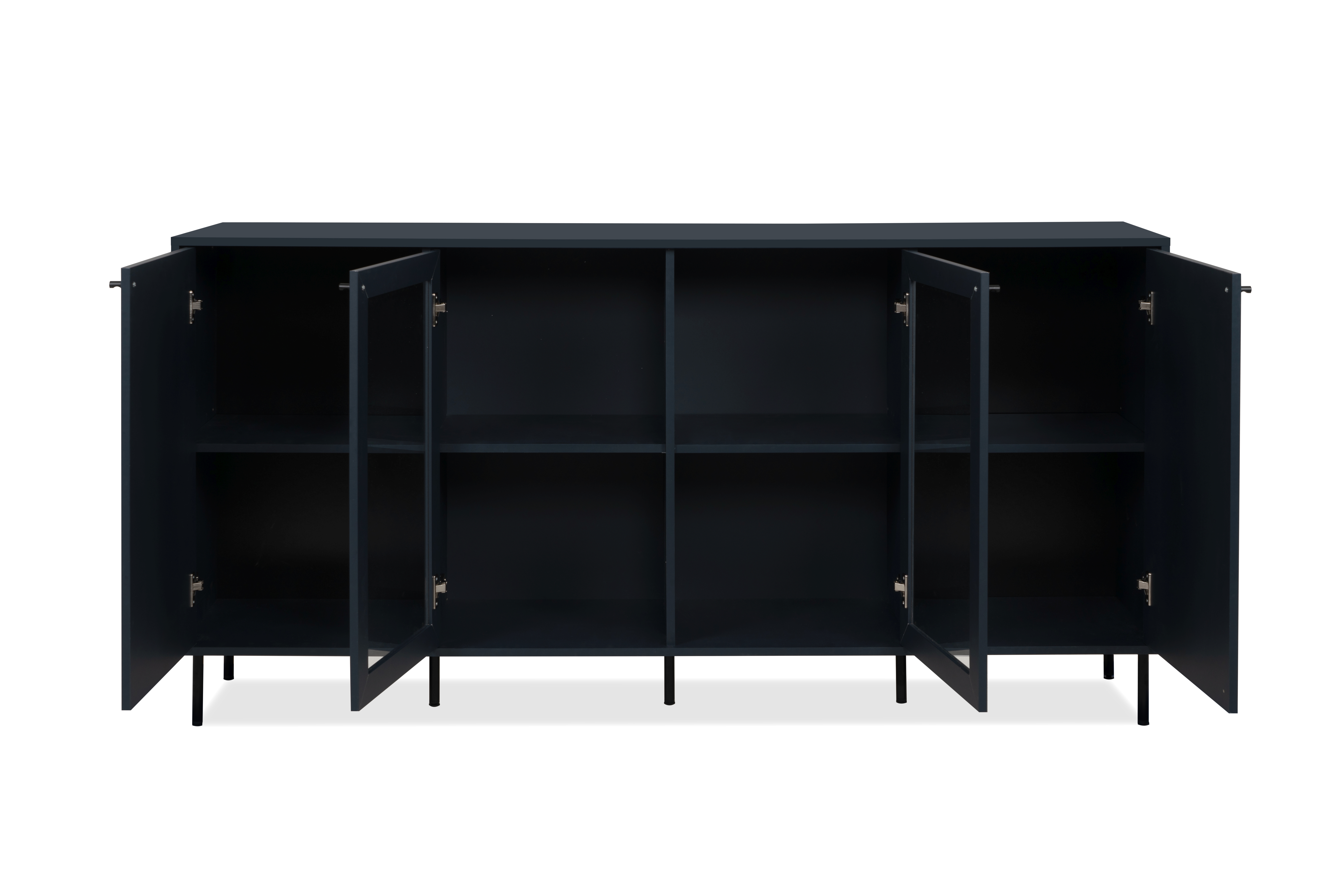 En partant de la gauche : 1 porte et 1 tablette amovible, 1 porte en verre avec encadrement et 1 tablette amovible, 1 porte en verre avec encadrement et 1 tablette amovible, 1 porte et 1 tablette amovible