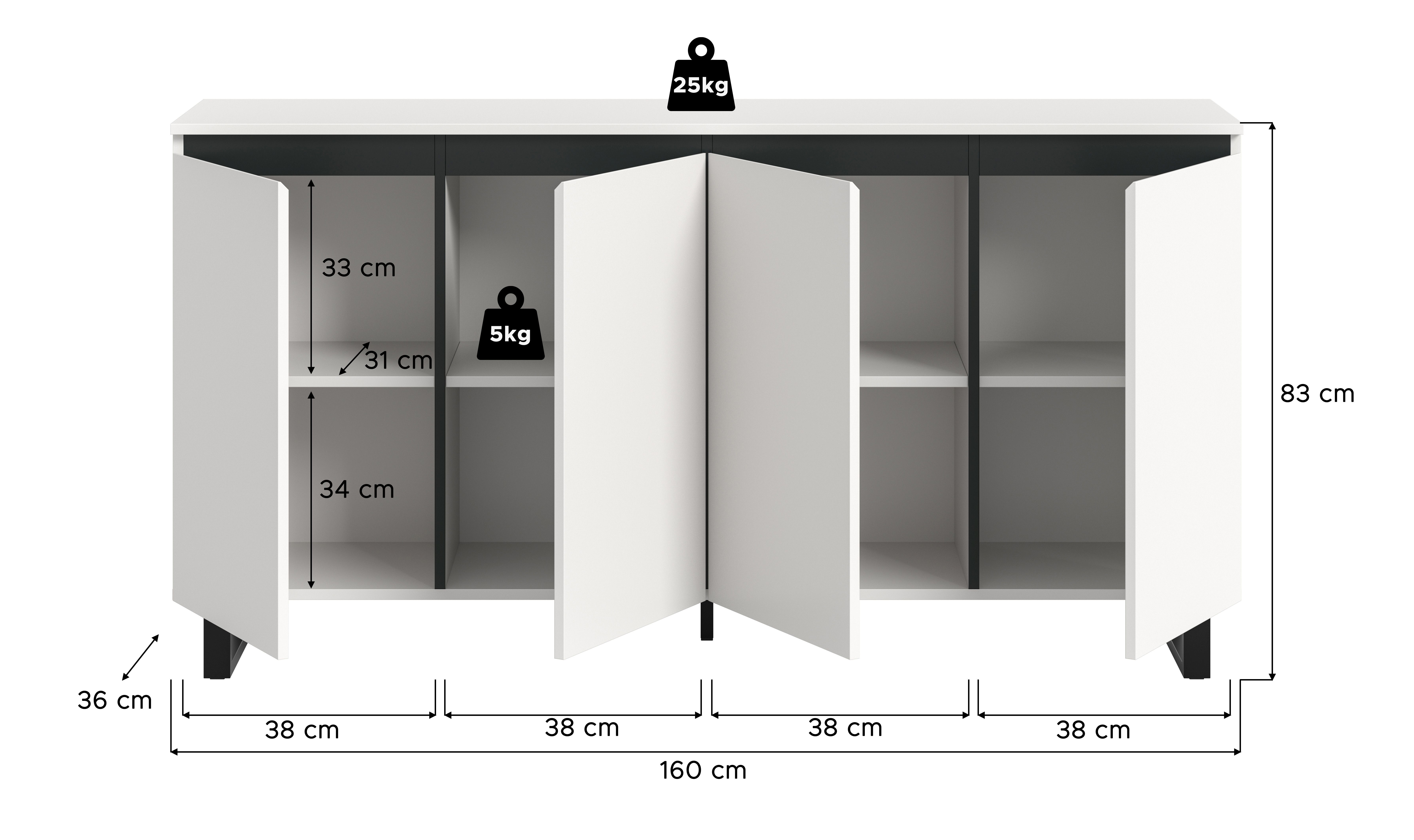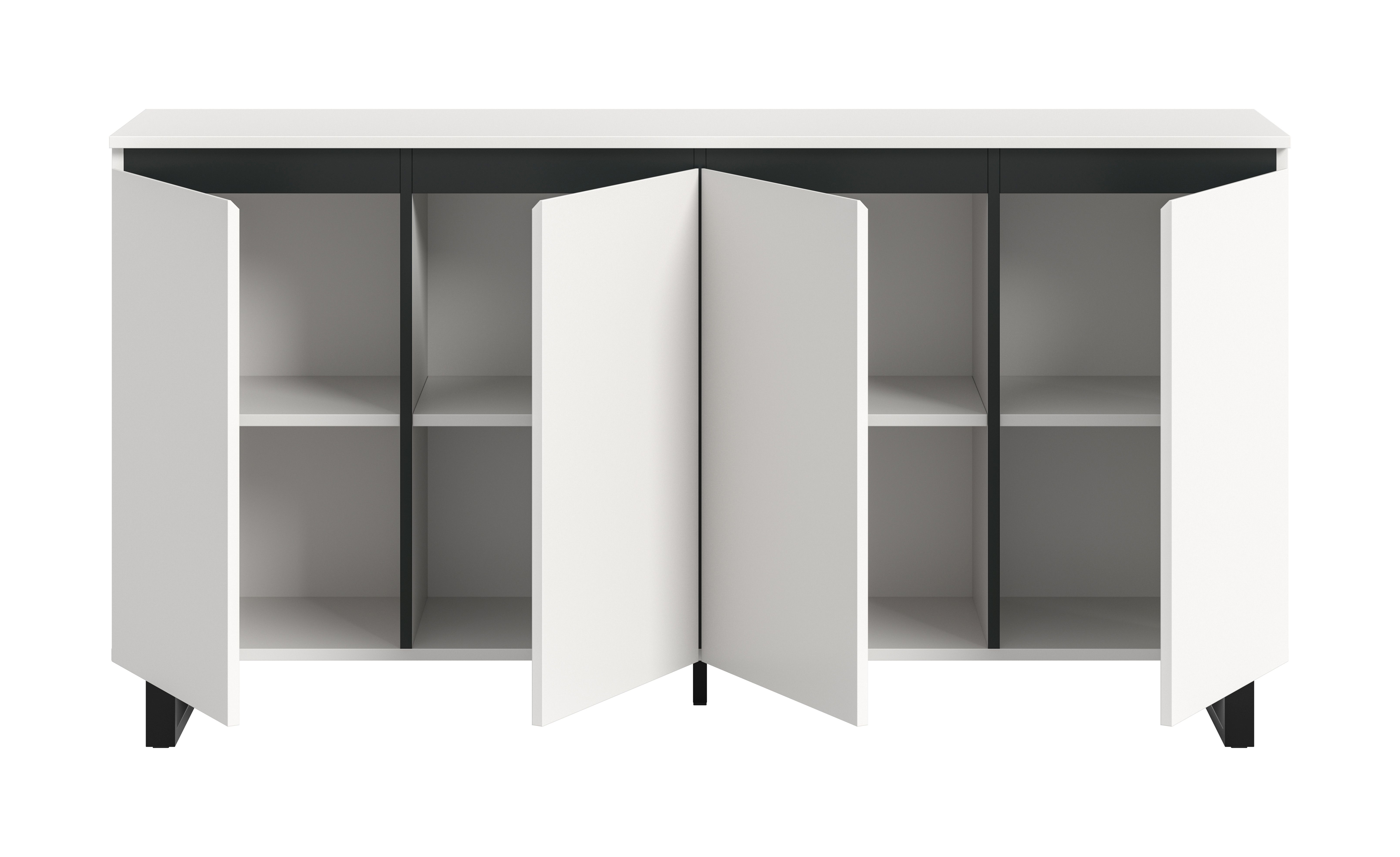 - 4 portes, 4 tablettes amovibles réglables en hauteur, 8 compartiments