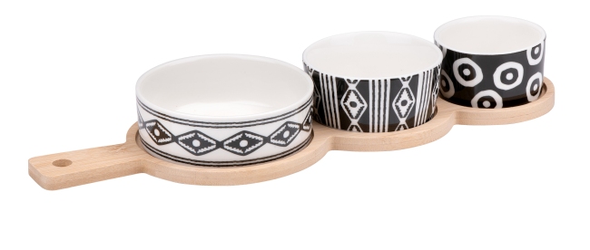 1 ensemble à tapas 4 pièces comprenant 3 ramequins et 1 plateau en bois