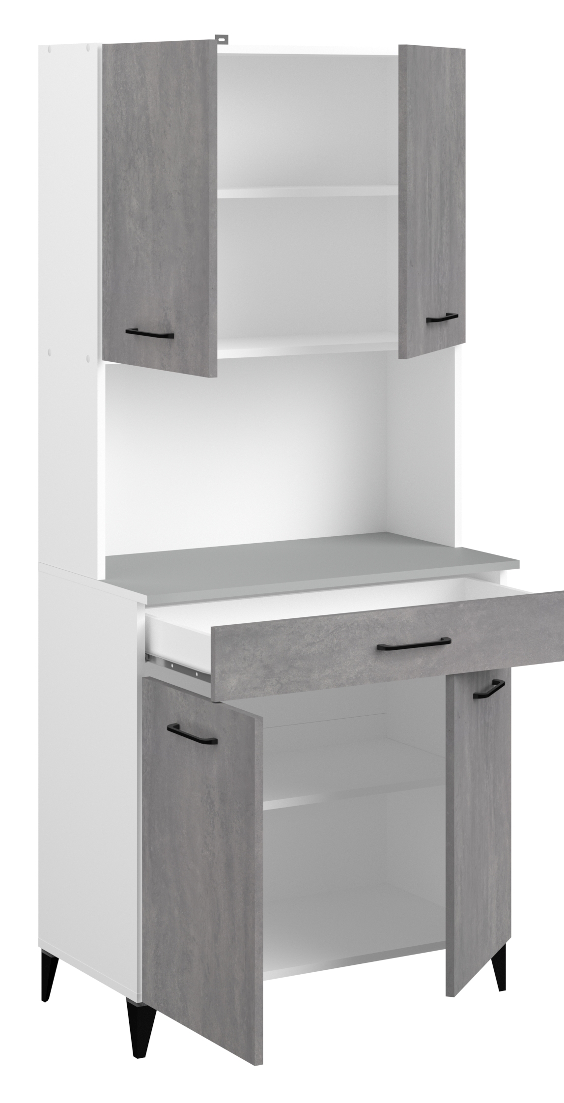 En bas : 1 tiroir avec, en dessous, 2 portes et, derrière elles, 2 casiers