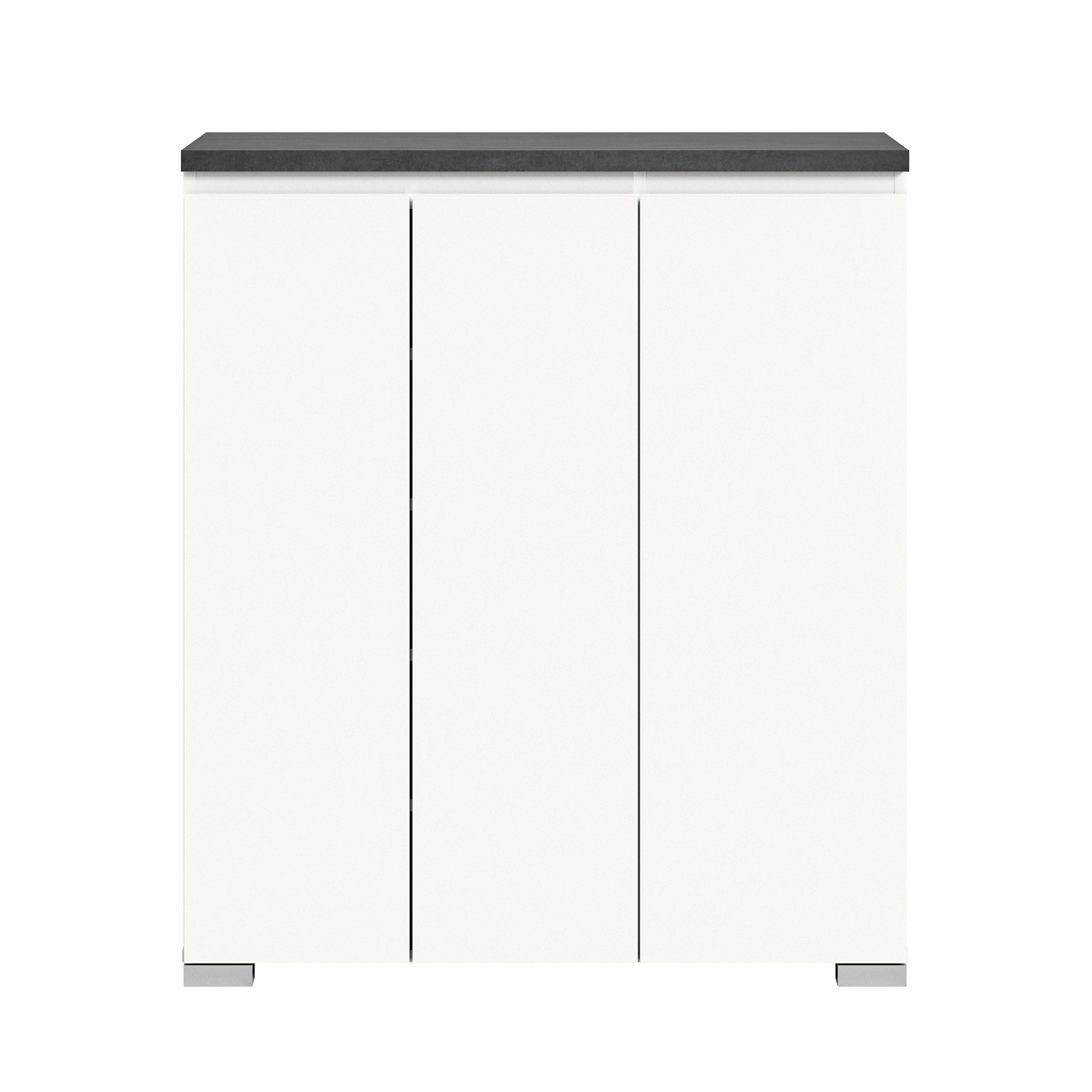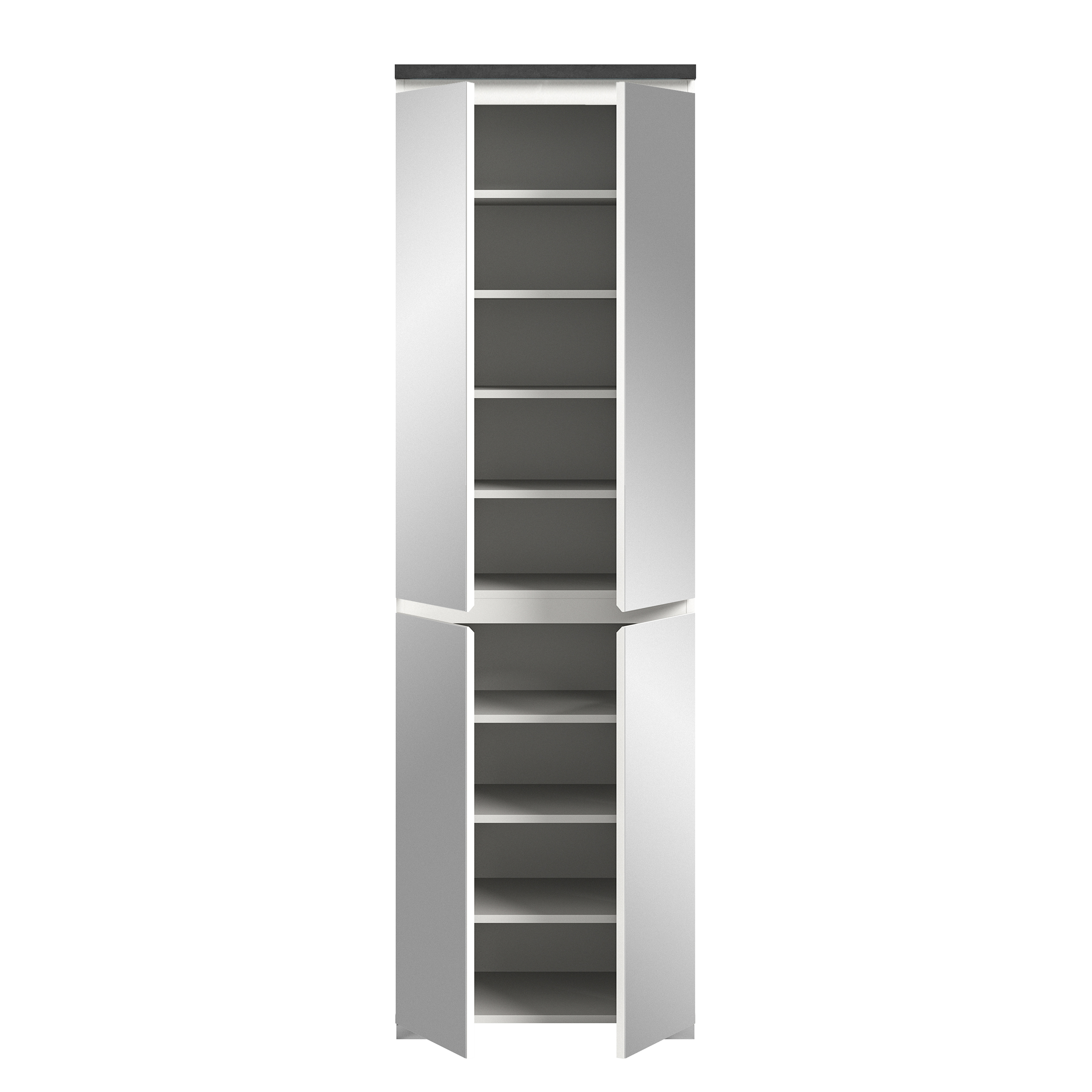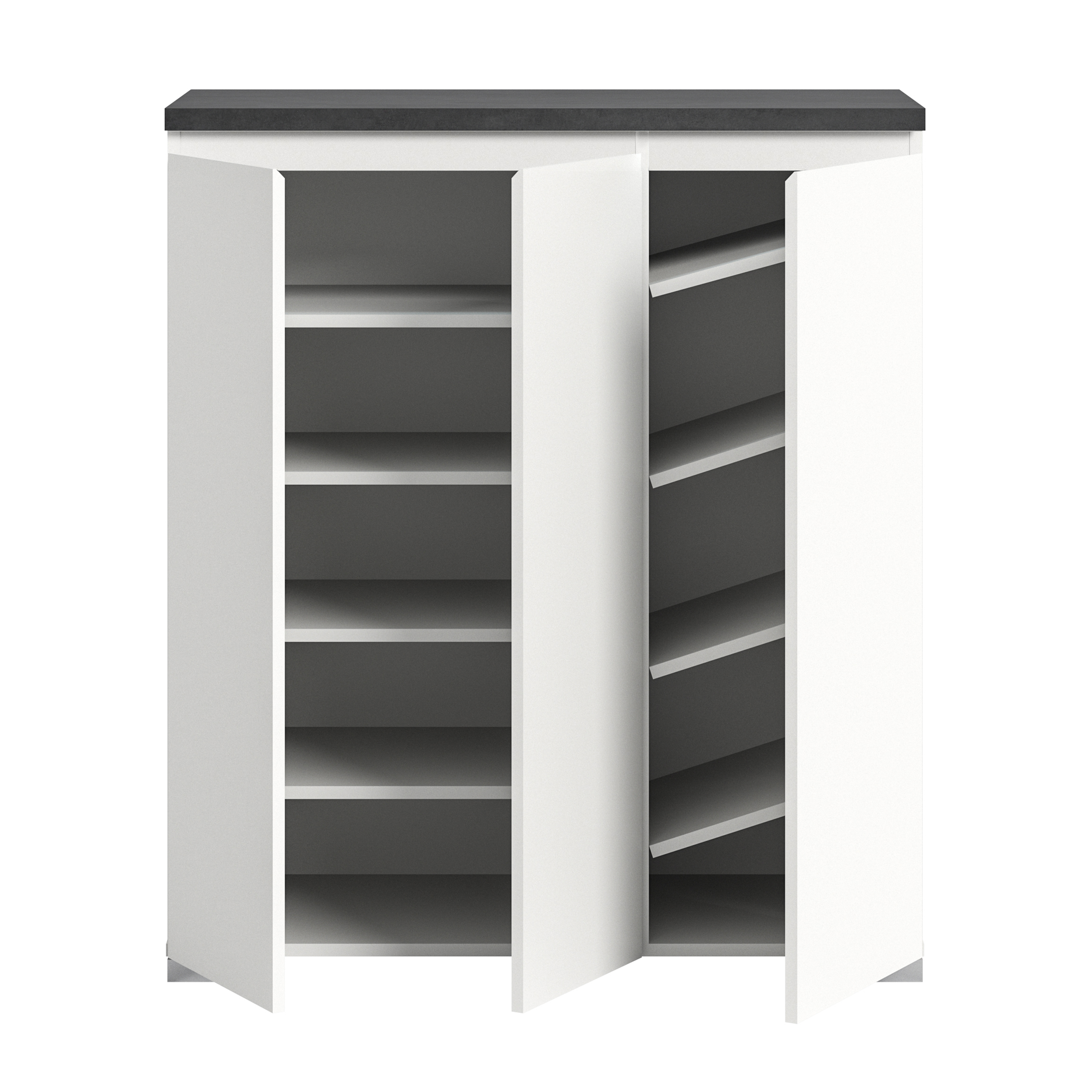 Comprenant une armoire avec miroir et un bahut dans un décor ton blanc et gris, cet ensemble de meubles à chaussures est la solution idéale pour combiner ordre et style dans votre entrée.