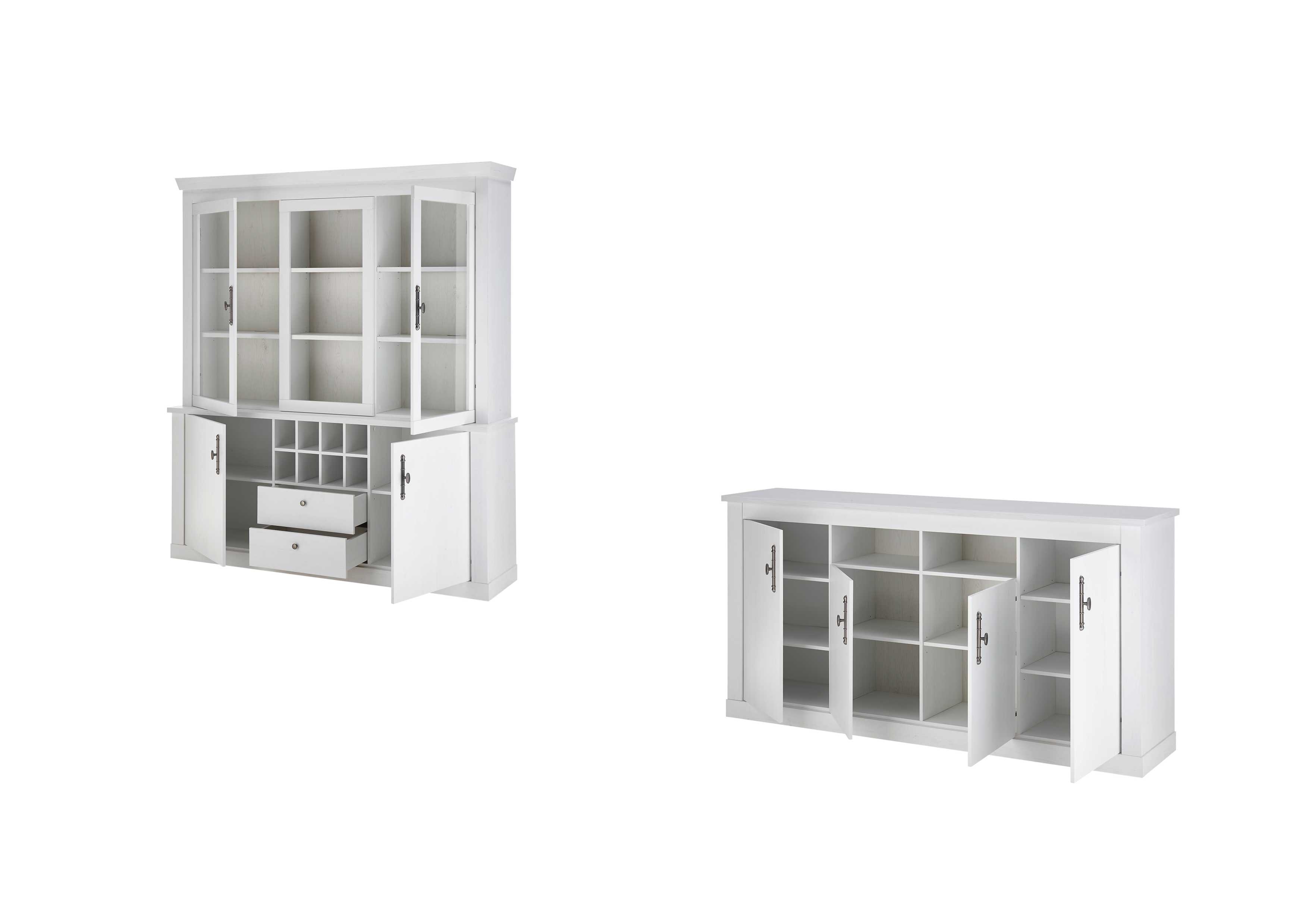 1 vaisselier avec 2 portes (et, derrière chacune d’elle, 1 tablette), au centre : 2 tiroirs et 1 rangement pour bouteilles avec 8 casiers, en haut : 1 élément rehausse comprenant 2 portes en verre avec encadrement, 4 tablettes et 3 casiers ouverts