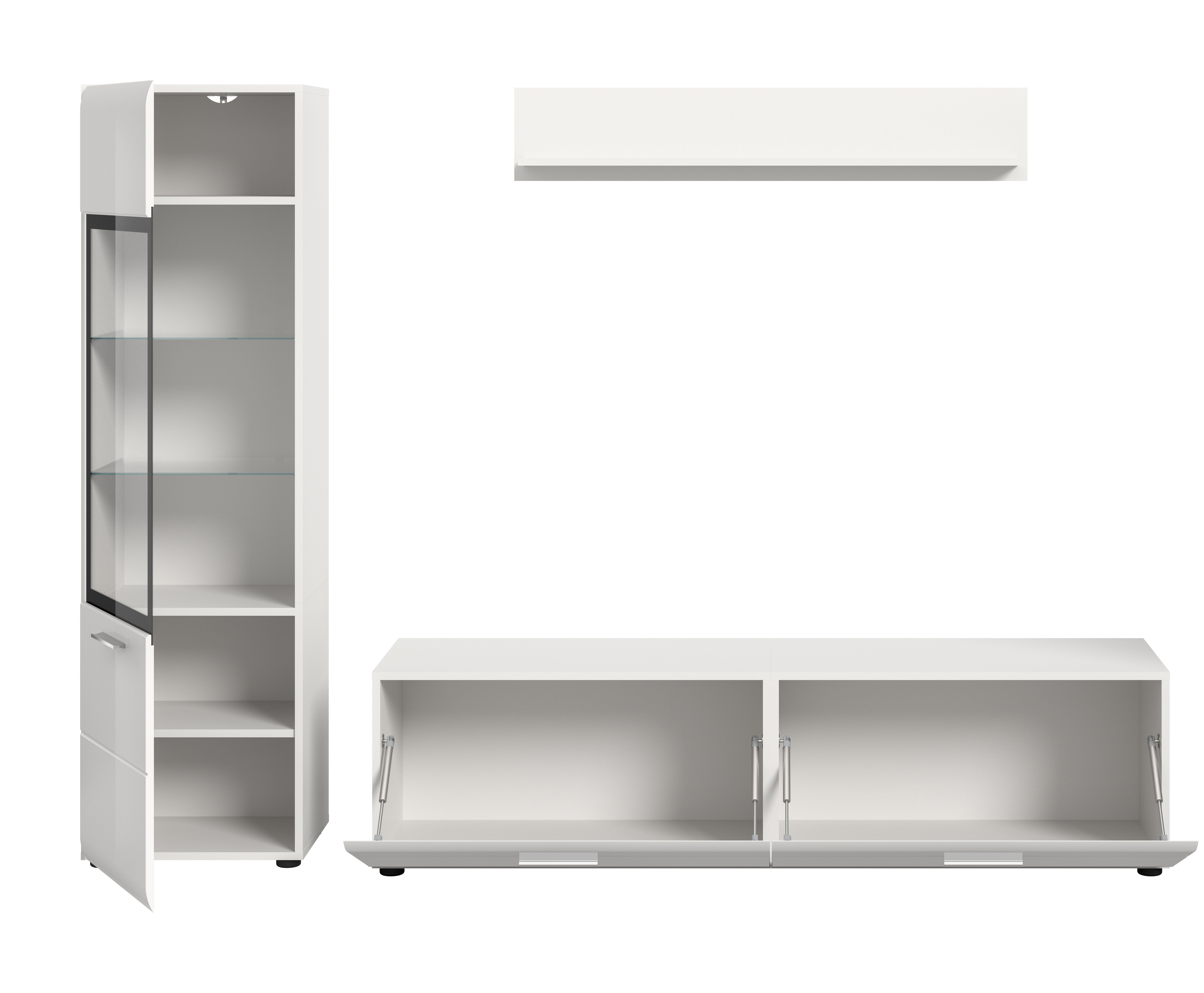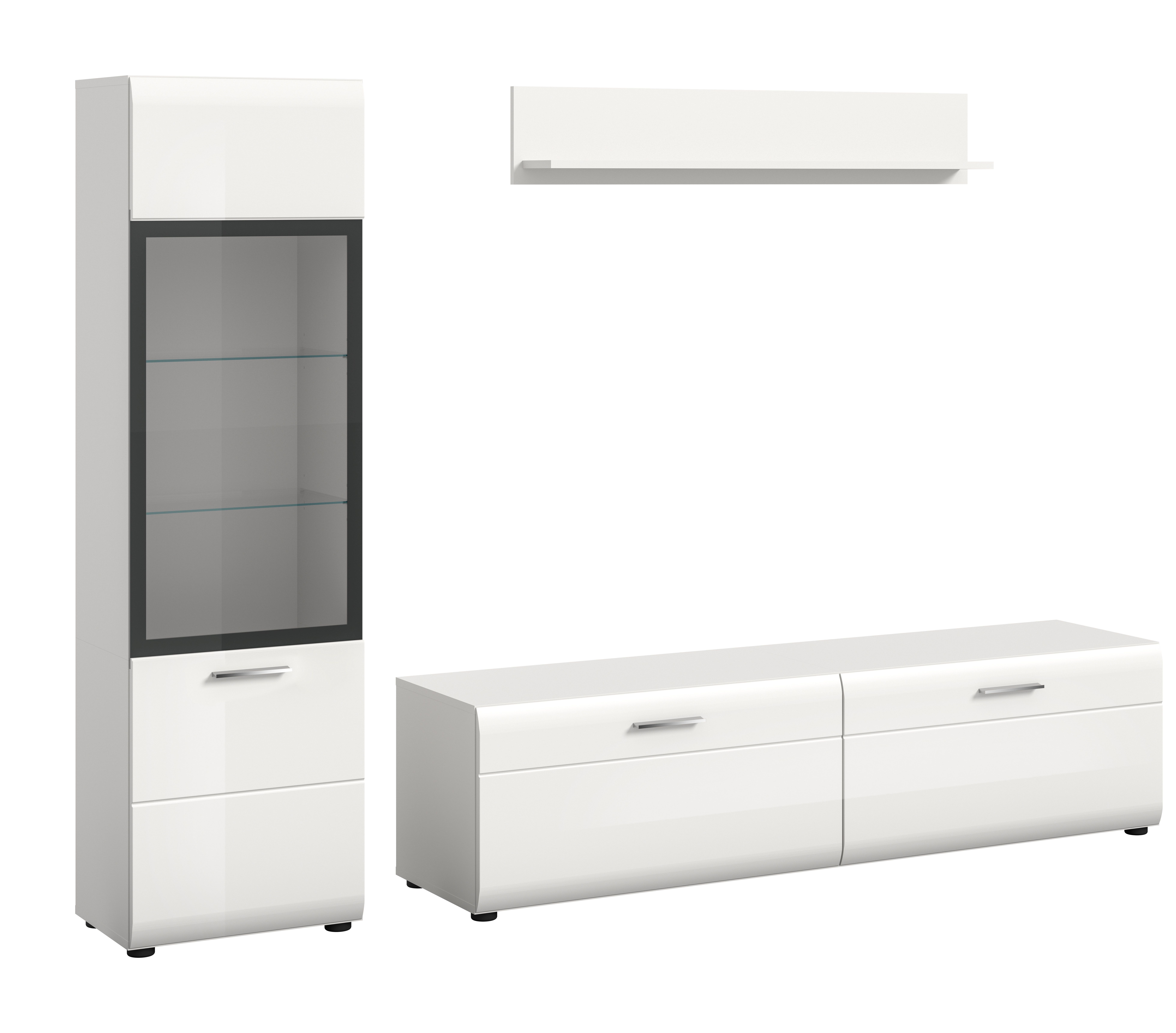 - Mur TV 3 éléments comprenant : 1x meuble vitrine, 1x banc TV, 1x étagère murale