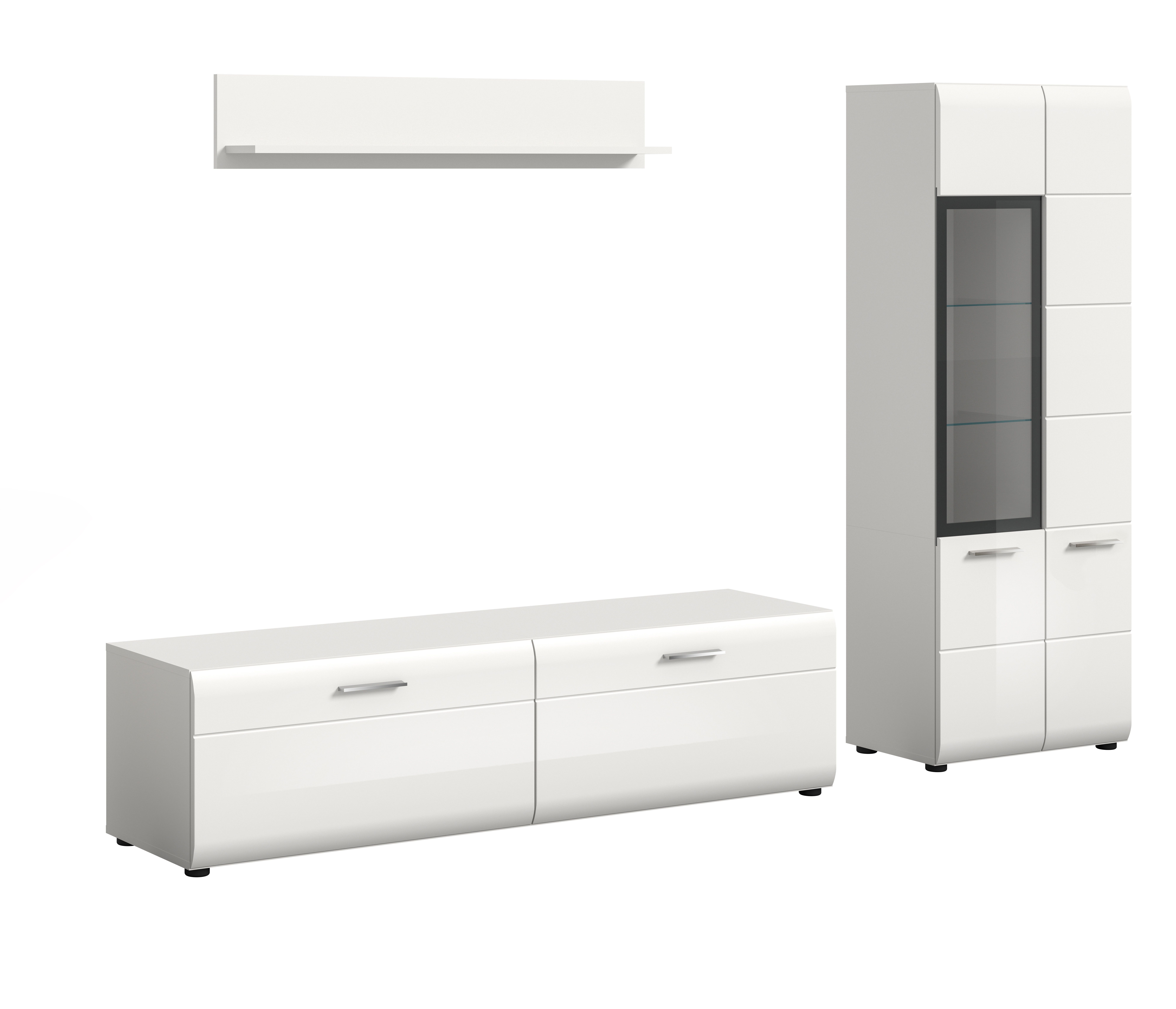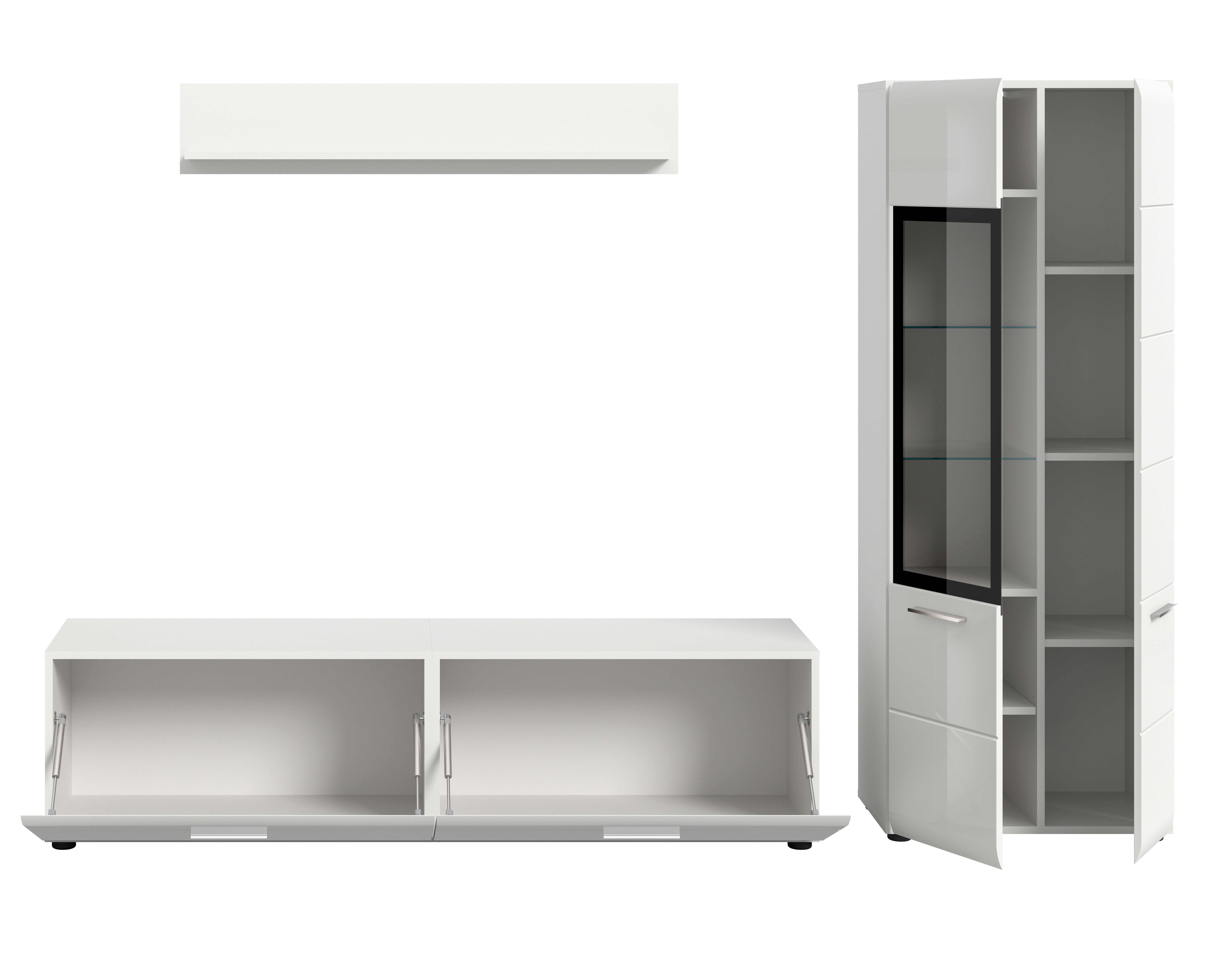 - Mur TV 3 éléments comprenant : 1x meuble vitrine, 1x banc TV, 1x étagère murale