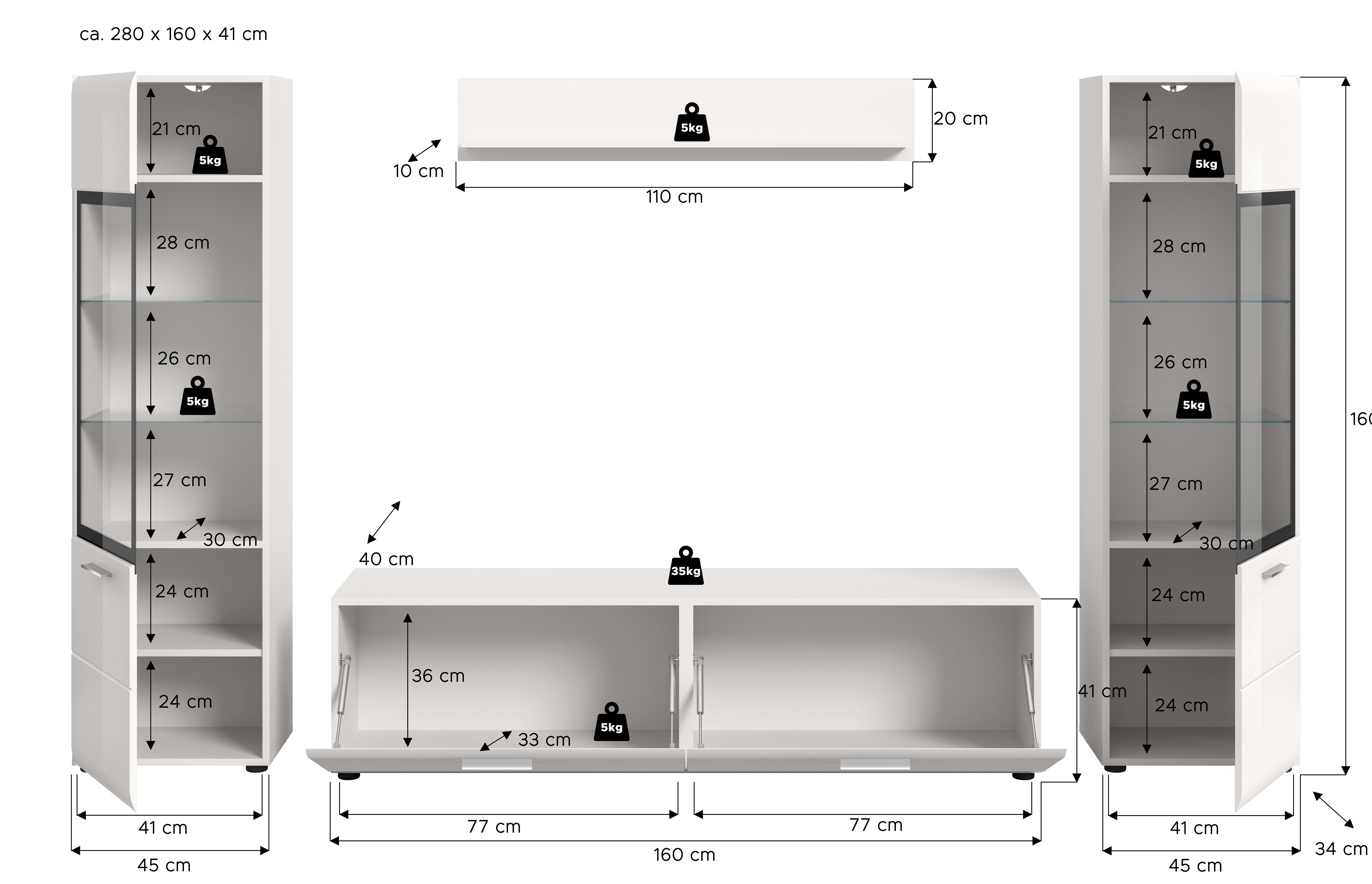 Avec ses dimensions de 280 x 160 x 41 cm et un espacement entre les éléments de 15 cm, il est idéal pour les intérieurs modernes et offre suffisamment de place pour mettre en valeur vos objets préférés.