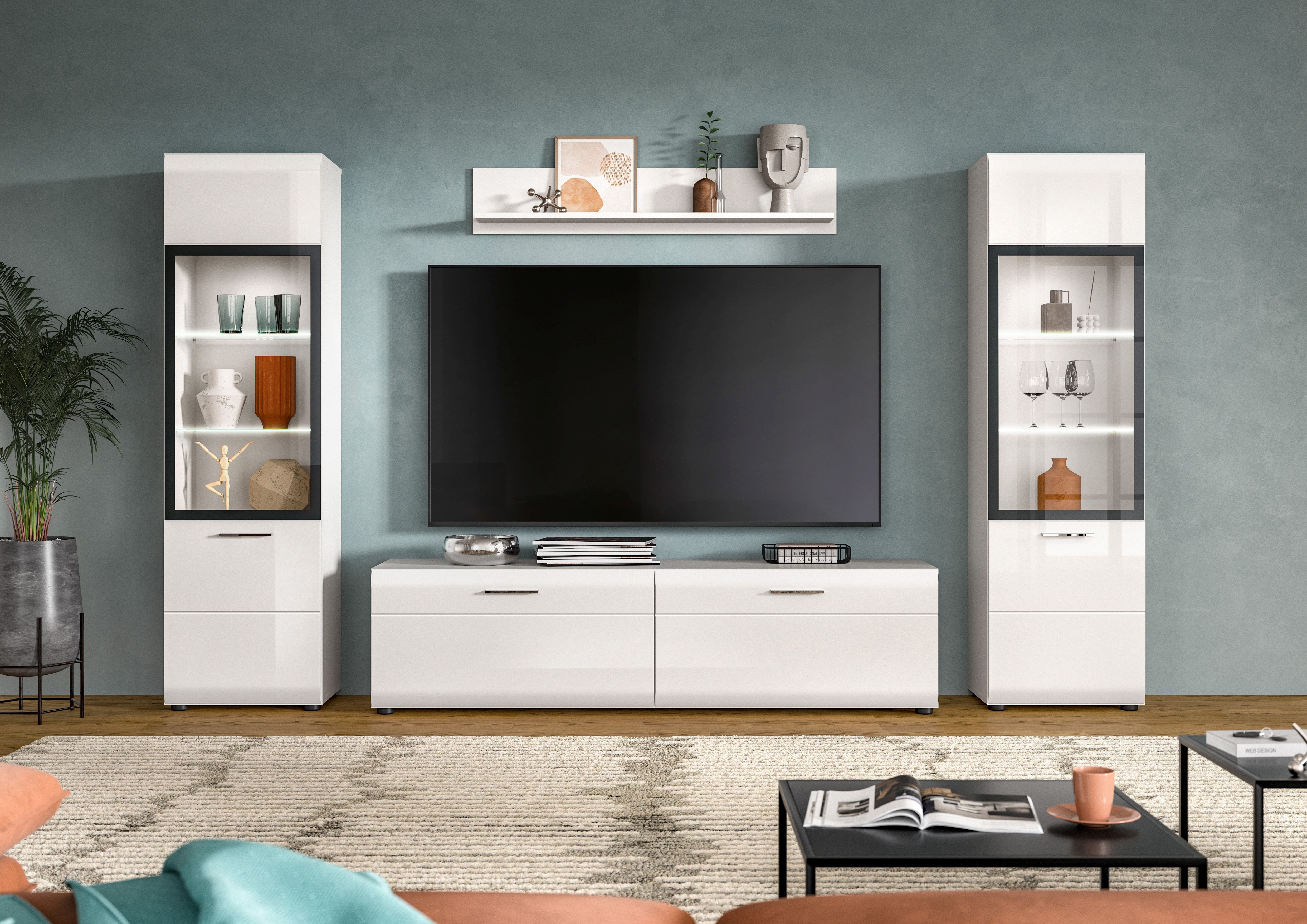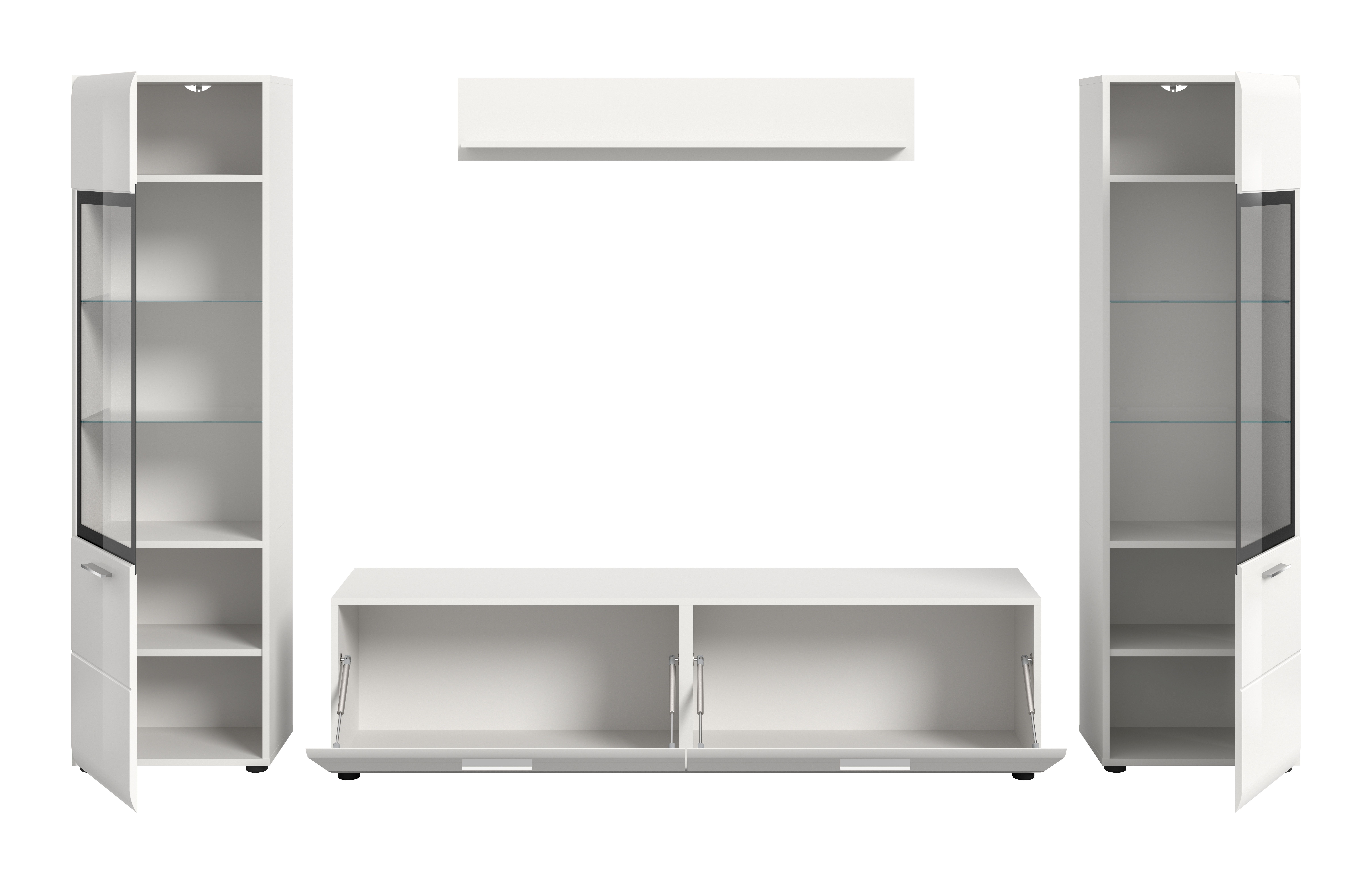Créez un espace de vie élégant grâce à notre ensemble de salon 4 éléments composé de deux vitrines, d’un banc TV et d’une étagère murale !