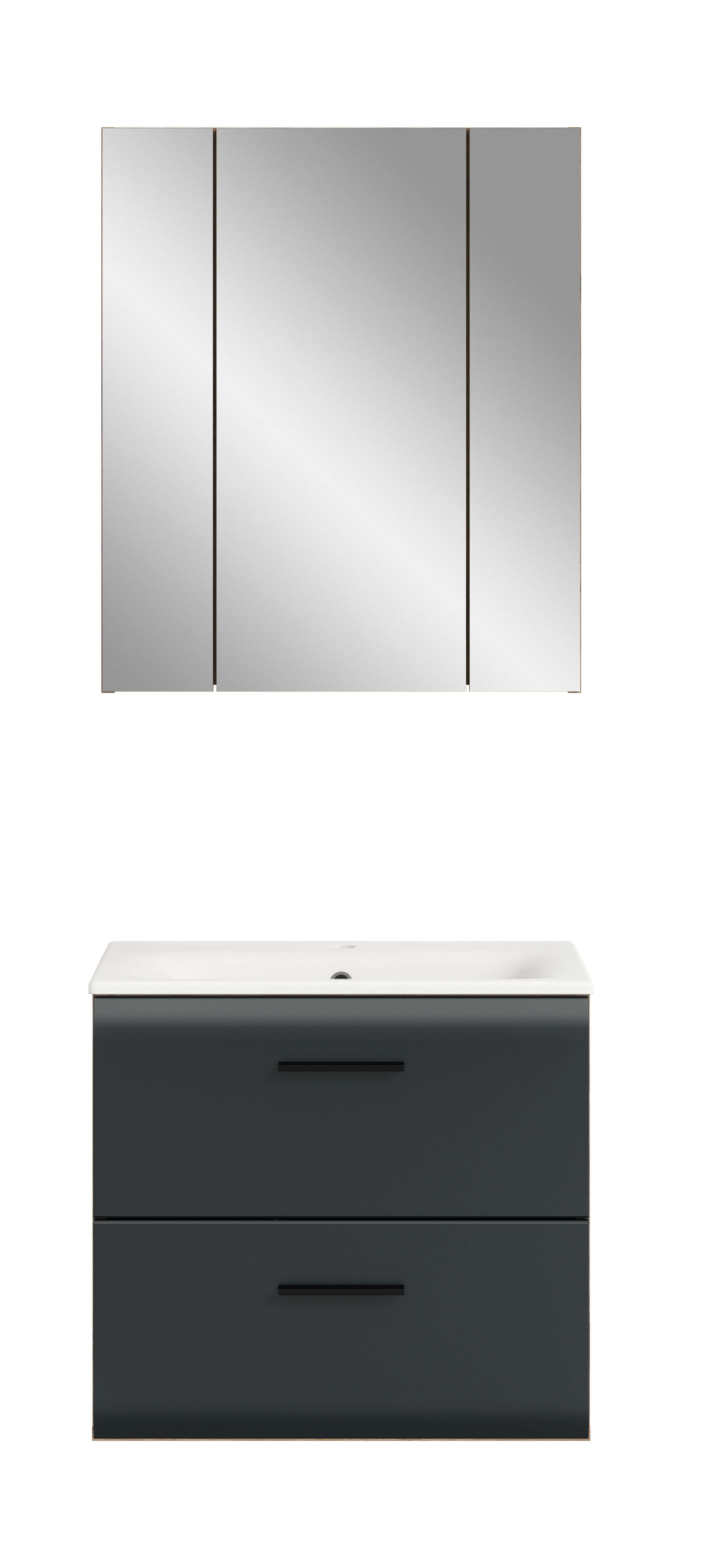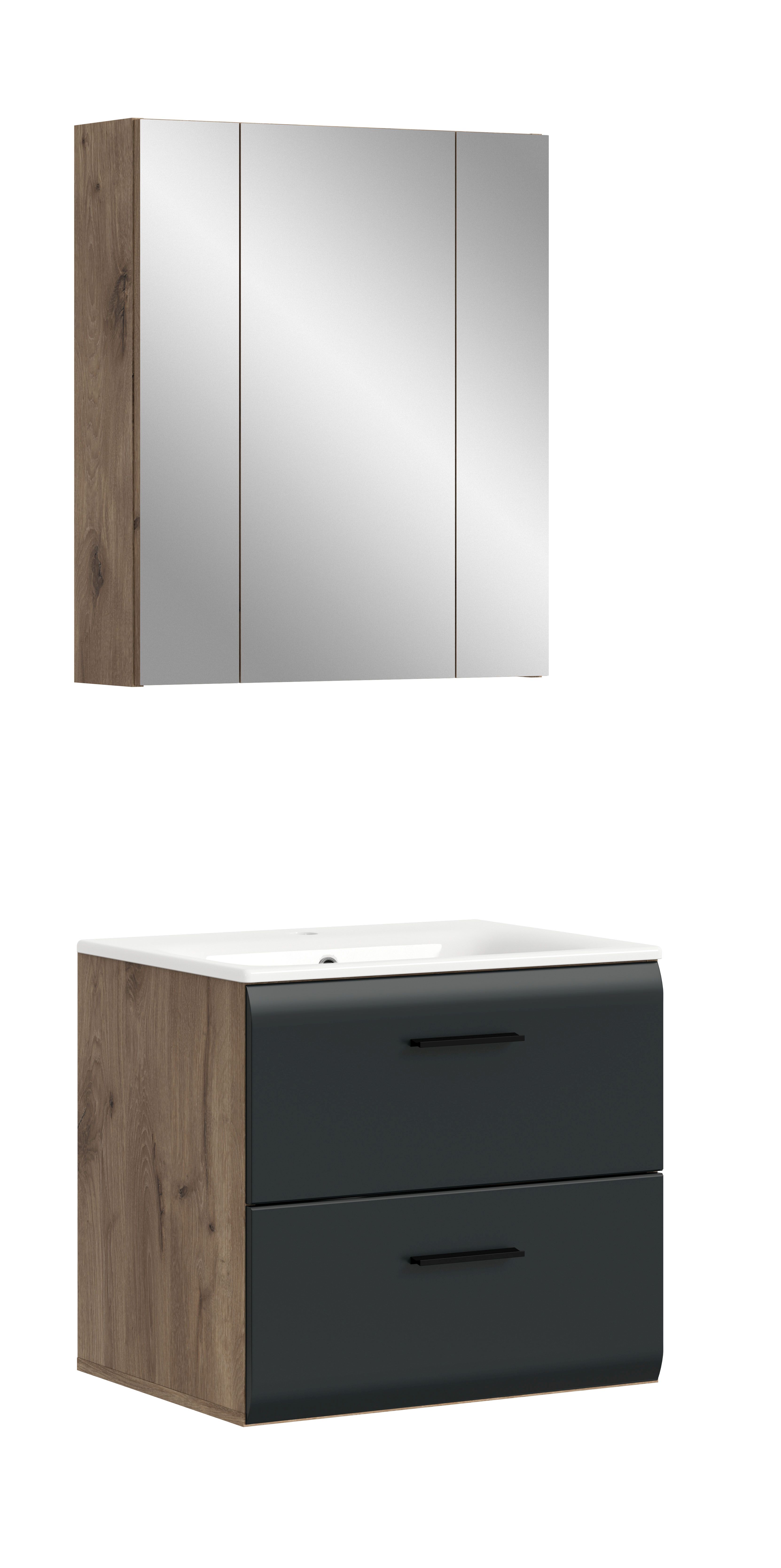 Optimisez l'espace disponible dans votre pièce grâce à notre salle de bains combinée 2 éléments ! Elle se compose d’un meuble sous vasque avec vasque intégrée et d’une armoire de toilette pratique. Cette solution compacte est idéale pour les petites pièces et offre une manière élégante de garder vos accessoires de bain bien ordonnés. La façade en MDF de qualité avec finition rainurée confère à l’ensemble un look tendance.