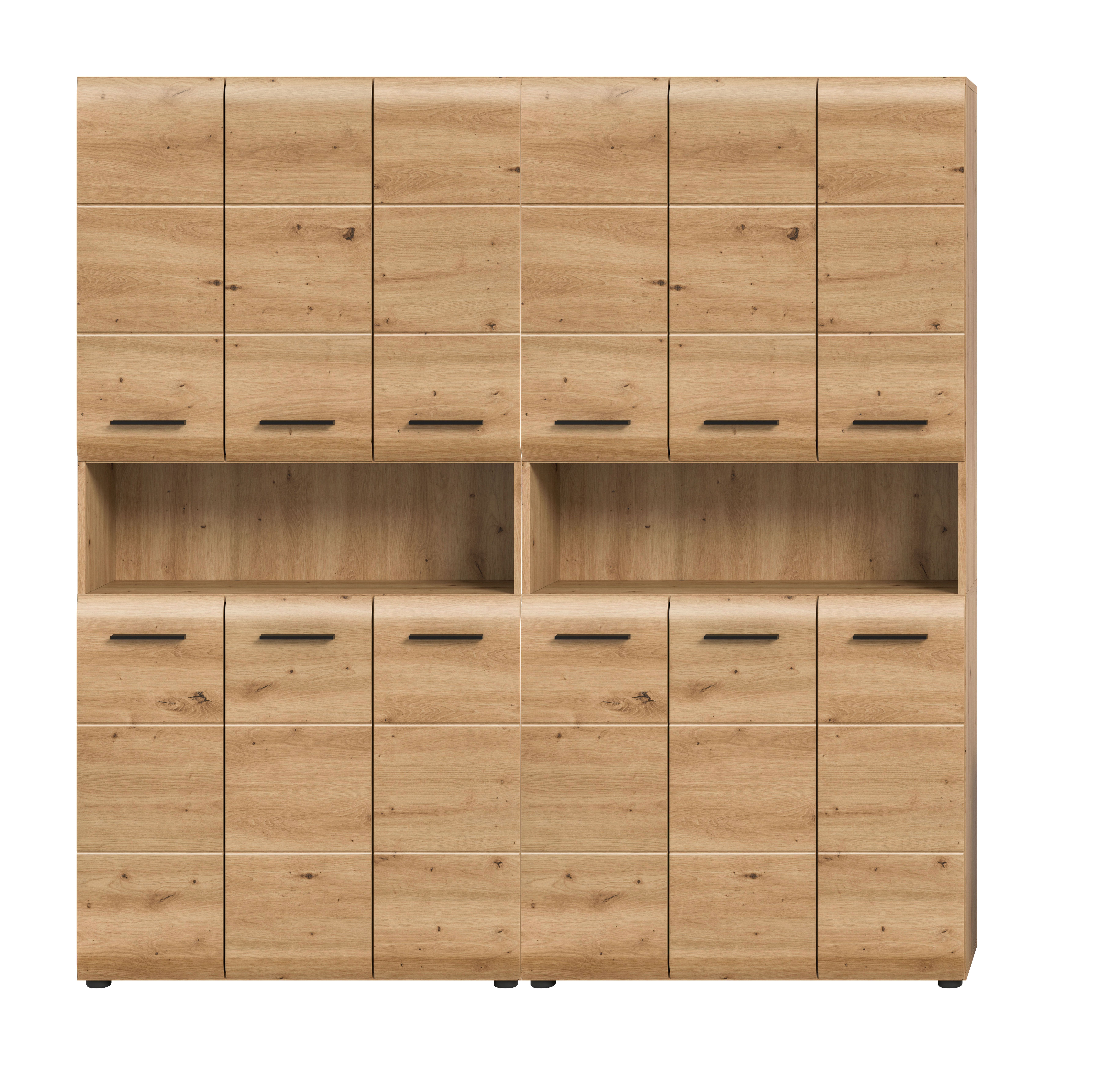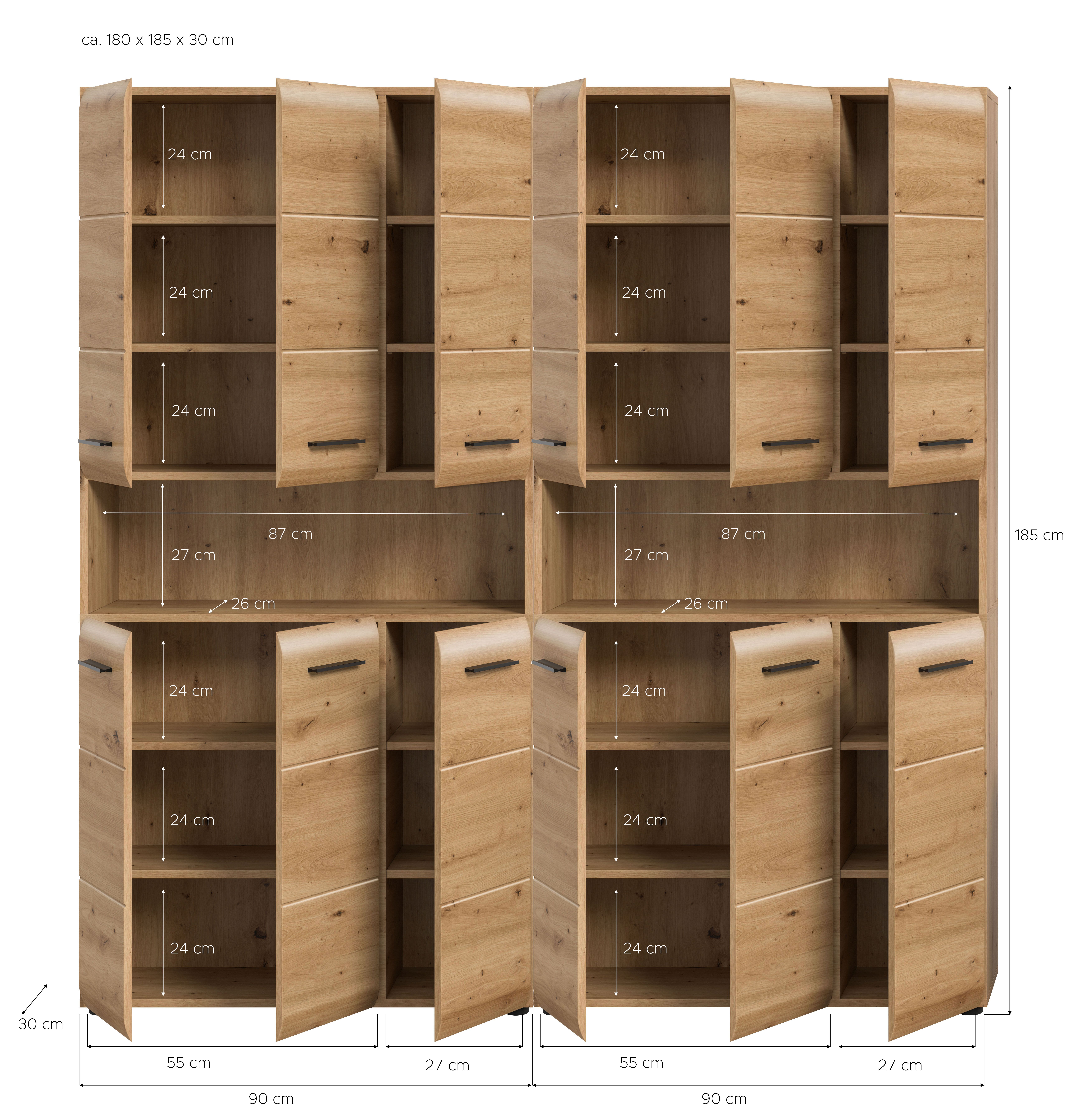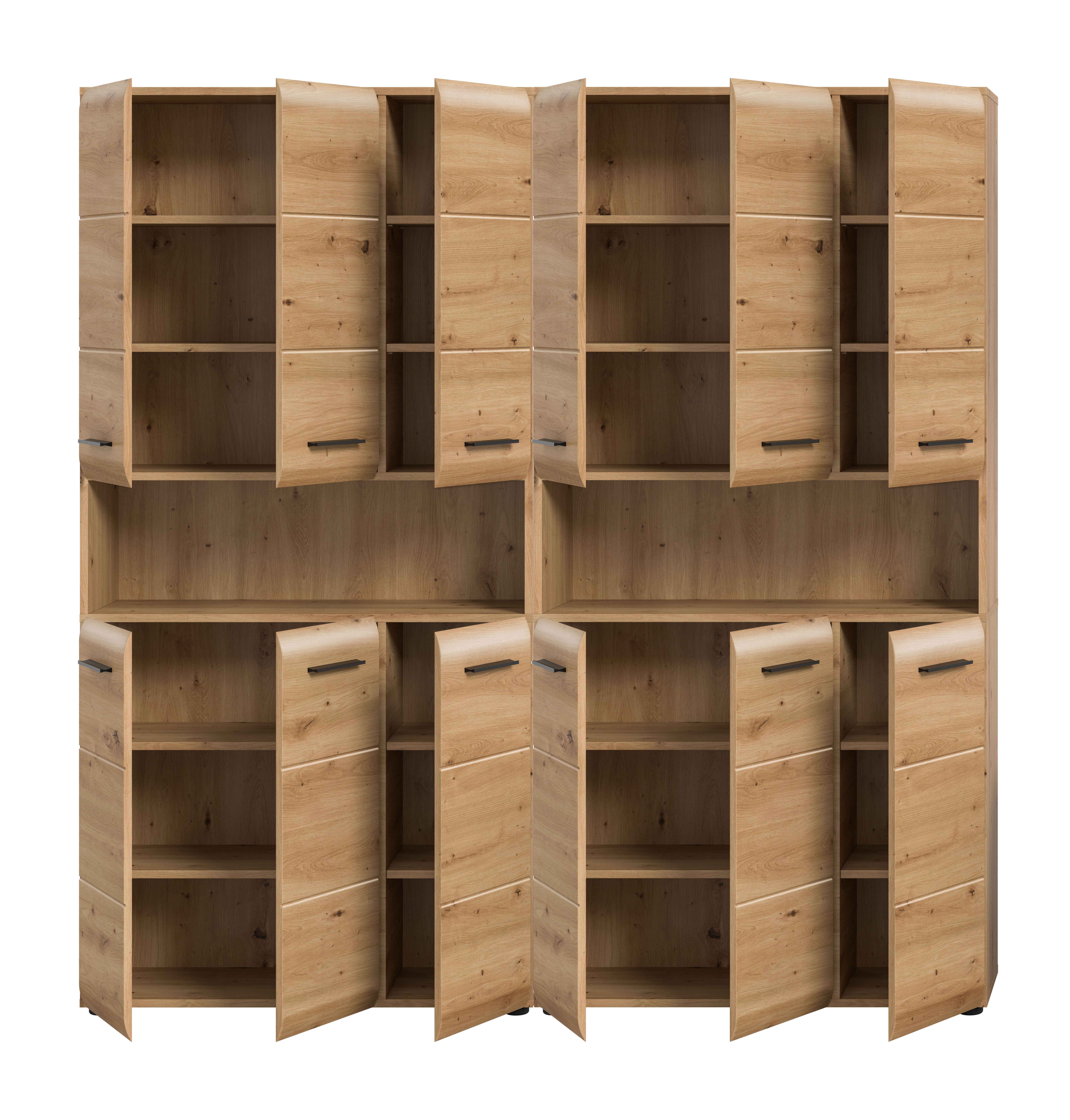 2 meubles colonnes avec 6 portes, 8 tablettes amovibles et 1 casier ouvert chacun