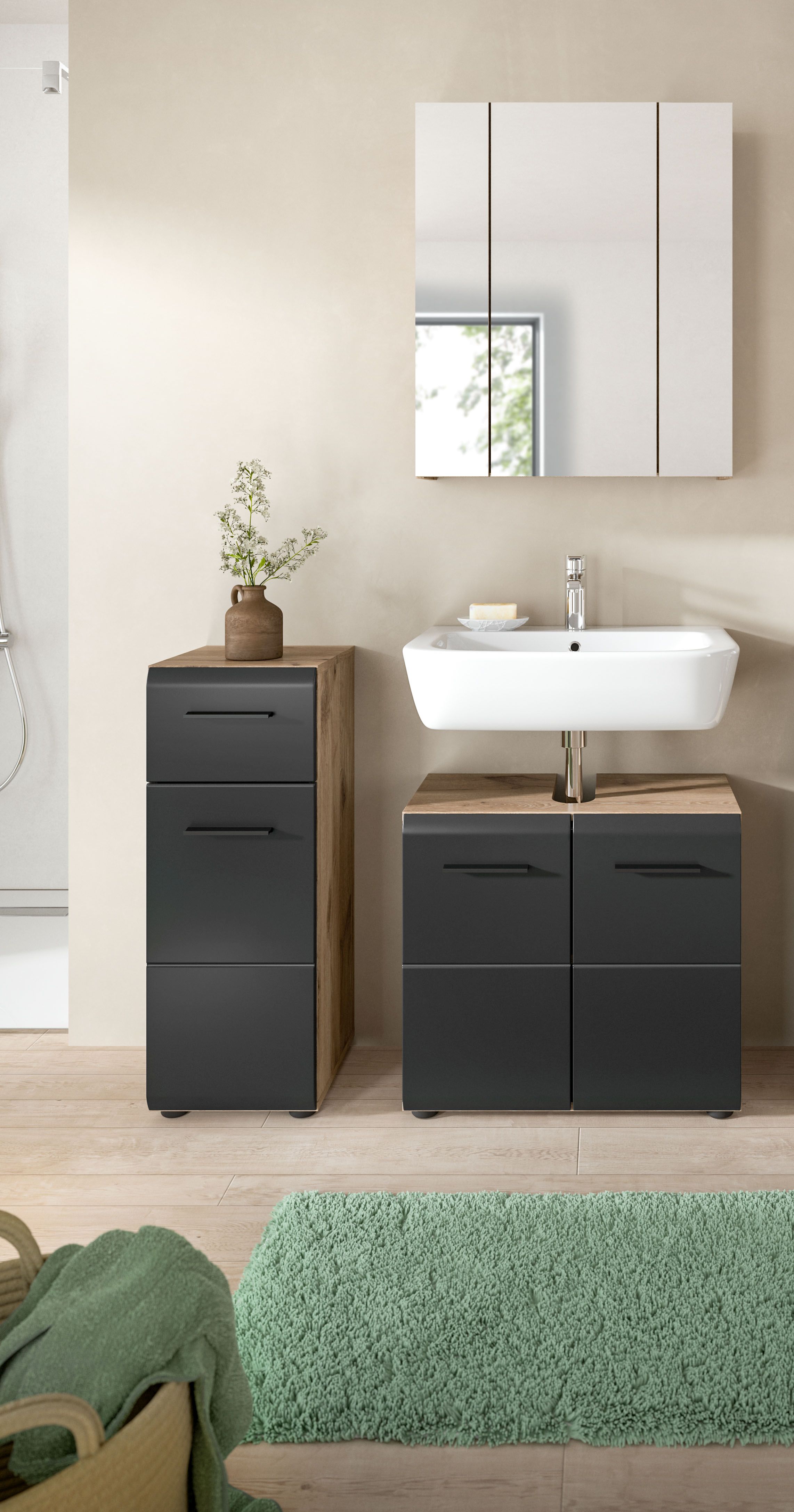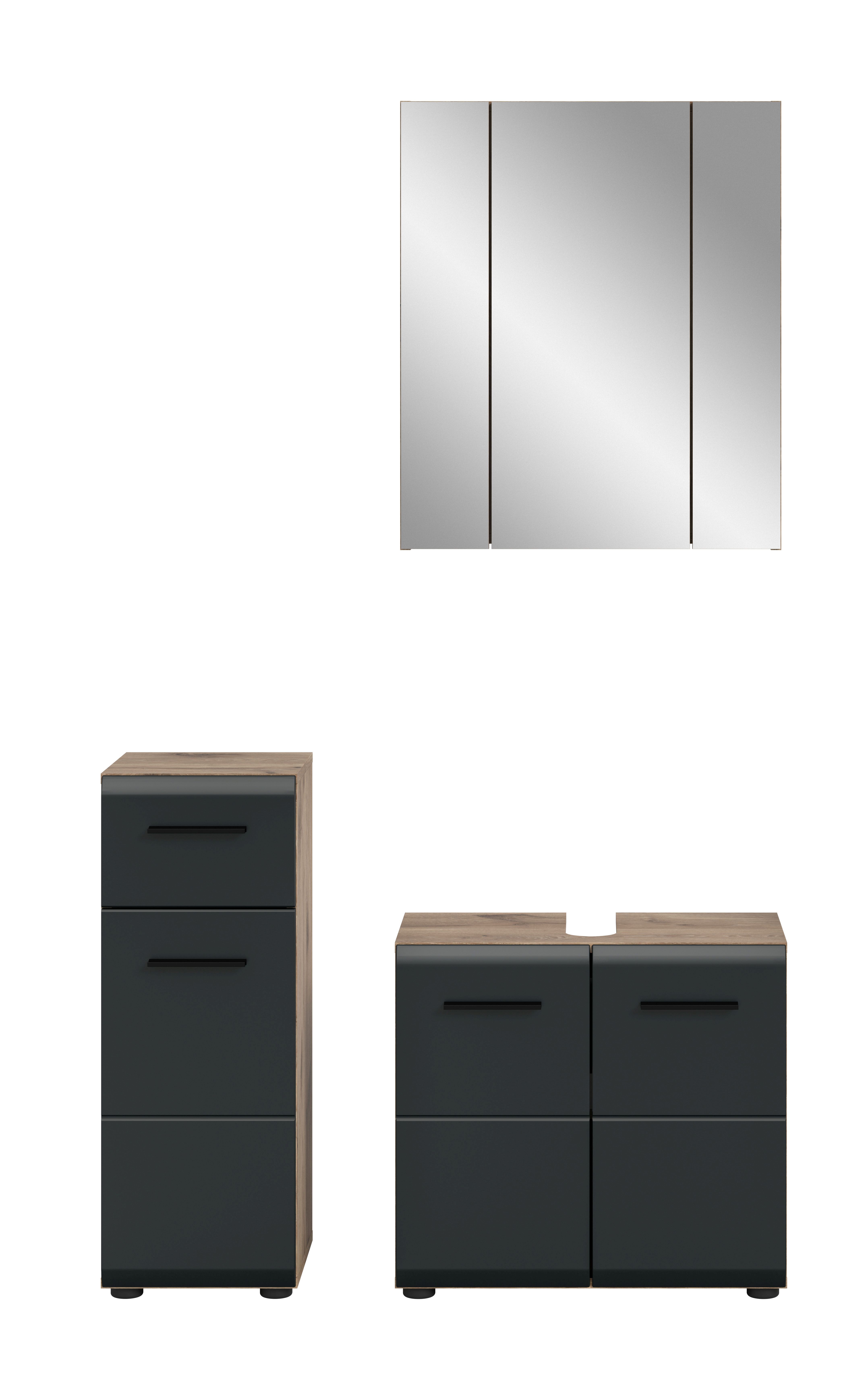 - Fonctionnalité : ensemble constitué d’un meuble sous lavabo, d’une armoire de toilette et d’un meuble demi-colonne pour une solution de rangement sur un faible encombrement dans la salle de bains.