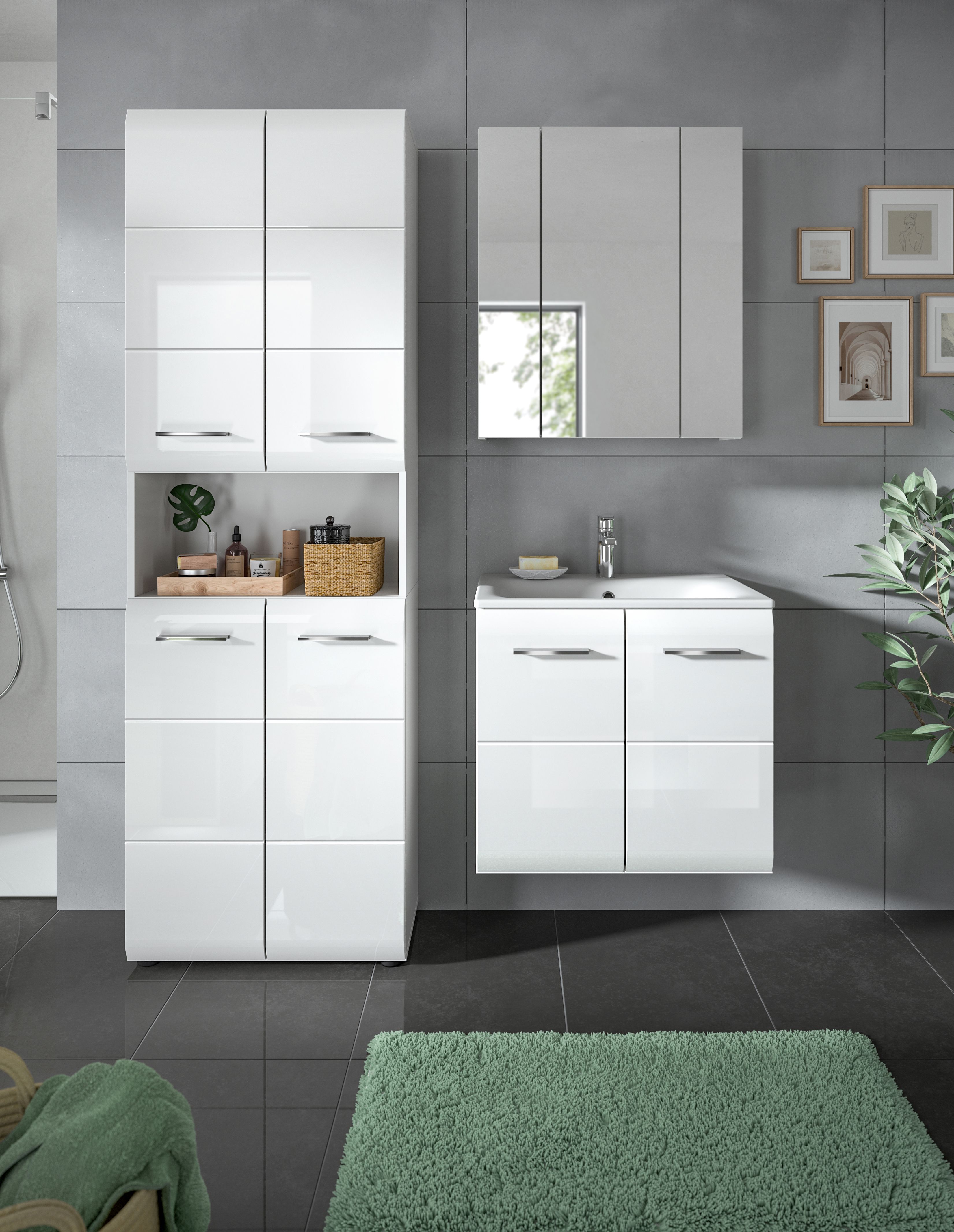 - Fonctionnalité : ensemble comprenant un meuble sous vasque avec vasque intégrée, une armoire de toilette et une armoire pour un rangement sur un faible encombrement dans la salle de bains.