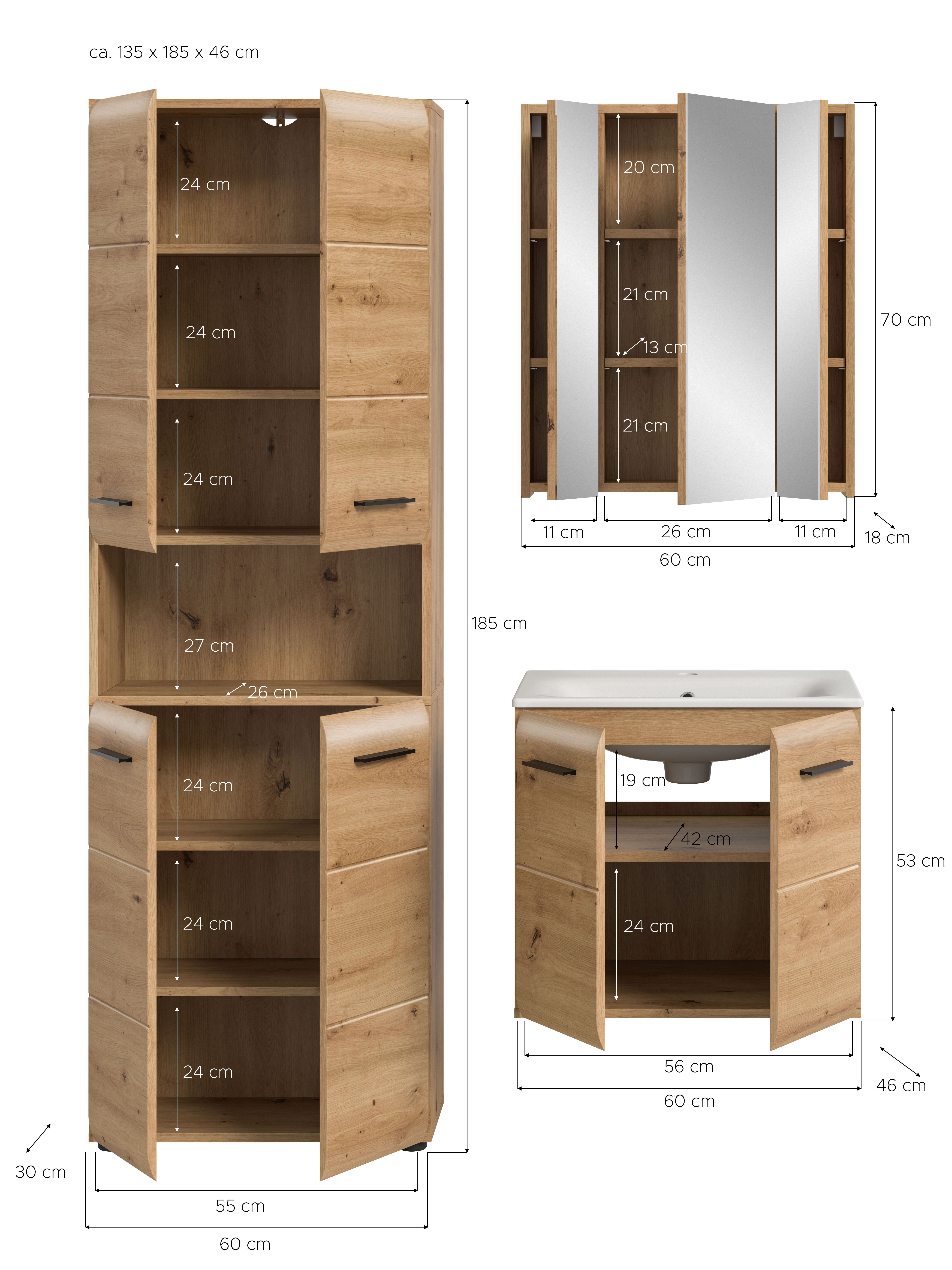 - Utilisation : l’ensemble est parfaitement adapté comme salle de bains complète pour optimiser l’espace de rangement et la fonctionnalité dans un espace réduit.