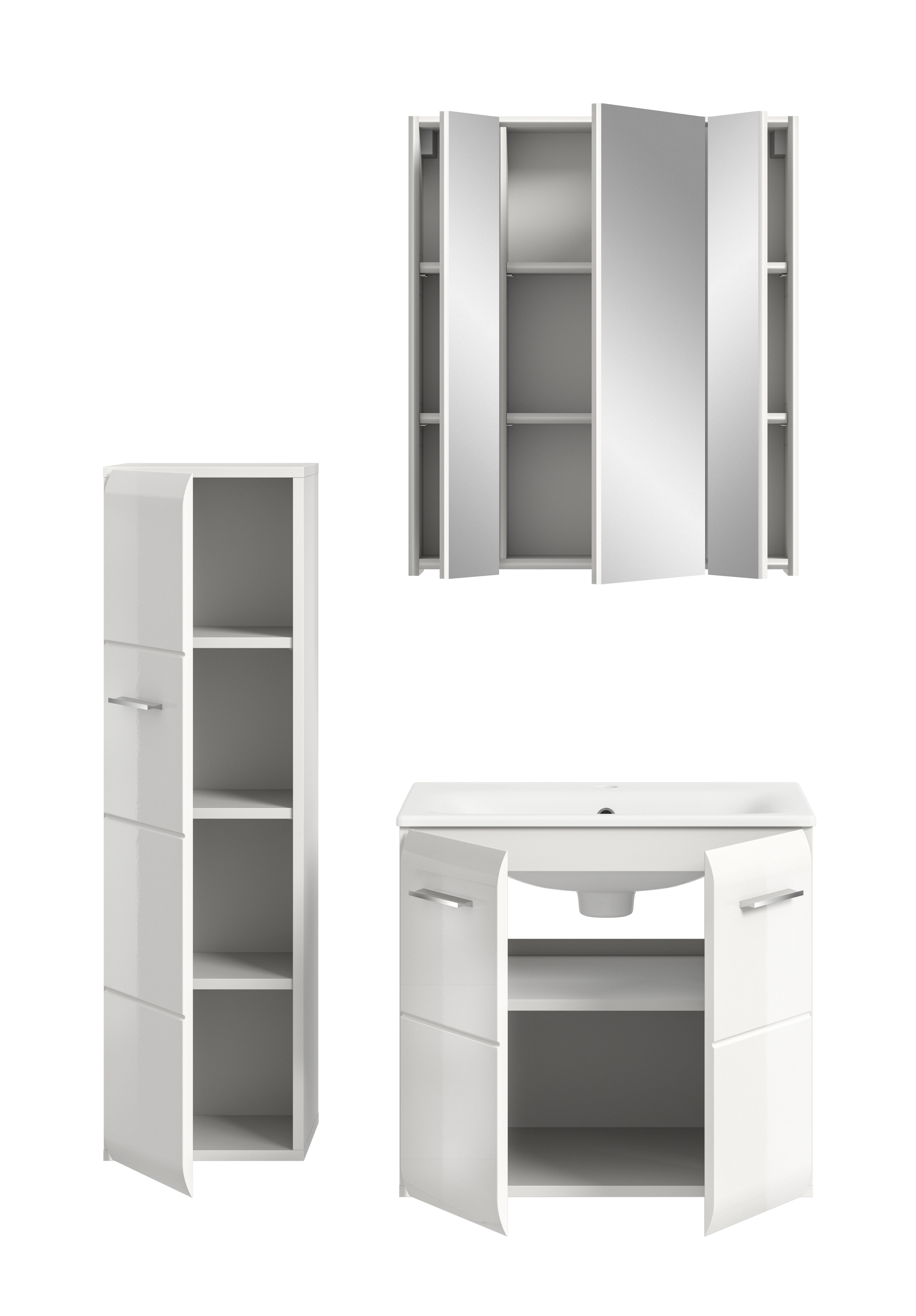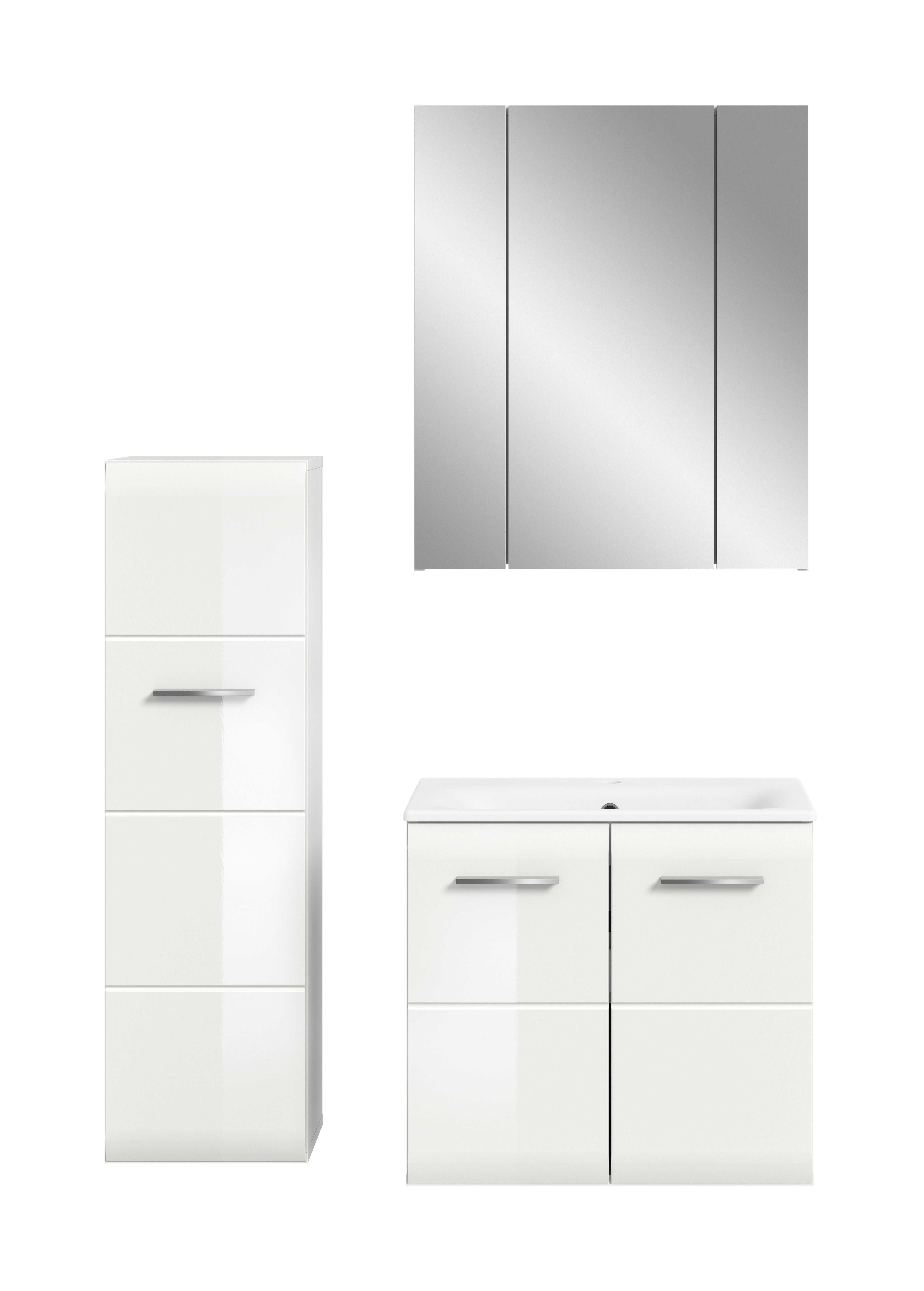 - Salle de bains combinée 3 éléments comprenant : 1 meuble de salle de bains, 1 meuble sous vasque avec vasque, 1 armoire de toilette
