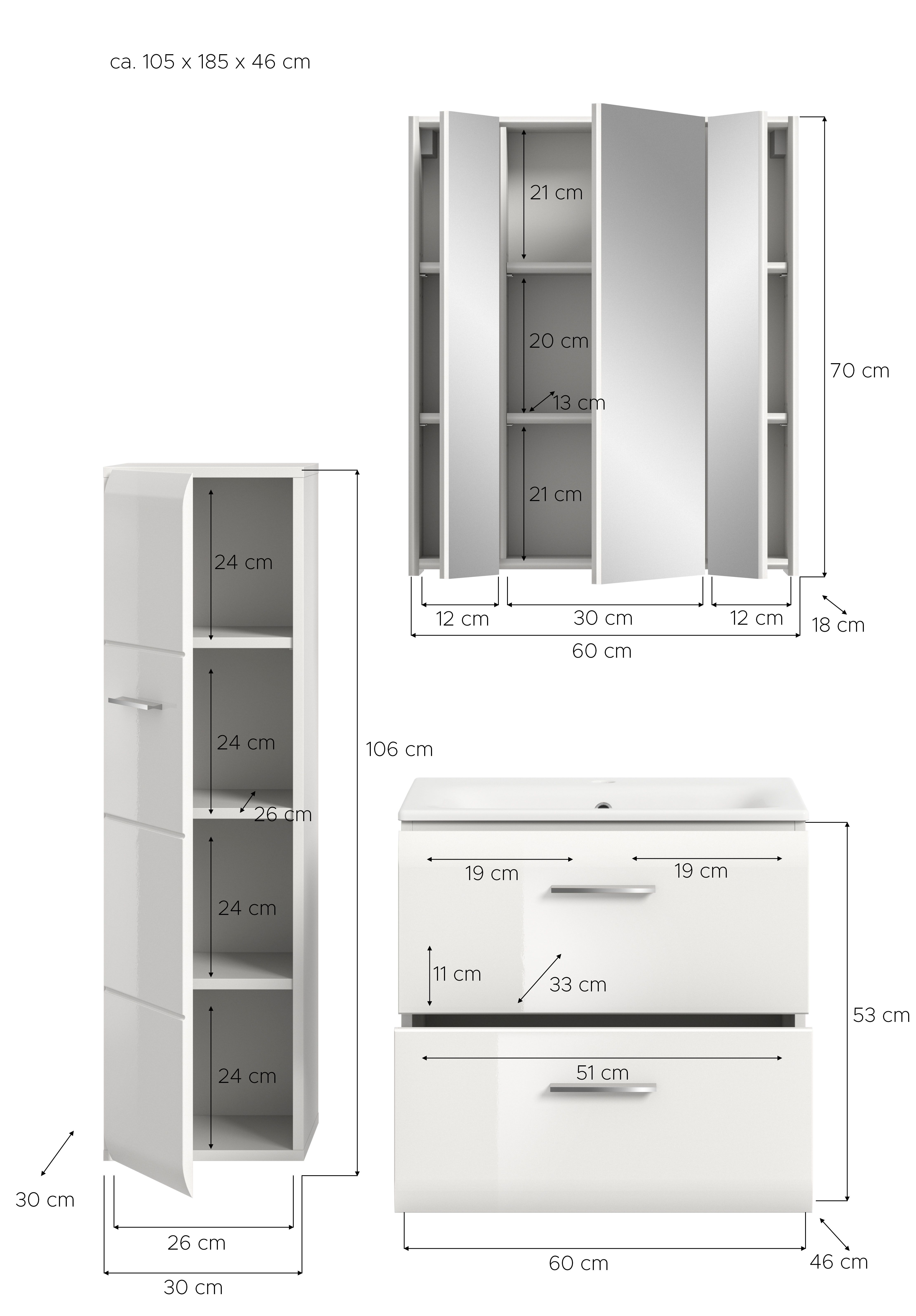 Apportez un nouveau souffle à votre pièce avec cette élégante salle de bains combinée 3 éléments ! Cet ensemble astucieux se compose d’un meuble de rangement pratique, d’un meuble sous vasque moderne avec vasque intégrée et d’une armoire de toilette stylée. Avec ses dimensions compactes (105 x 185 x 46 cm) et un espacement de 15 cm entre les éléments, cette salle de bains combinée offre un rangement optimal pour vos accessoires tout en créant une ambiance ordonnée et harmonieuse. La façade en MDF de qualité avec finition rainurée moderne confère à l’ensemble une esthétique attrayante tout en garantissant durabilité et entretien facile. Idéal pour tout type de salle de bains, cet ensemble s’intègre parfaitement dans différents styles d’intérieur et crée un espace accueillant propice à la détente. Faites de votre salle de bains un refuge stylé et fonctionnel grâce à cette solution de rangement pratique et moderne !