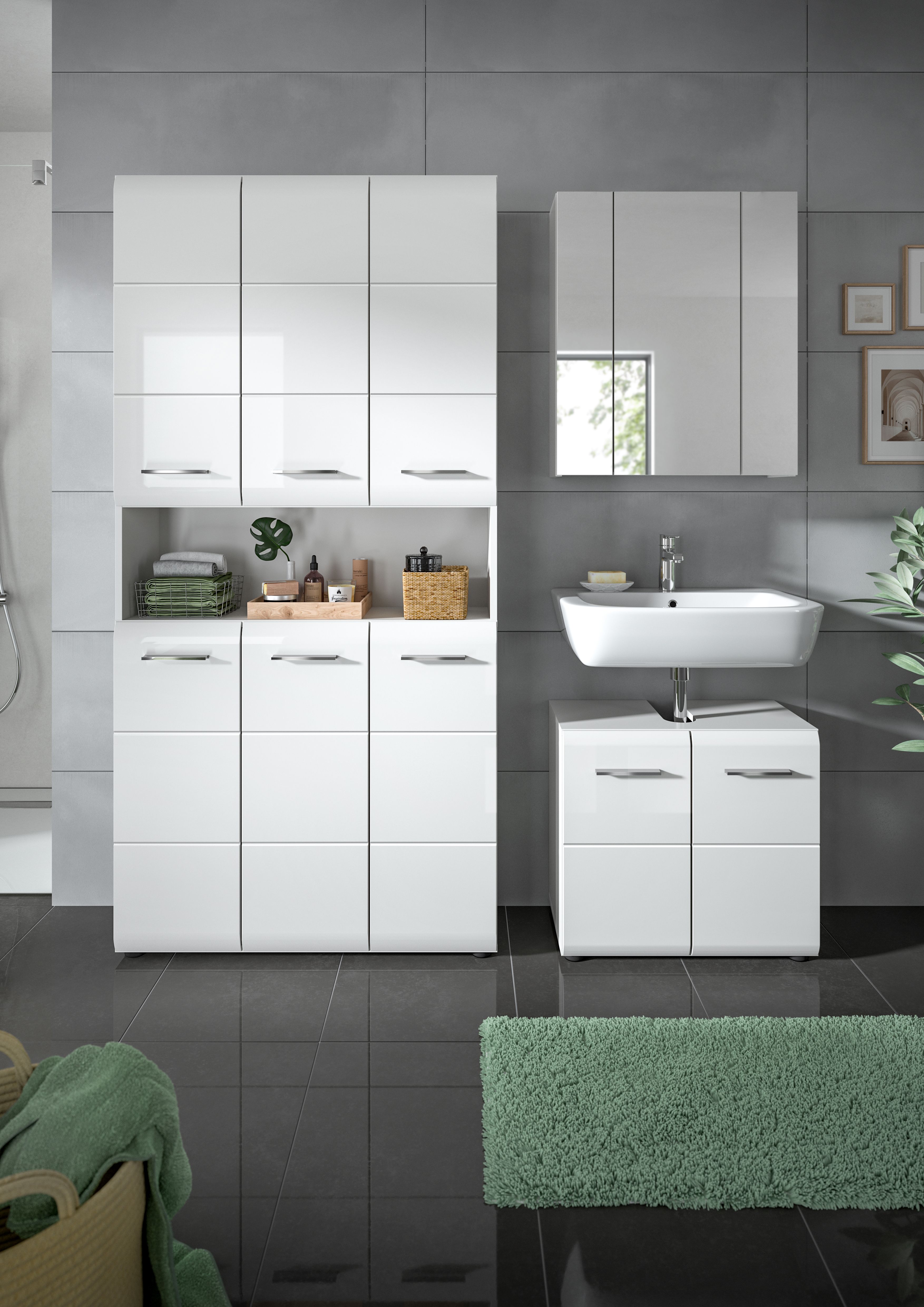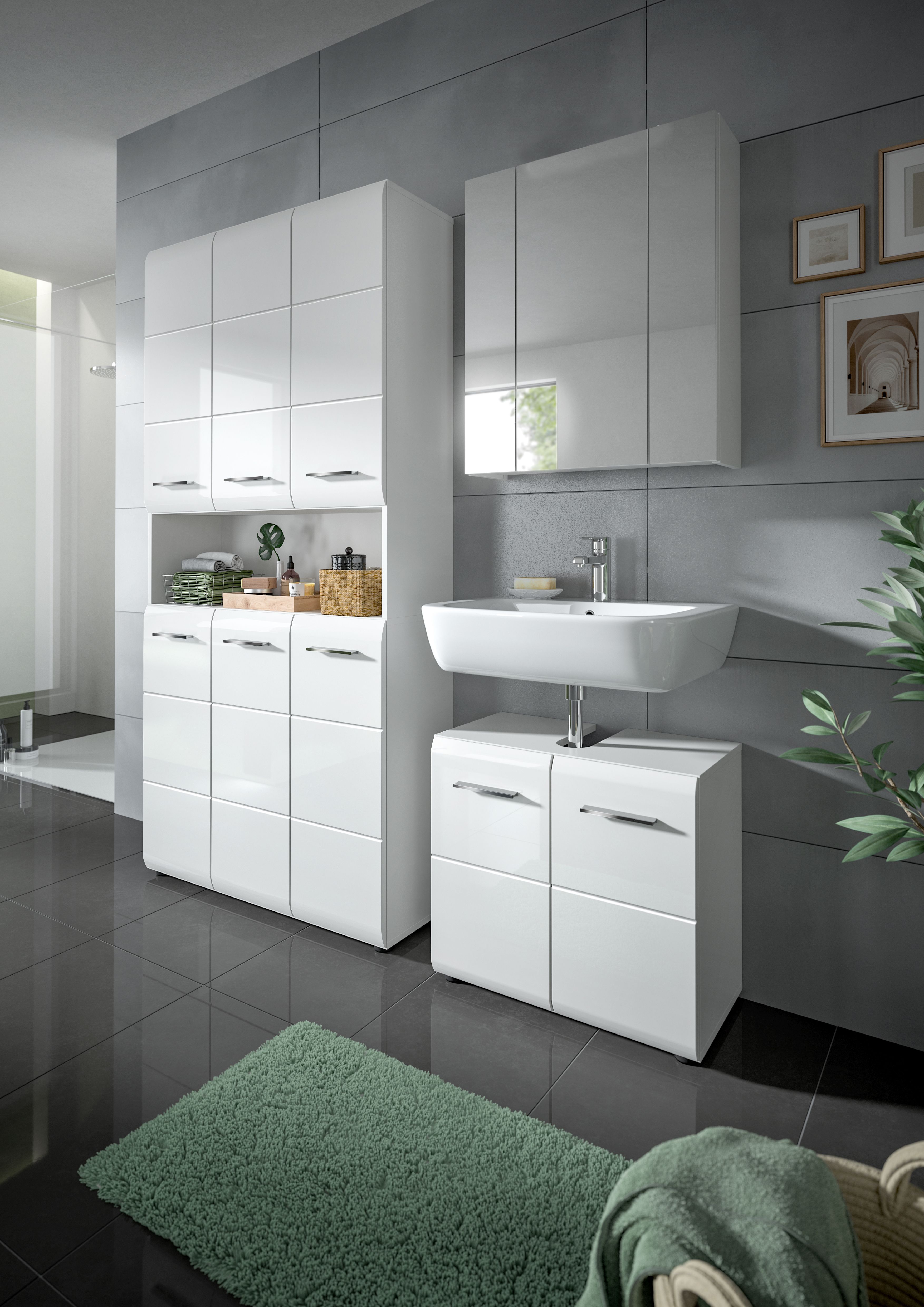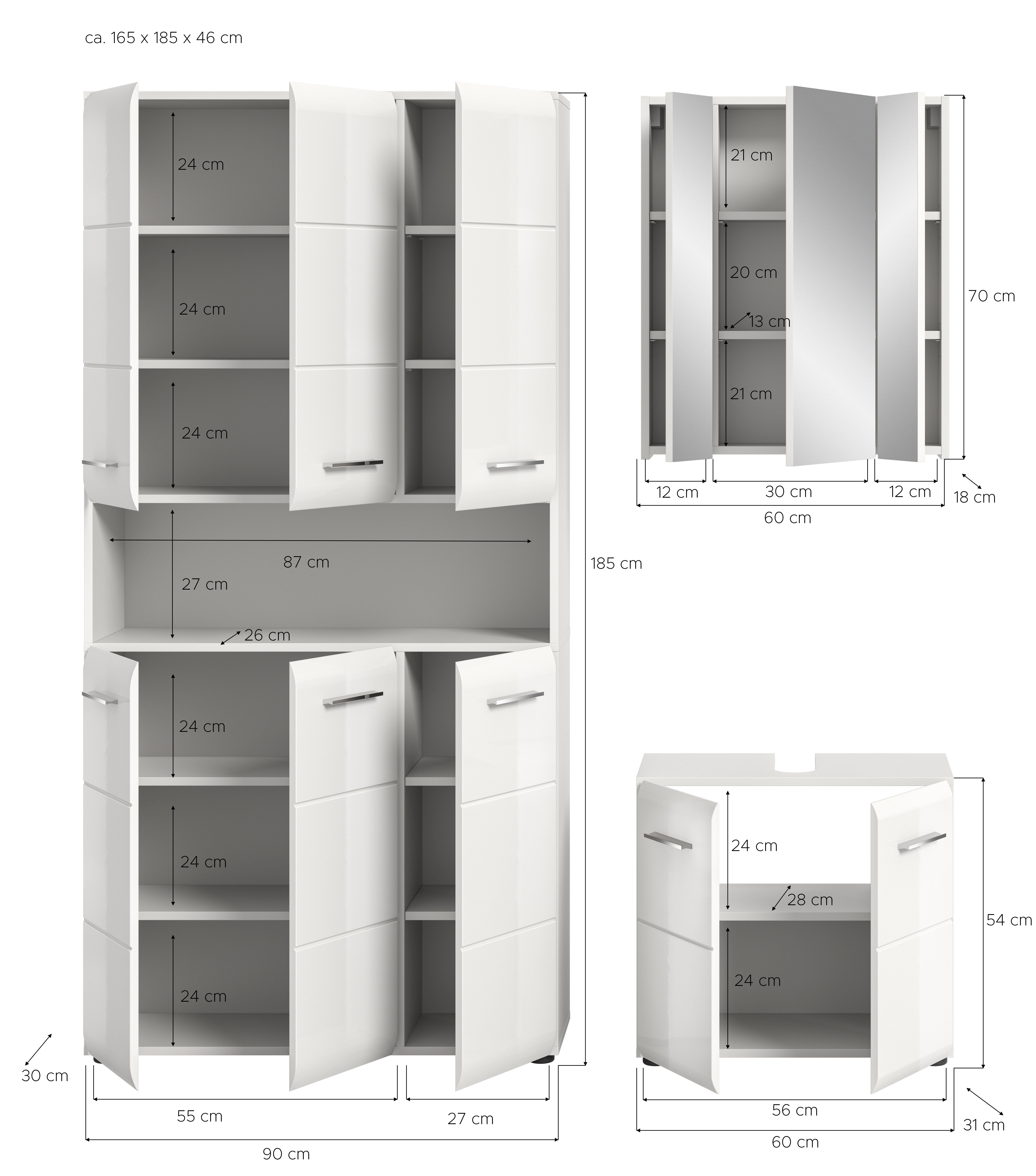 - Salle de bains combinée 3 éléments comprenant 1x armoire de salle de bains, 1x meuble sous lavabo et 1x armoire de toilette