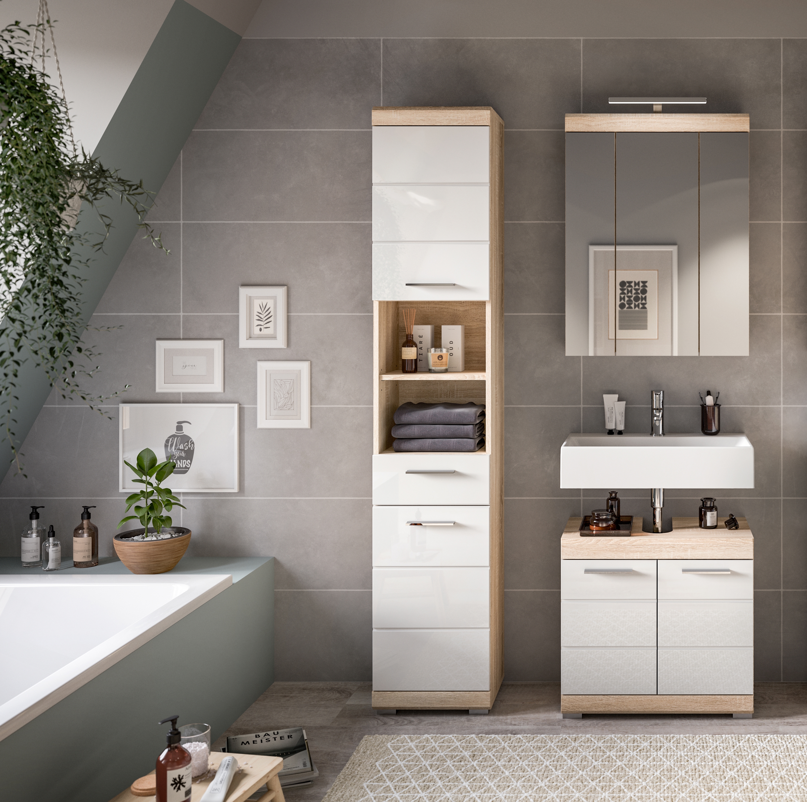 - Fonctionnalité : la salle de bains combinée offre un espace de rangement complet et un côté pratique grâce aux différents éléments (meuble sous lavabo, colonne de salle de bains et armoire de toilette) pour une organisation efficace des accessoires de bains et articles ménagers.