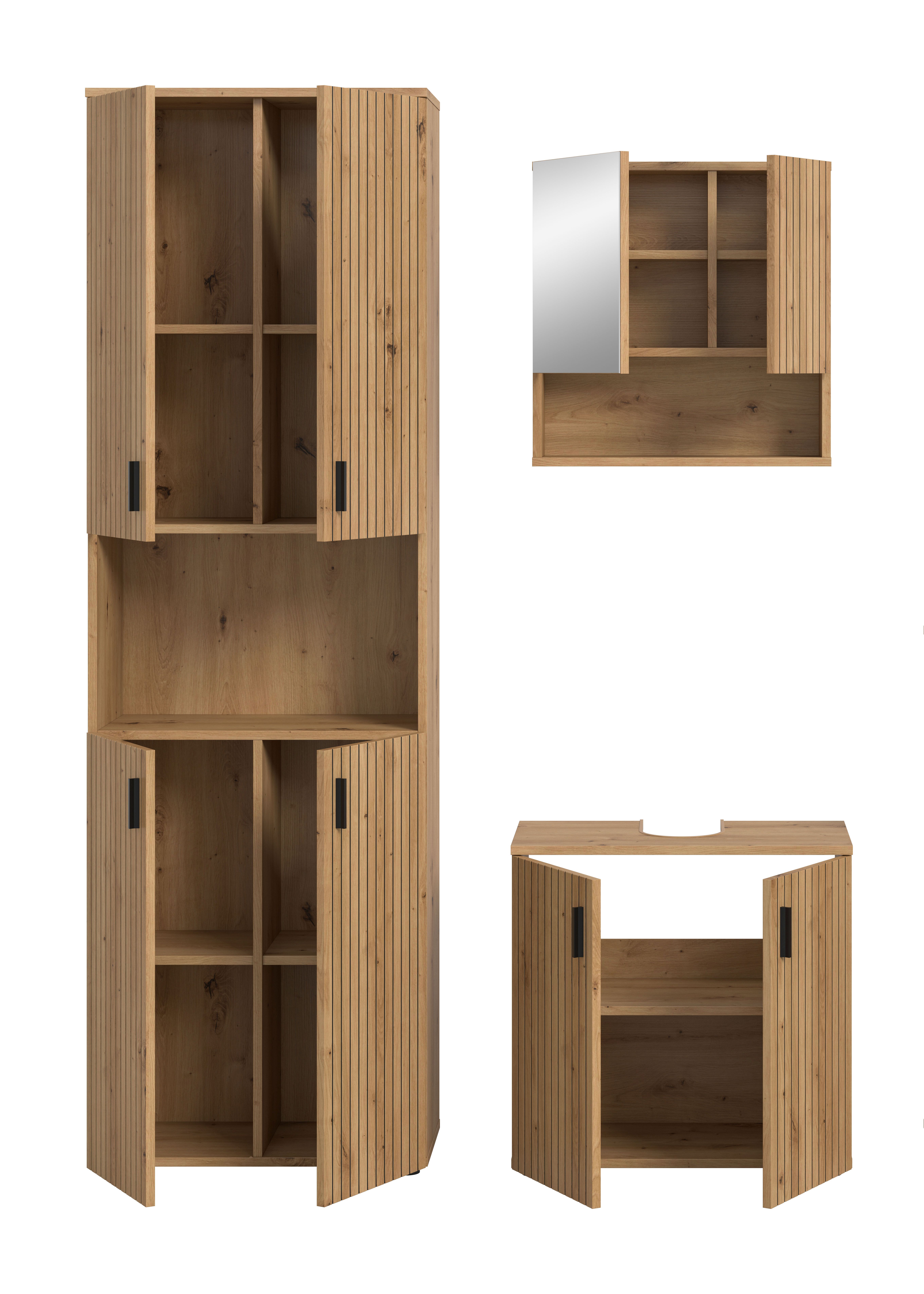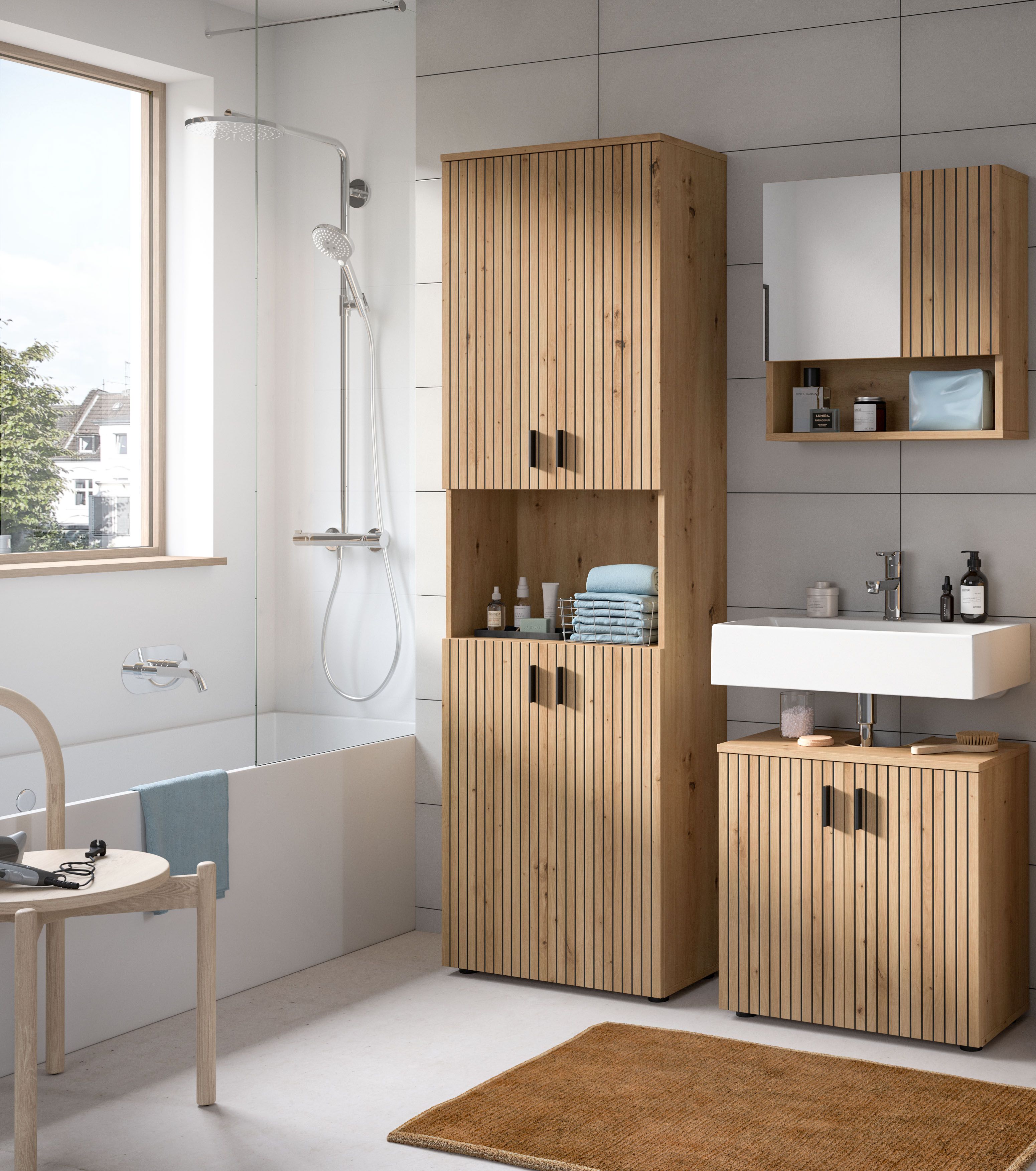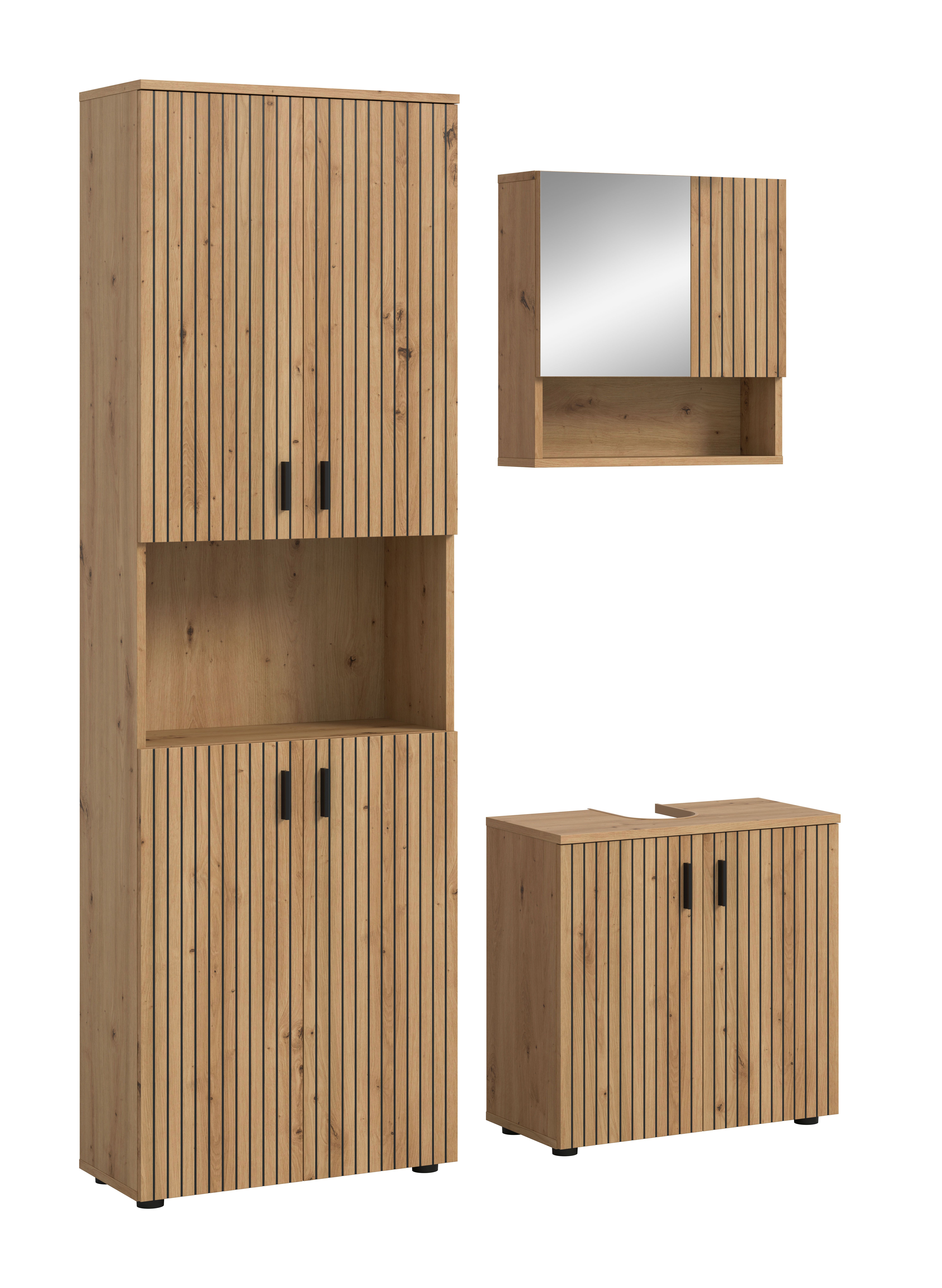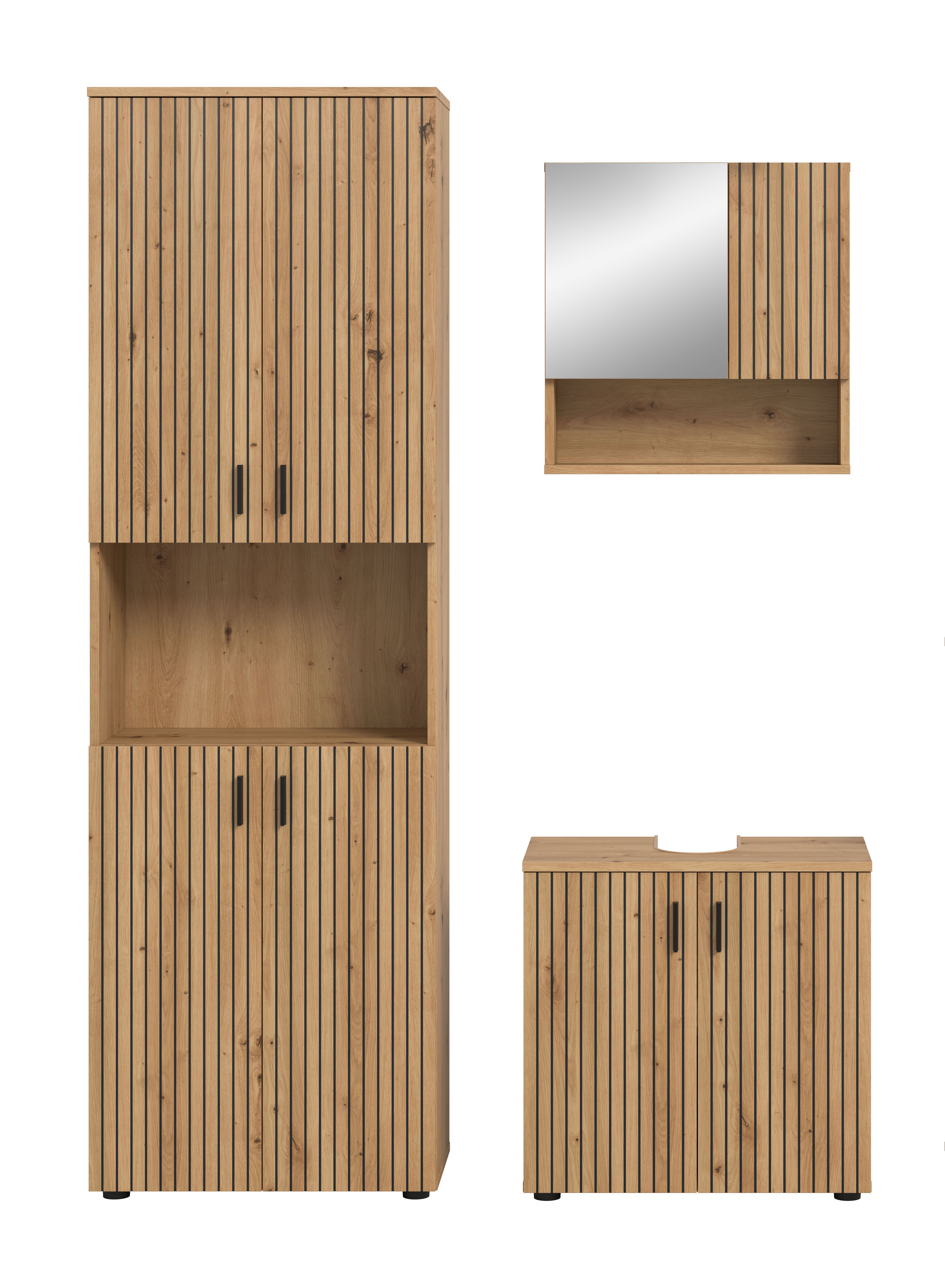 Cet ensemble 3 éléments en décor chêne Artisan (135 x 192 x 30 cm) se compose d’une armoire de salle de bains, d’un meuble sous lavabo et d’une armoire de toilette. La façade soigneusement travaillée avec finition rainurée, facile d’entretien, confèrera à votre salle de bains une allure chaleureuse et naturelle. Cet ensemble offre un vaste espace de rangement et vous aide à maintenir une salle de bains fonctionnelle et bien organisée. Les meubles sont robustes et durables, vous garantissant un usage prolongé. Grâce aux nombreuses possibilités d’association avec les autres meubles de la série, vous pourrez aménager et compléter votre salle de bains de manière personnalisée et flexible. Cet ensemble allie design, qualité et aspect pratique pour une salle de bains où l’on se sent bien.