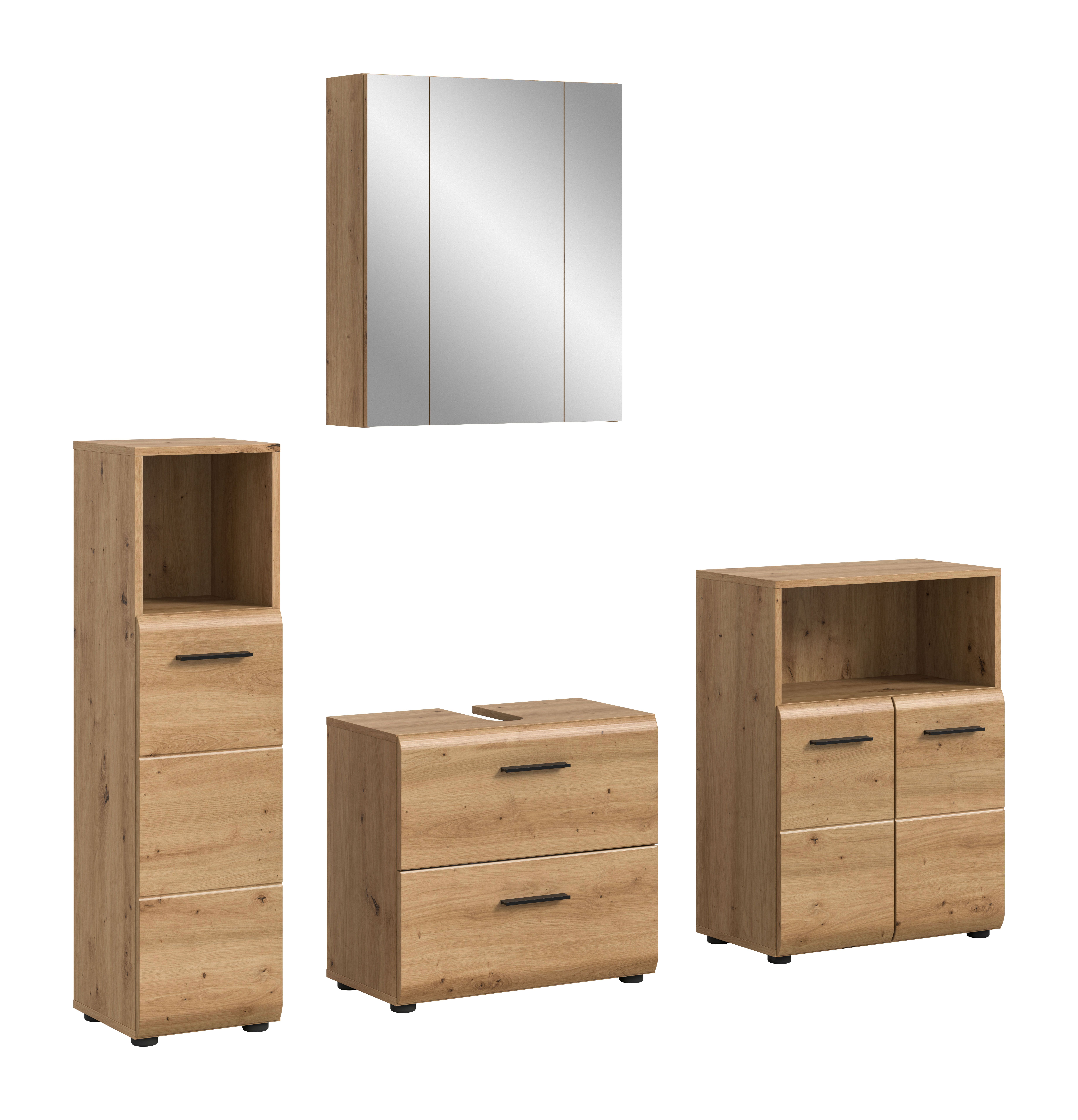 - Fonctionnalité : ensemble constitué d’un meuble sous lavabo, d'un meuble demi-colonne et d’un meuble de salle de bains pour une solution de rangement complète sur un faible encombrement dans la salle de bains.