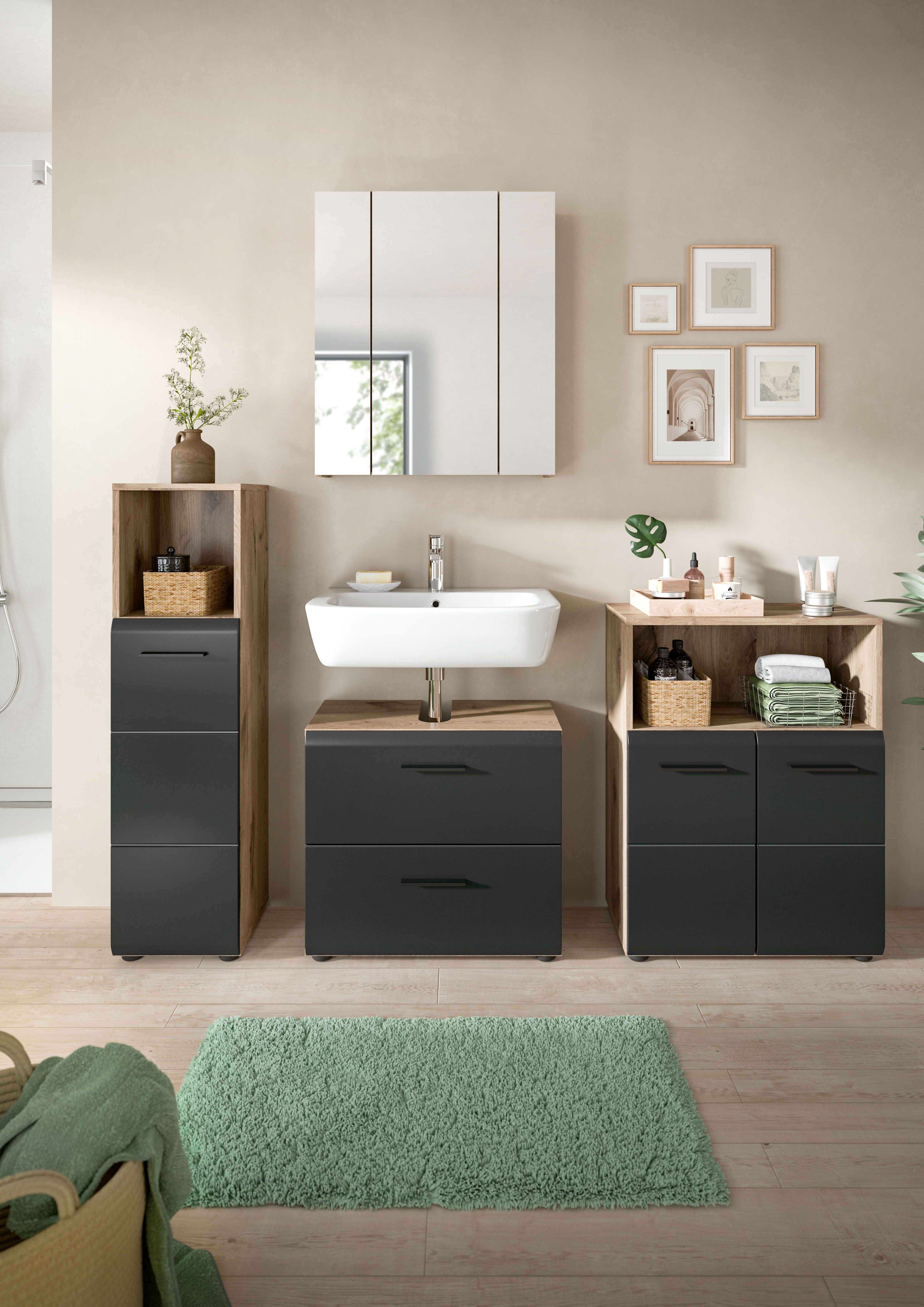- Fonctionnalité : ensemble constitué d’un meuble sous lavabo, d'un meuble demi-colonne et d’un meuble de salle de bains pour une solution de rangement complète sur un faible encombrement dans la salle de bains.